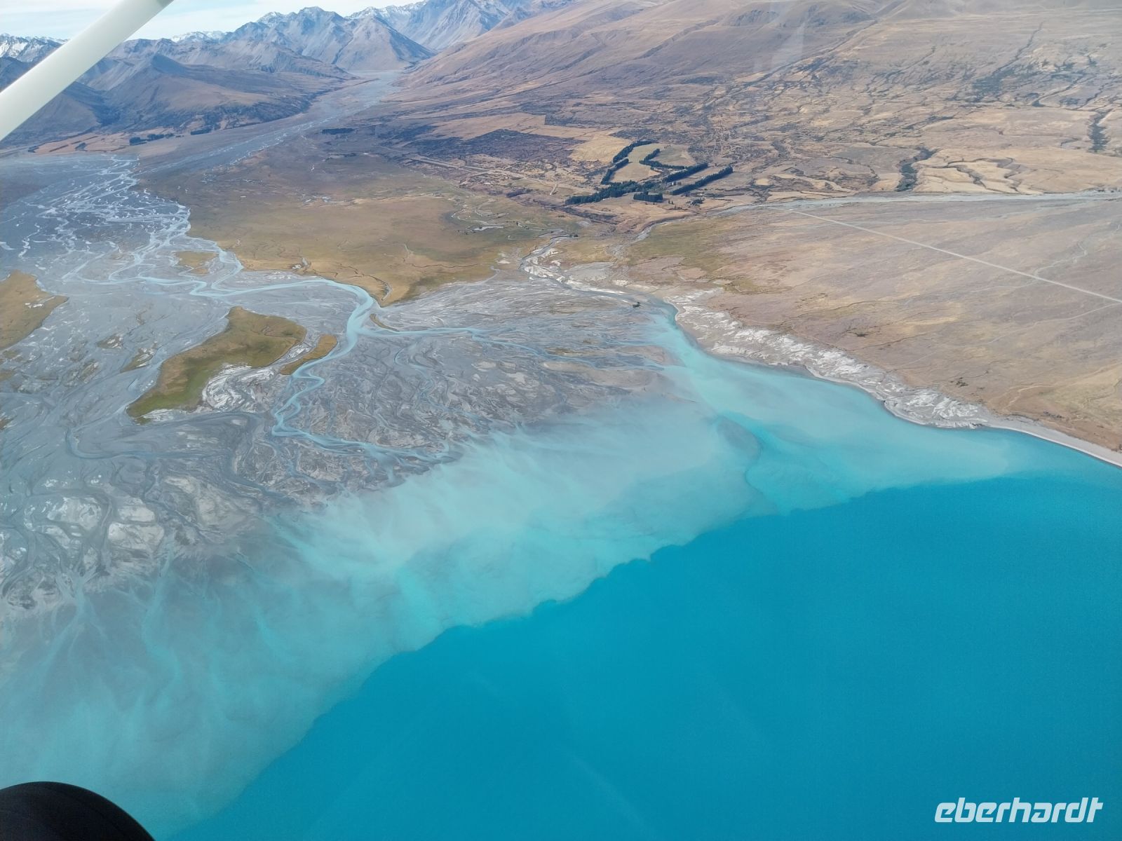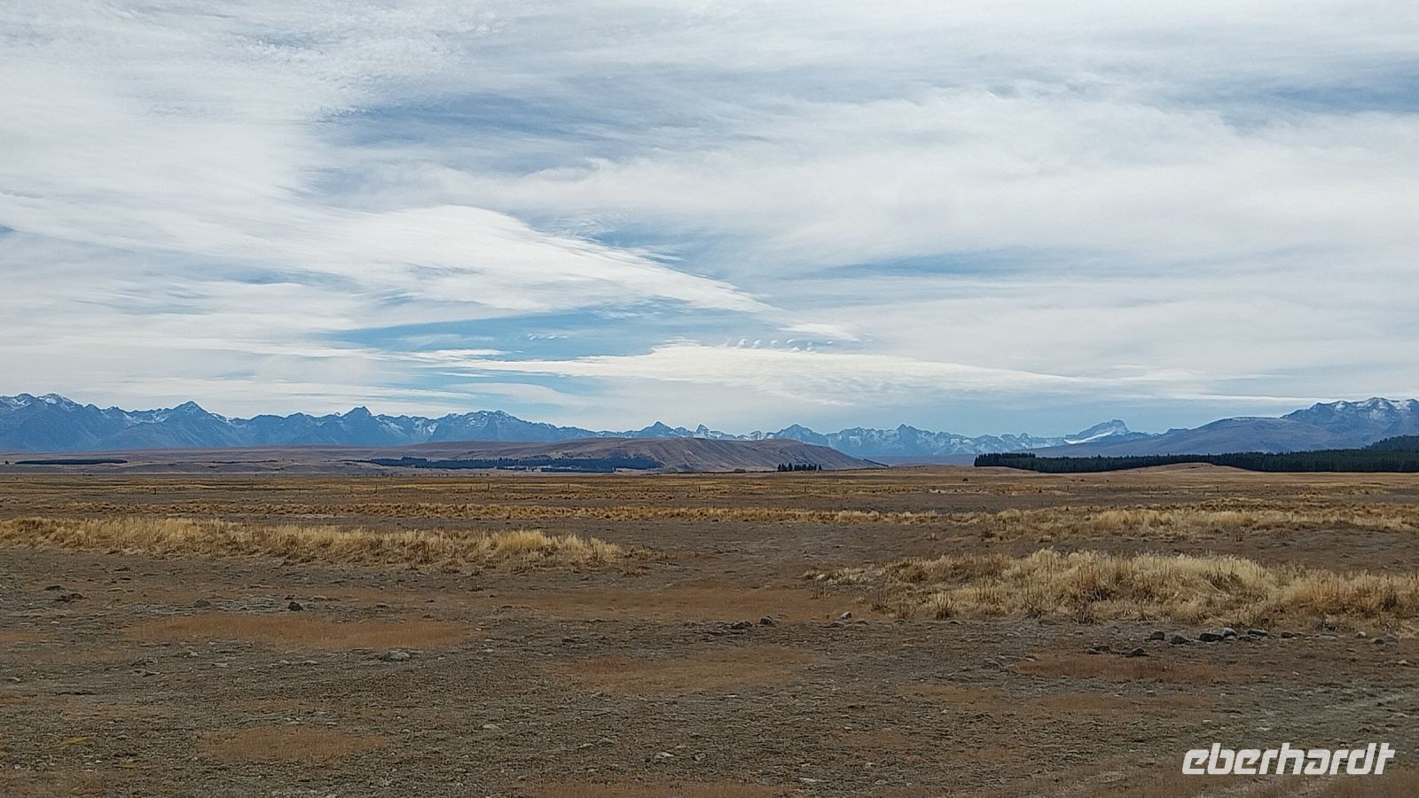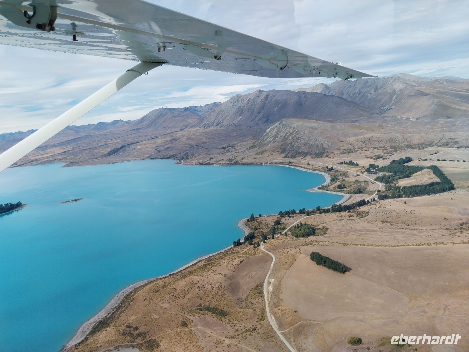 Der Morgen weckte uns mit Sonnenschein und schneebedeckten Bergen. Nach einem Stopp in Amberley, dem Wohnort unseres Reiseleiters, erreichten wir gegen Mittag Christchurch. Bei einer Stadtrundfahrt sahen wir die vielen neu gebauten Häuser, aber auch einige alte, welche beim schweren Erdbeben im Jahr 2012 glücklicherweise nicht zerstört wurden. Auch einige alte Straßenbahnen fuhren durch die Innenstadt. Wir hielten an der ehemaligen Universität und schauten uns die Aula an. In der anschließenden Freizeit erkundeten die meisten Gäste den Botanischen Garten mit seinen riesigen Mammutbäumen, den blühenden Dahlien und dem tollen Rosengarten. In südwestlicher Richtung fuhren wir über riesige, größtenteils trockene Flussbetten und trockener Weiden weiter zum Lake Tekapo. Hier gab es aufgrund des tollen Wetters die Möglichkeit eines Rundflugs über die Neuseeländischen Südalpen.