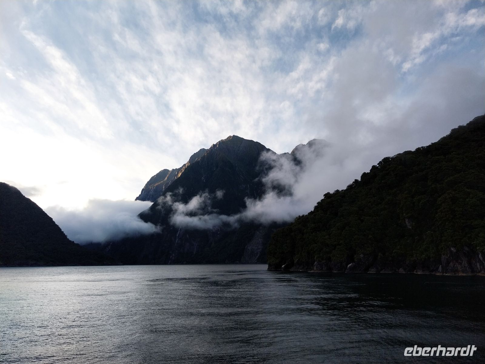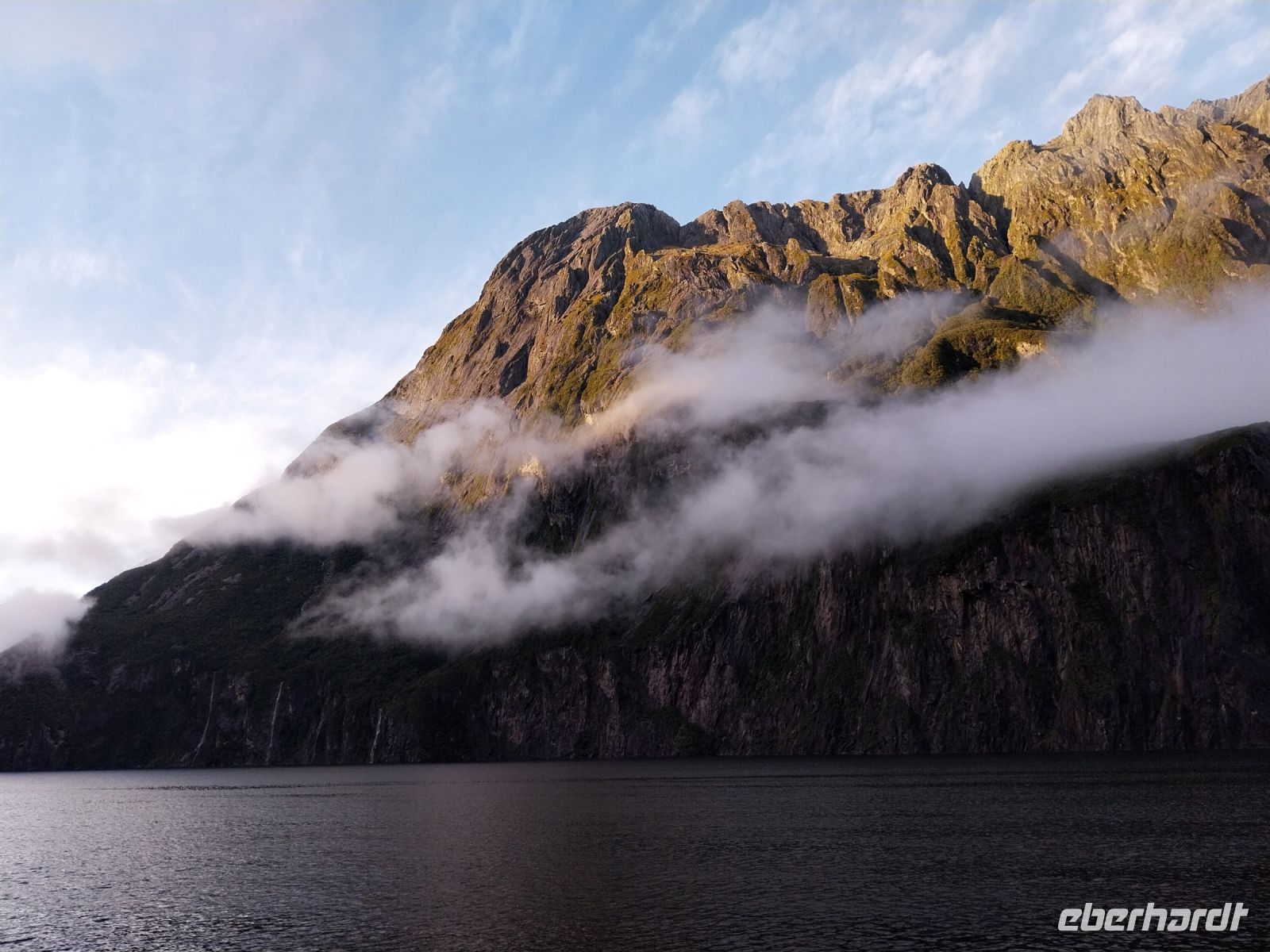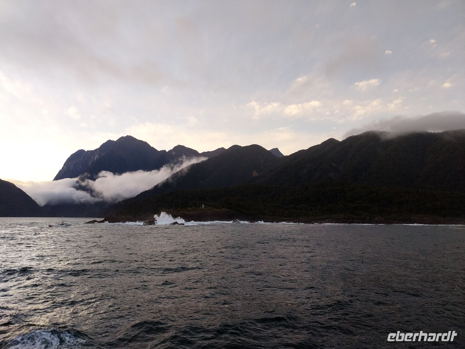Am Morgen fuhren wir von der nächtlichen Ankerbucht zur Tasmanischen See. Nebel, niedrighängende Wolken und die hervorkommende Sonne ergaben tolle Aussichten und Fotomotive. Zahlreiche Wasserfälle und Kaskaden stürzten von den steilen Berghängen herab.