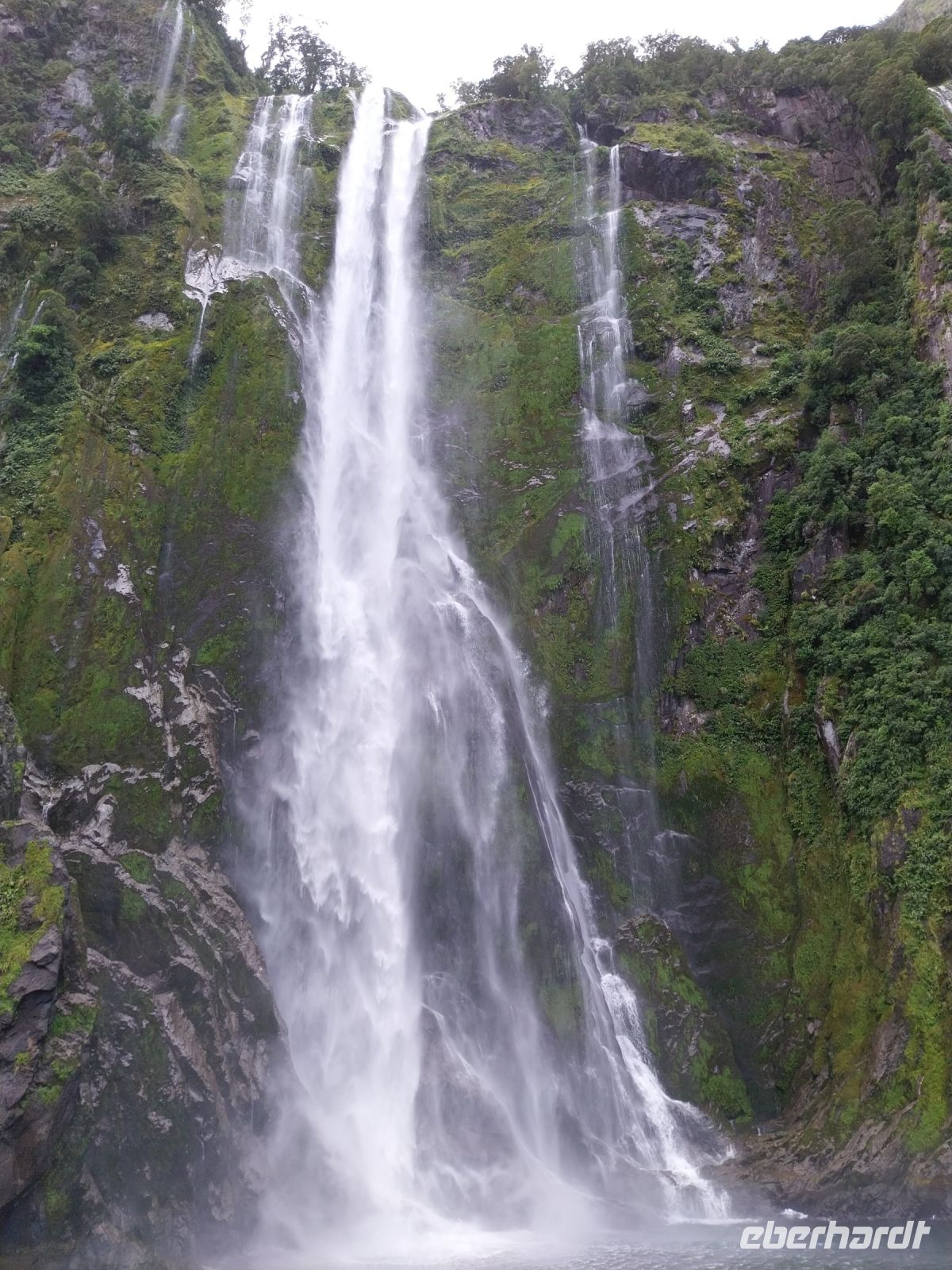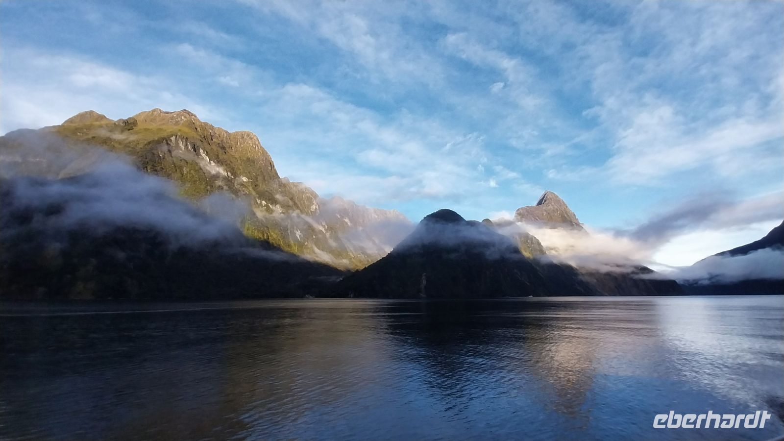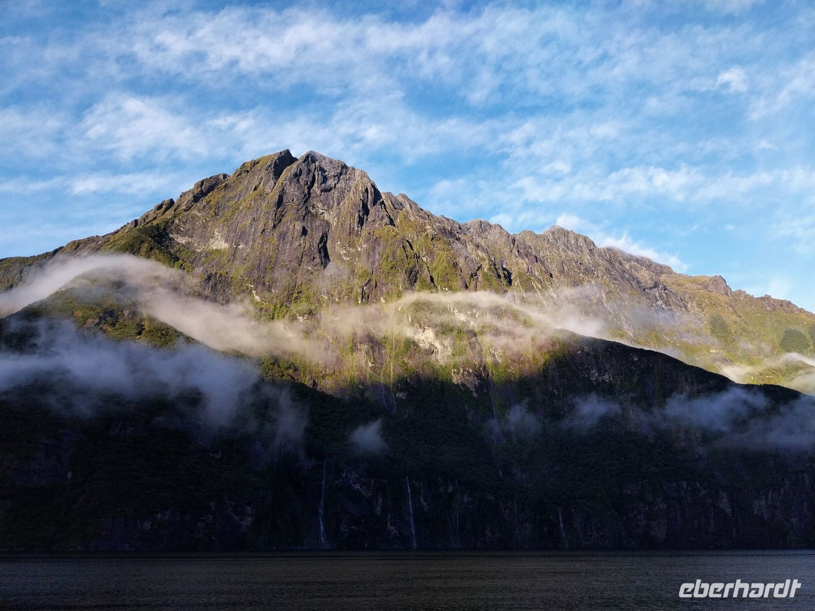 Am Morgen fuhren wir von der nächtlichen Ankerbucht zur Tasmanischen See. Nebel, niedrighängende Wolken und die hervorkommende Sonne ergaben tolle Aussichten und Fotomotive. Zahlreiche Wasserfälle und Kaskaden stürzten von den steilen Berghängen herab.