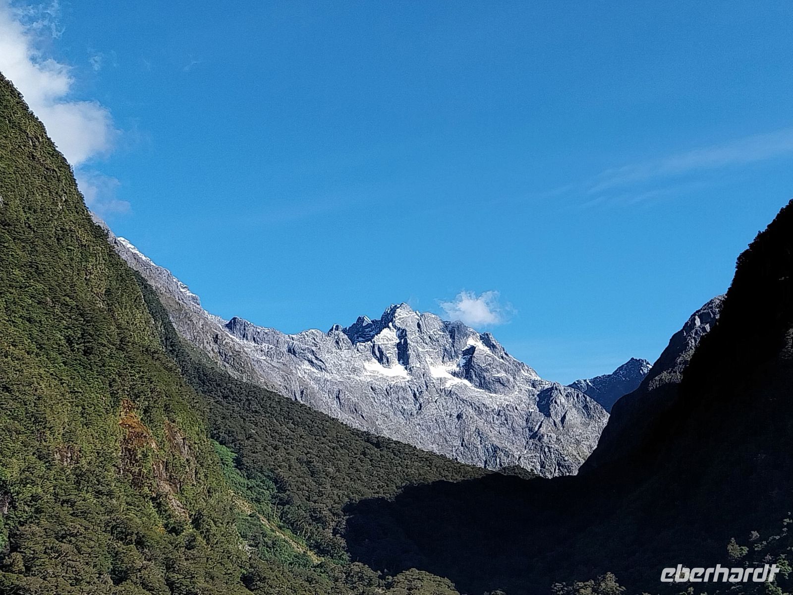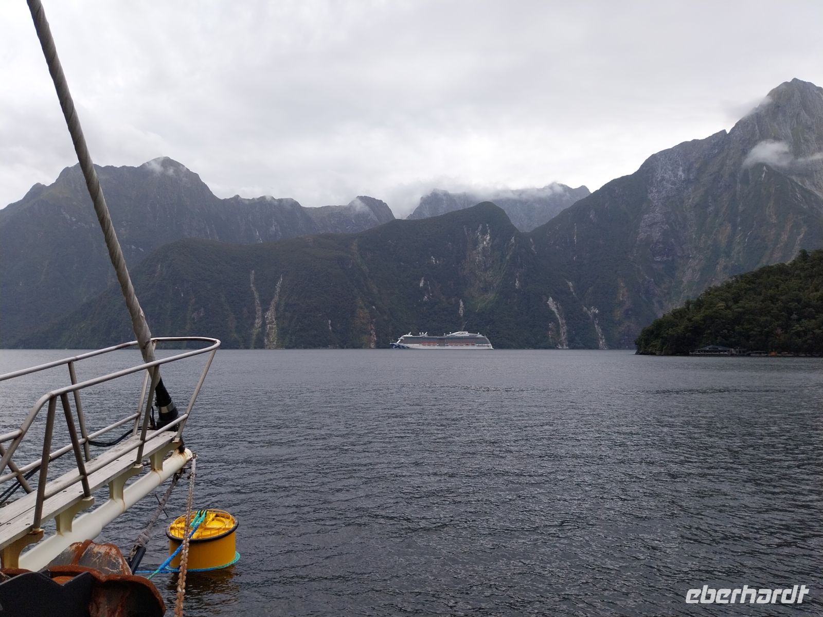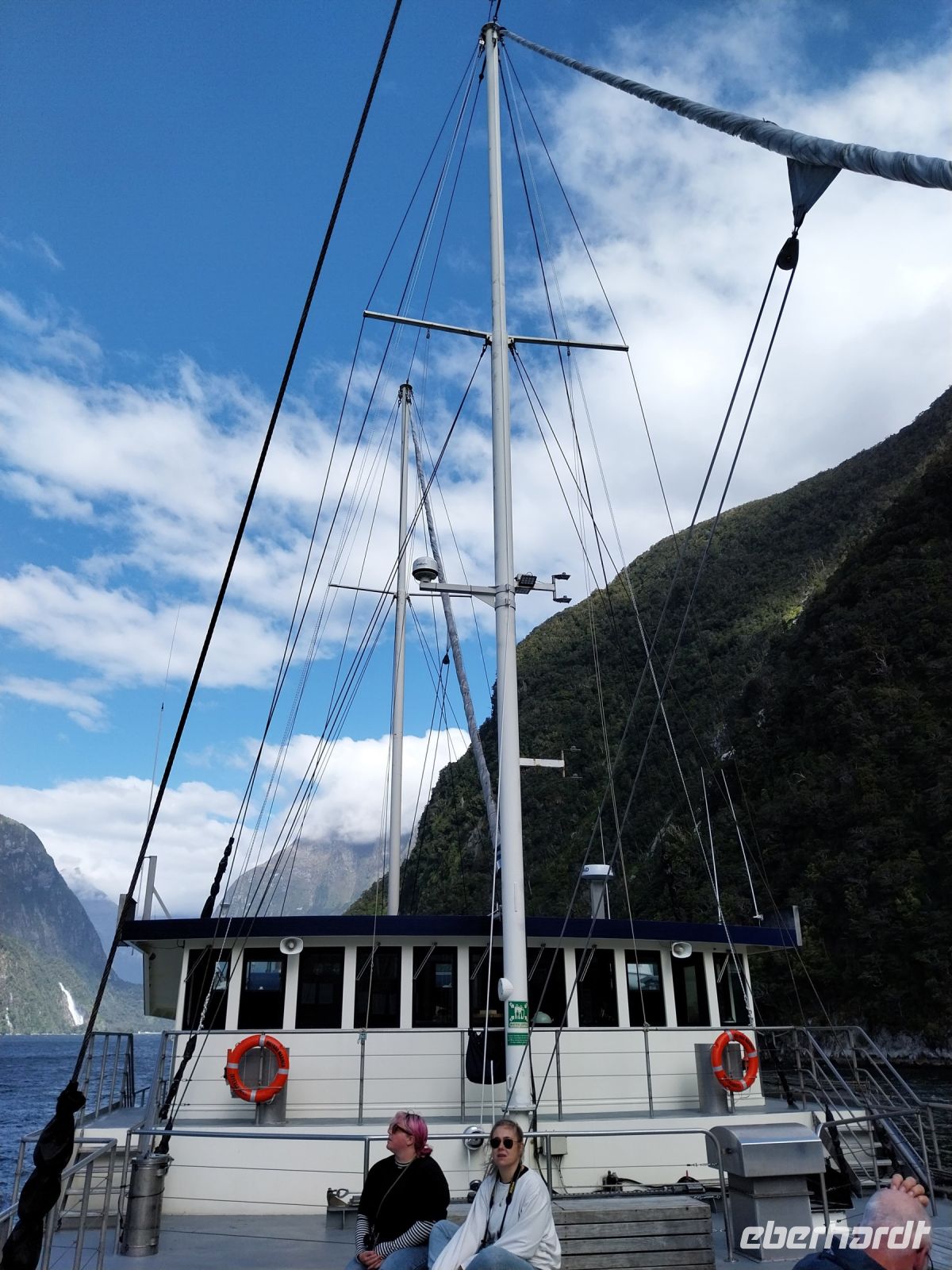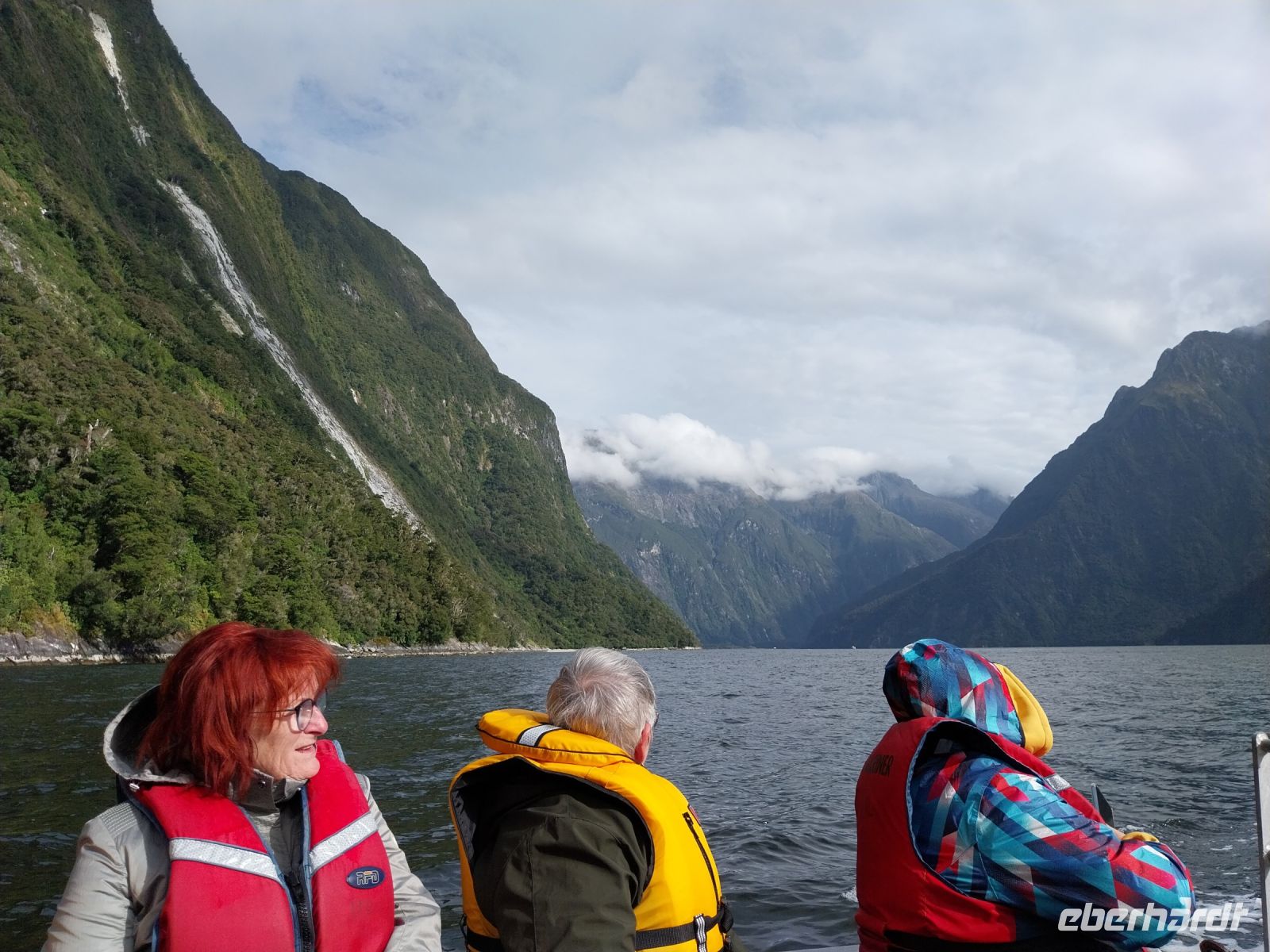 Pünktlich erreichten wir den Milford Sound und checkten auf unser Boot, der Milford Mariner, ein und genossen den Blick auf die hohen, teils schneebedeckten Berge und die zahlreichen Wasserfälle.