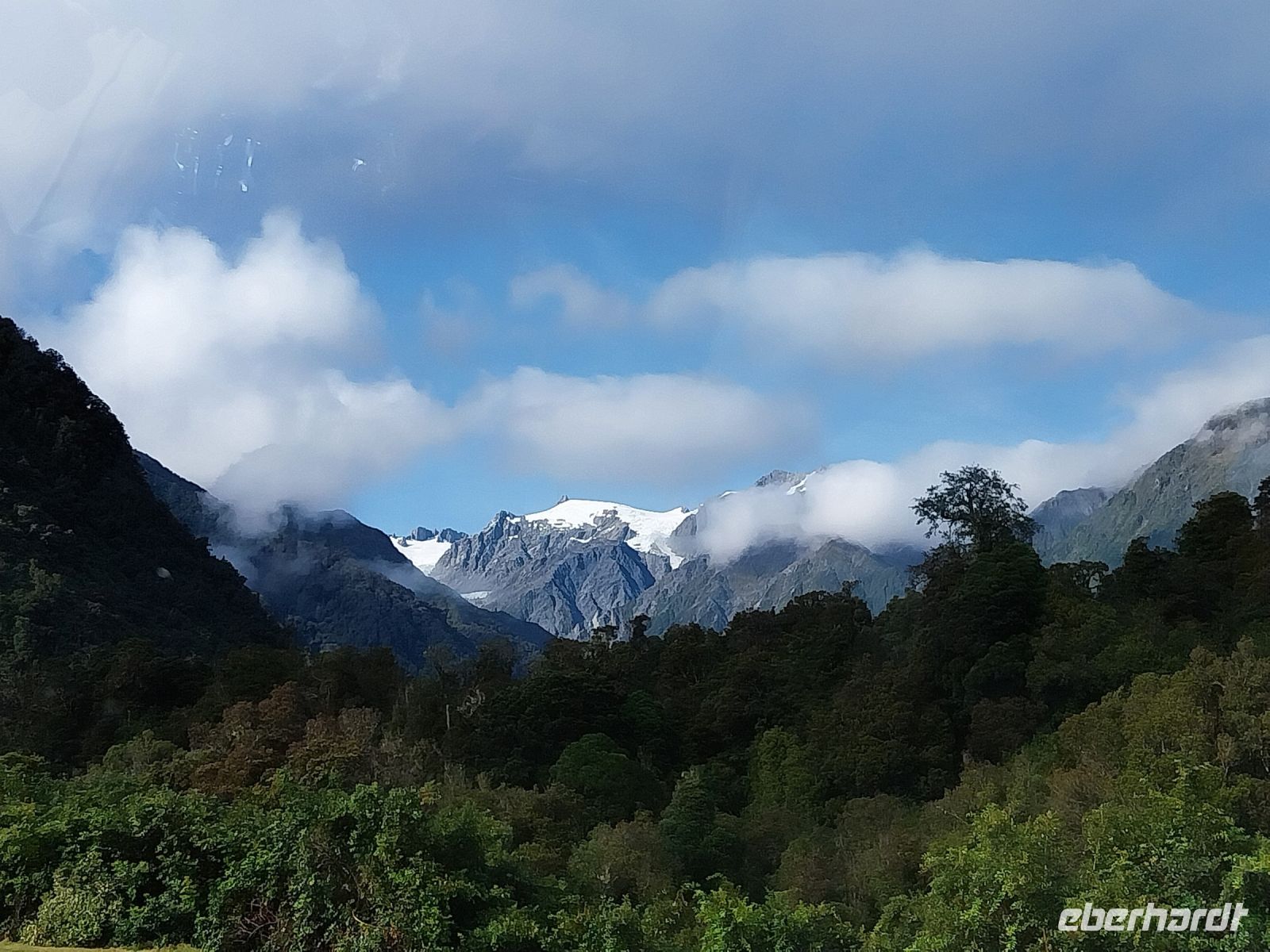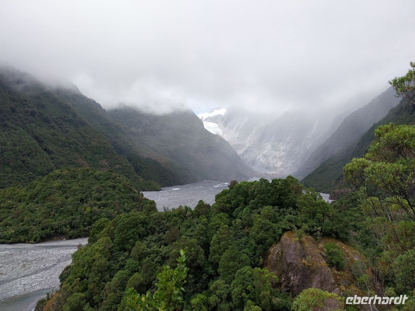 Als wir alle, auch die ursprünglichen Nichtflieger eingesammelt hatten, fuhren wir entlang des Waiho-Flusses durchs Tal um den Franz-Josef-Gletscher zumindest noch etwas näher zu sehen. Nach einem kurzen Aufstieg hatten wir eine tolle Aussicht auf den noch wolkenlosen unteren Gletscherabschnitt.