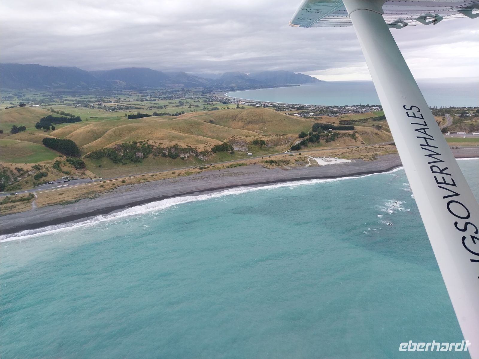 Unser neuer Reiseleter Roger erwartete uns bereits und gemeinsam fuhren wir durch die sehr trockene Landschaft mit Weideland, Weinanbaugebieten und Salinen zur Salzproduktion nach Kaikoura. Unterwegs sahen wir noch Seebären und erreichten schließlich den Flugplatz des kleinen Ortes, wo wir zu sechst einen Rundflug unternahmen und aus der Luft einige Blauwale erblicken konnten.
