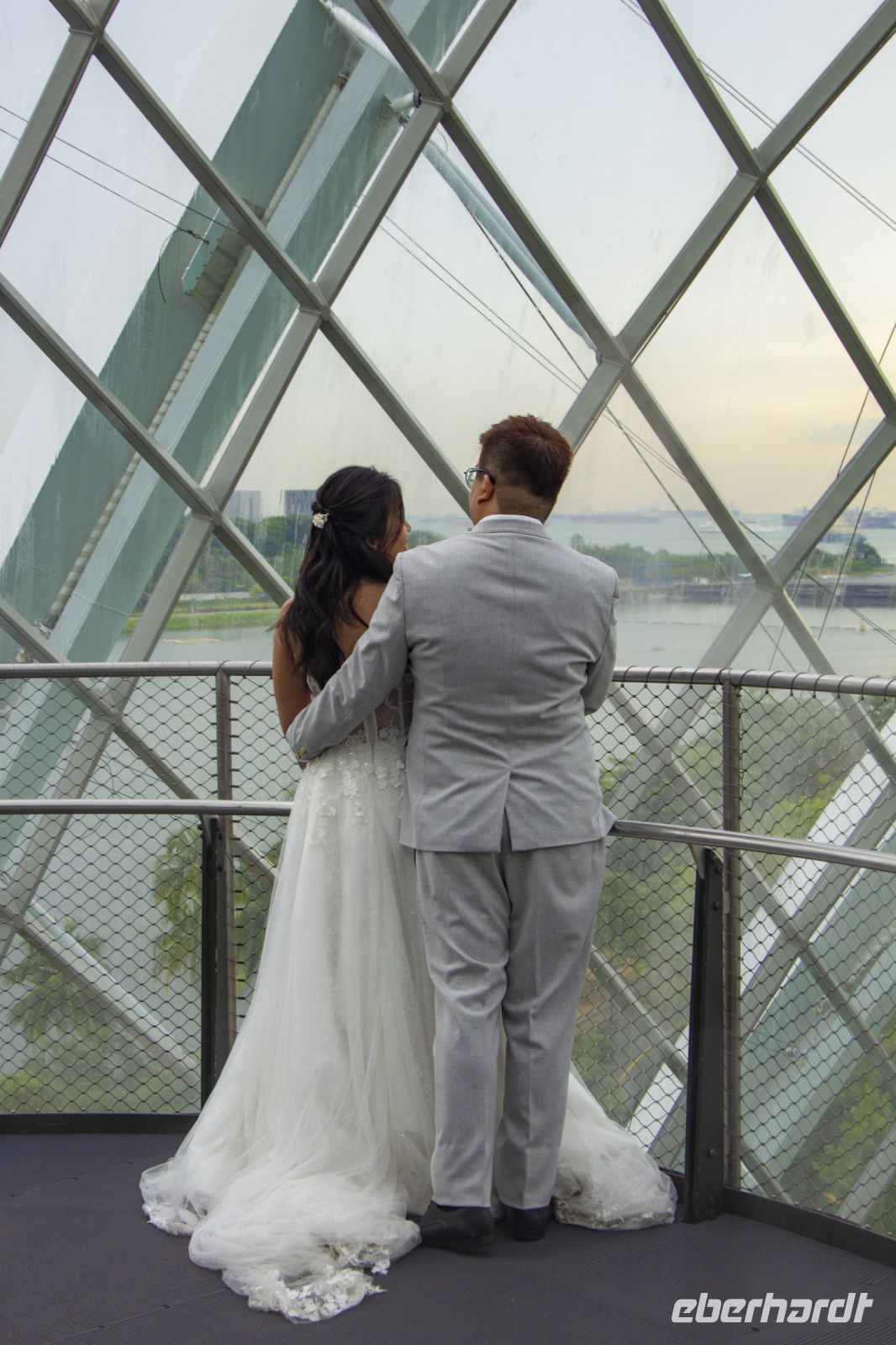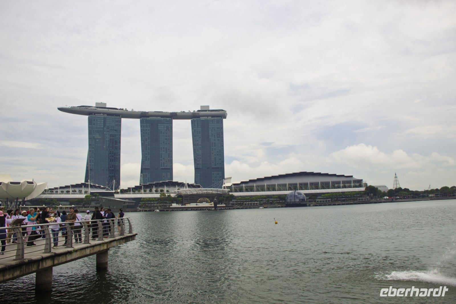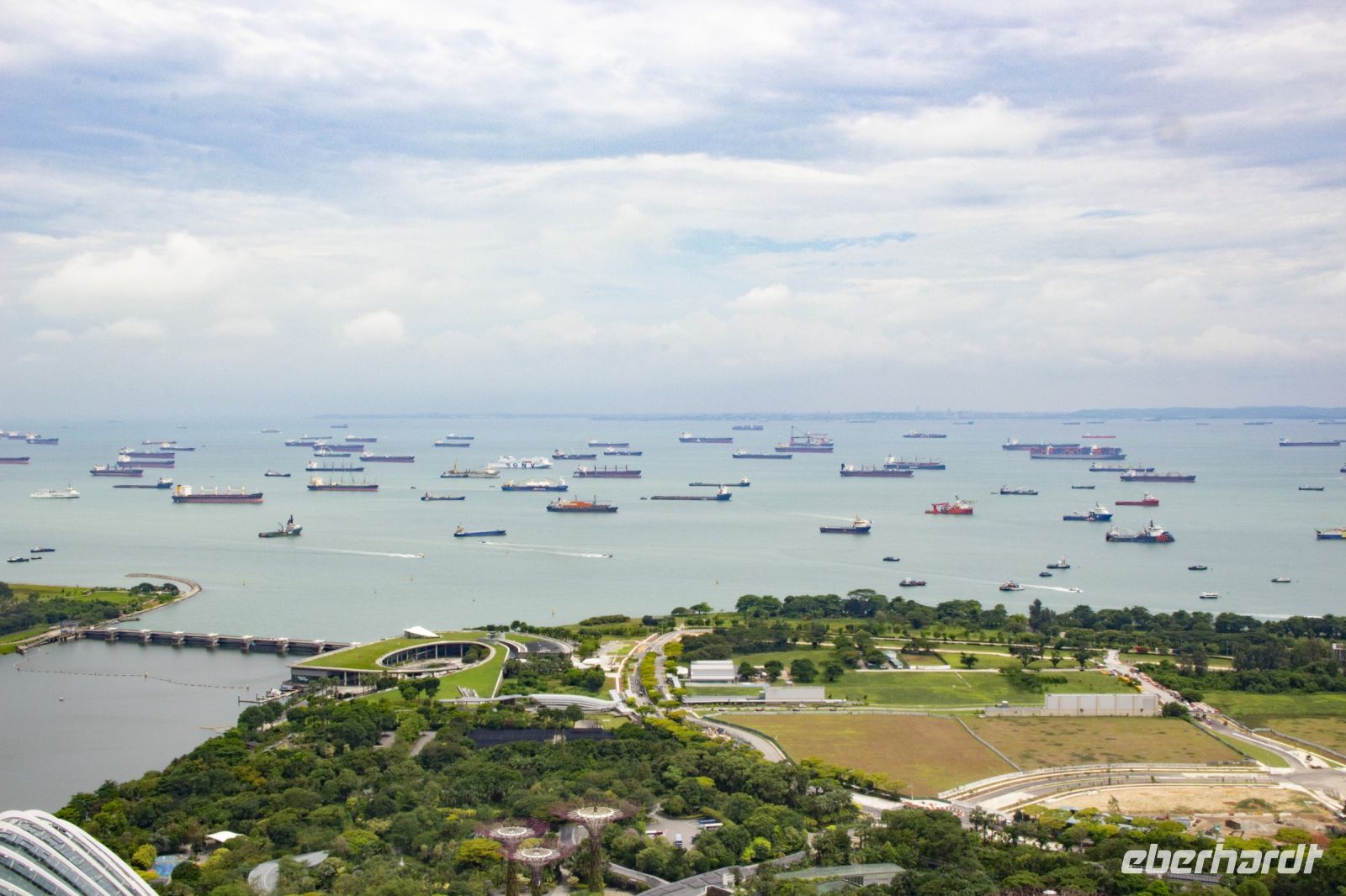 Unser nächstes Ziel ist das Marina Bay Sands. Wir betreten das berühmte Hotel, dessen spektakulärer SkyPark die Skyline der Stadt dominiert, und fahren mit dem Fahrstuhl in die 56. Etage. Von der Aussichtsplattform genießen wir einen atemberaubenden Panoramablick über die gesamte Stadt. Zum Glück bleibt das Wetter stabil, und wir können die Aussicht in vollen Zügen genießen.