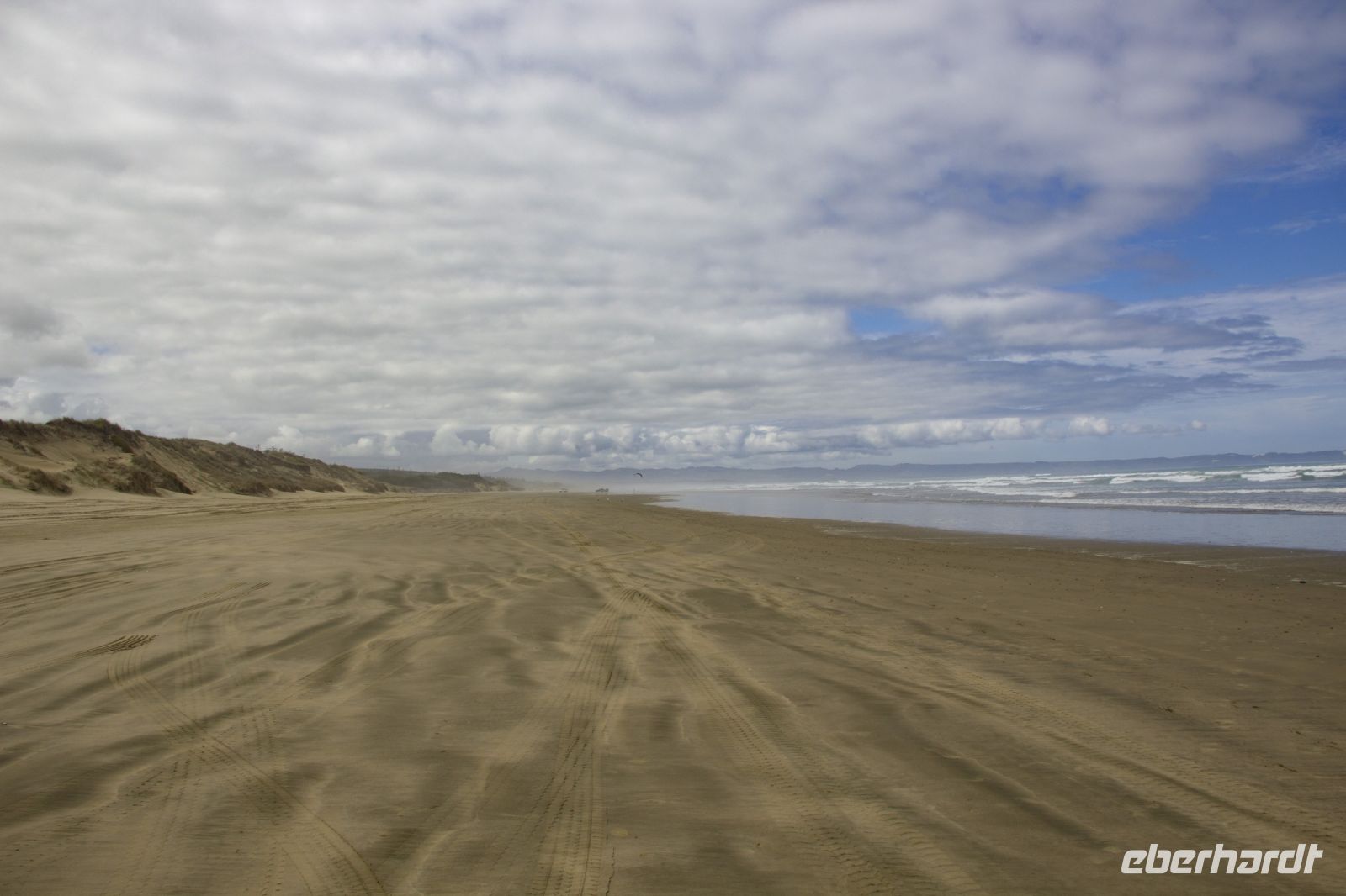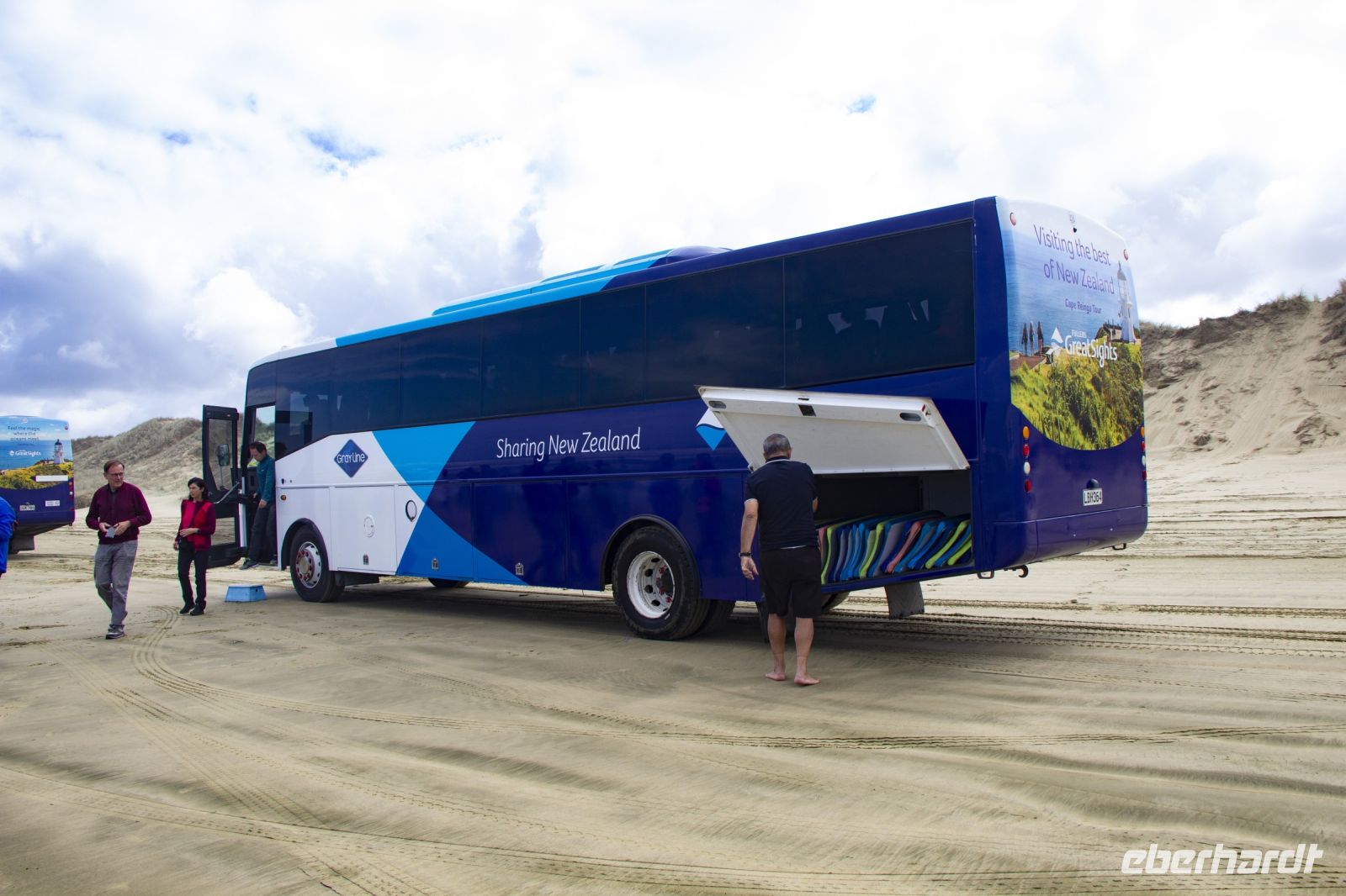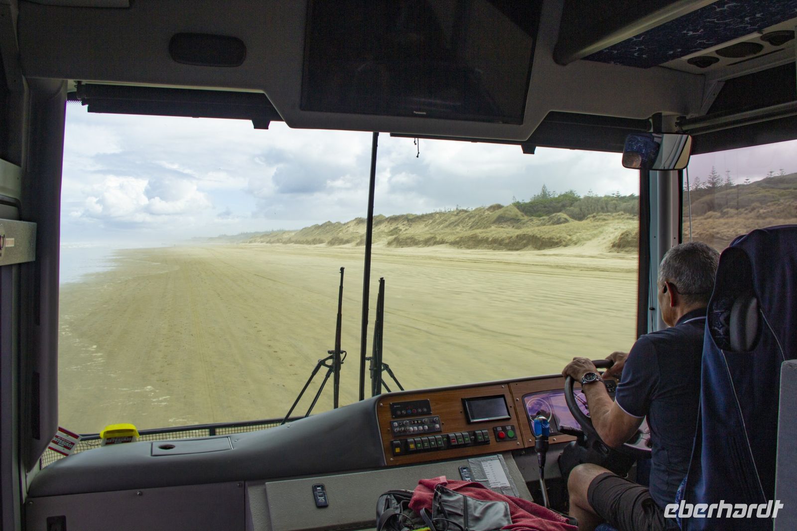 Ein Highlight des Tages ist der Besuch des 90 Mile Beach, einem scheinbar endlosen Sandstrand. Obwohl der Strand keine 90 Meilen lang ist, überwältigt uns seine Weite und natürliche Schönheit. Mit dem Bus fahren wir direkt auf dem festen Sand entlang der fast menschenleeren Küste – ein außergewöhnliches Erlebnis. Während eines Stopps können wir die Füße ins Wasser tauchen oder die riesigen Sanddünen erklimmen, um beim Sandboarding den Adrenalinkick zu erleben.