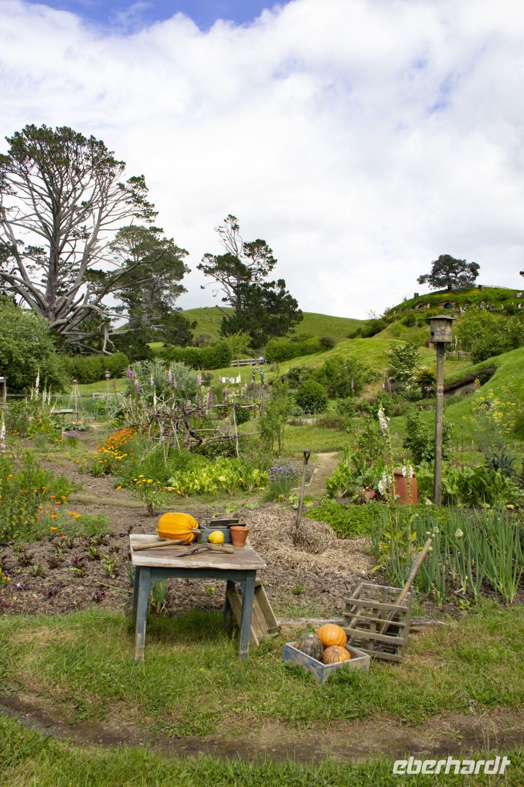 Unsere Führung durch Hobbiton beginnt in der liebevoll gestalteten Außenanlage. Unser örtlicher Reiseleiter, passenderweise „Sam“ genannt, führt uns mit Begeisterung und großem Wissen durch das Set. Neben den vielen Details, die wir direkt sehen können – wie die perfekt runden Hobbit-Türen und die üppigen Gärten –, gibt er uns auch spannende Einblicke in die Dreharbeiten und die Entstehung dieses einzigartigen Ortes. Wir spazieren durch die malerische Umgebung, machen zahlreiche Fotos und tauchen dabei tief in die Welt Tolkiens ein.