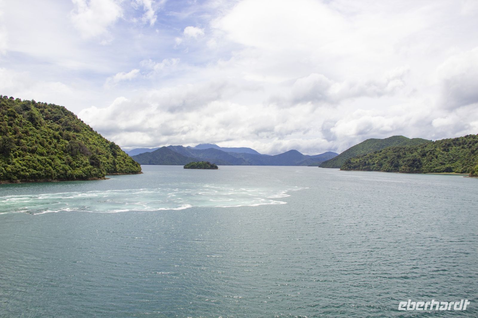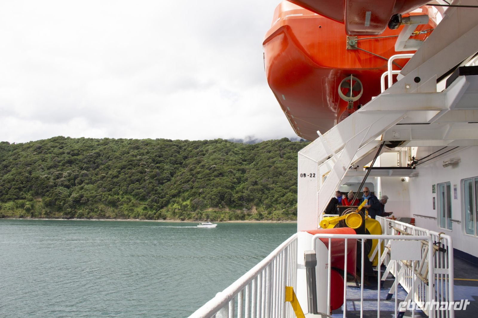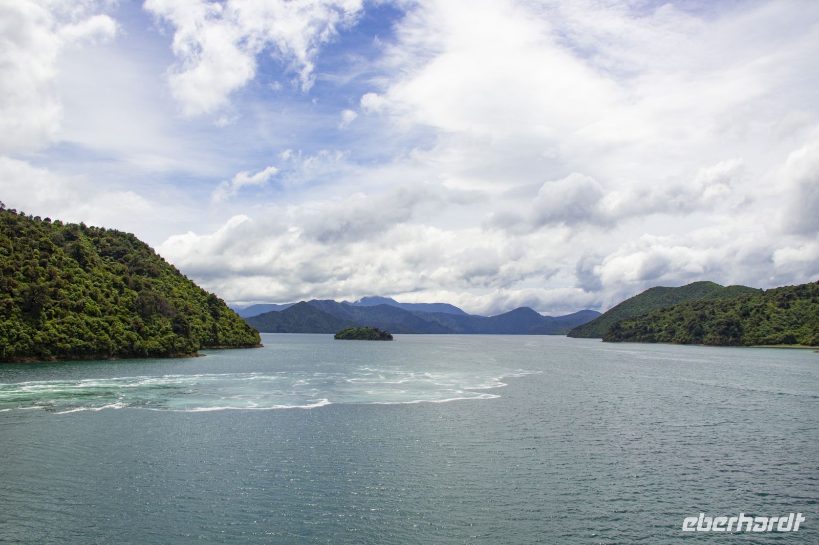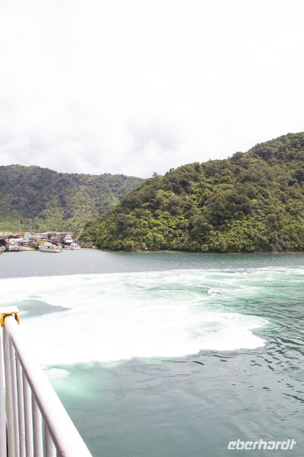 Heute starten wir früh in den Tag, denn wir wollen auf die Südinsel übersetzen. Mit dem Bus fahren wir zum Fährhafen in Wellington, um die Überfahrt zu beginnen. Die Bedingungen sind ideal: Das Wetter ist sonnig, das Wasser ruhig, und die Landschaft präsentiert sich von ihrer schönsten Seite. Vom Außenbereich der Fähre haben wir einen fantastischen Blick auf die tiefblaue Farbe des Wassers und die malerischen Küstenlinien.