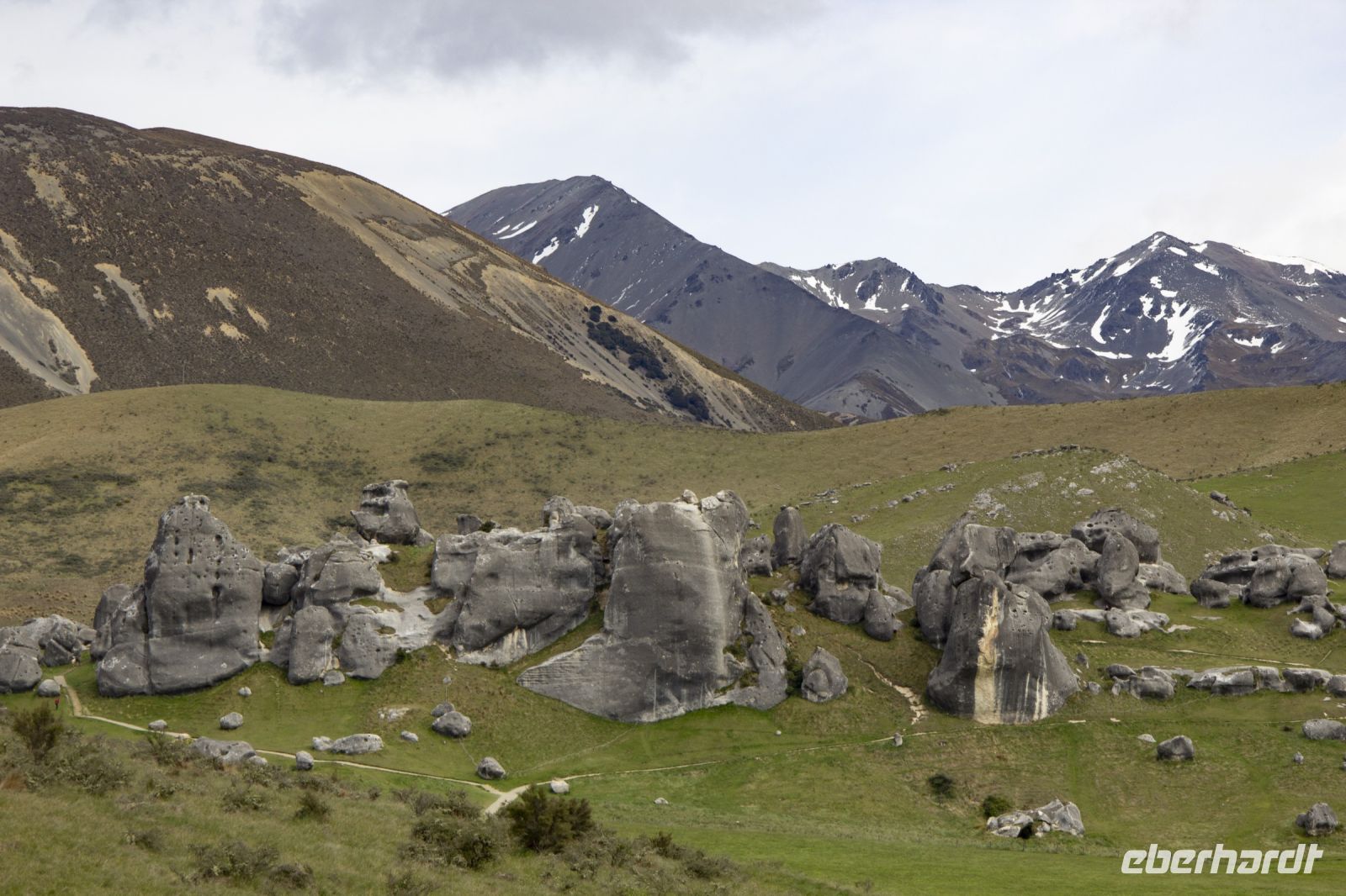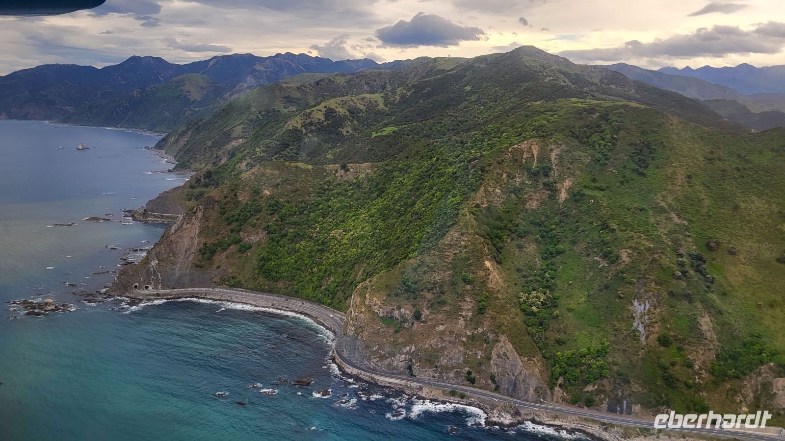 Auf der Weiterfahrt sehen wir einige interessante Neuerungen entlang der Straße. Da Neuseelands Straßen häufig von Überschwemmungen und Erdrutschen betroffen sind, wurden an besonders gefährdeten Stellen schützende Überhänge konstruiert. Diese Bauwerke sorgen für mehr Sicherheit und schützen die Straßen vor herabfallenden Geröllmassen.