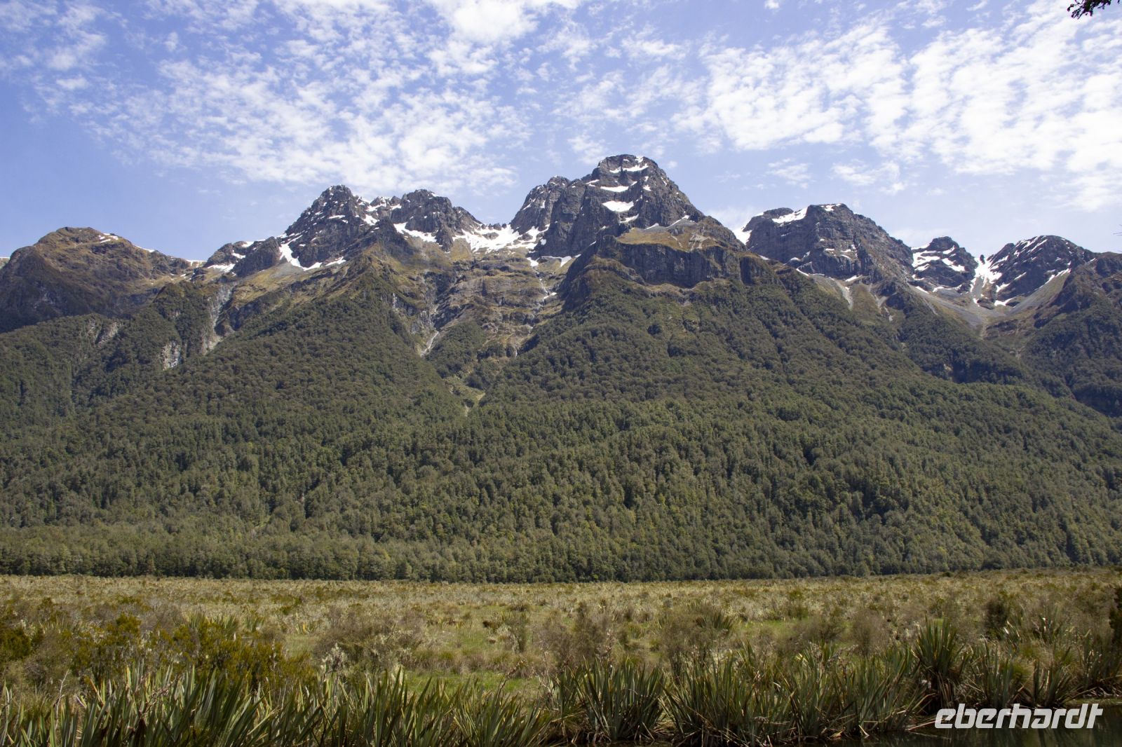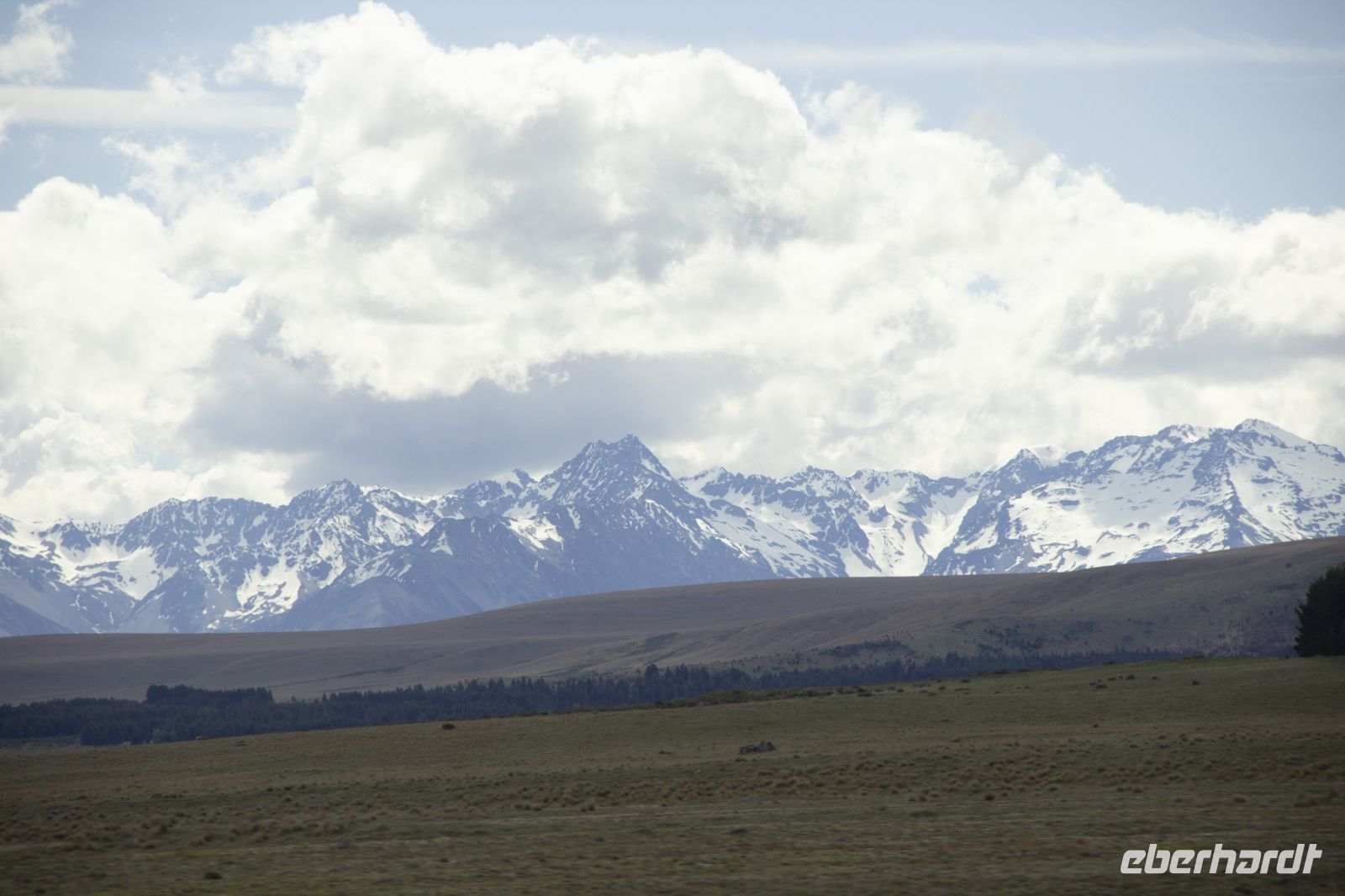 Nach einer Weile lichtet sich die Wolkendecke, und vor uns erheben sich die majestätischen Neuseeländischen Alpen. Die schneebedeckten Gipfel der Bergkette bieten ein beeindruckendes Panorama, das uns alle in seinen Bann zieht. Die Landschaft wirkt beinahe surreal in ihrer Schönheit.