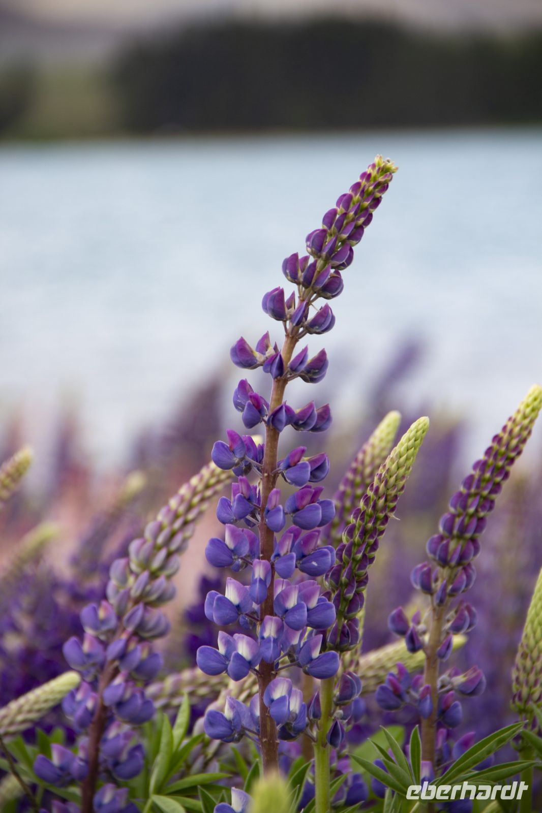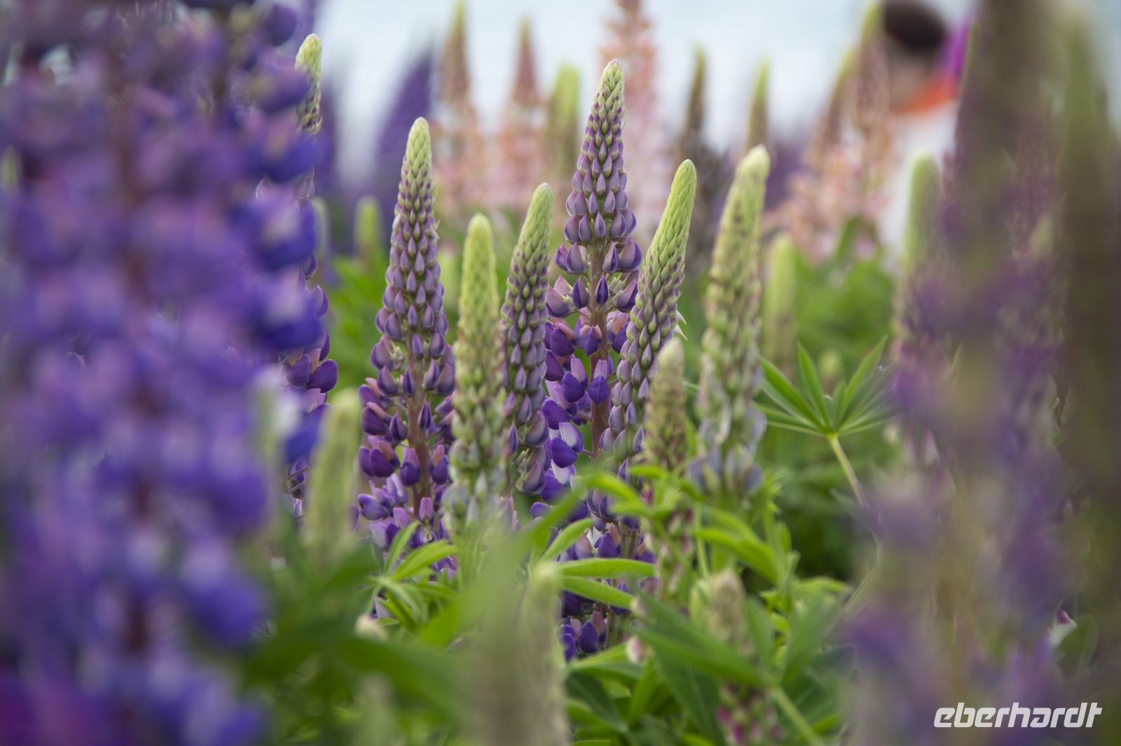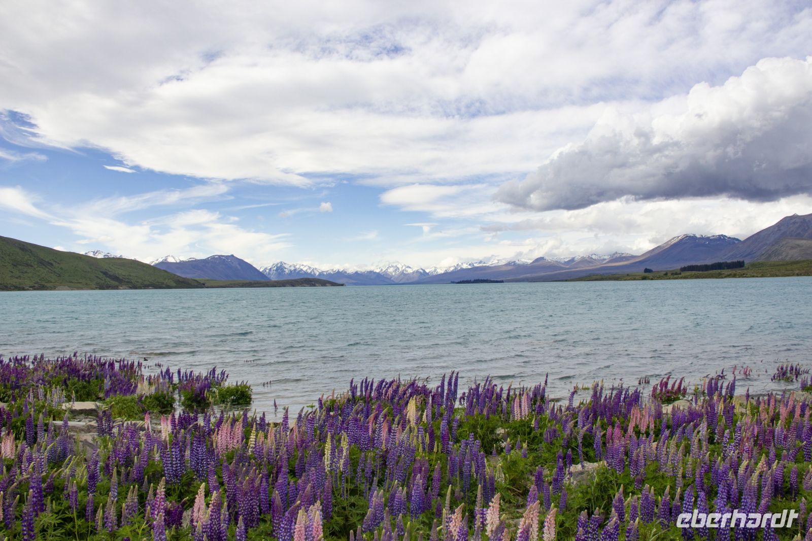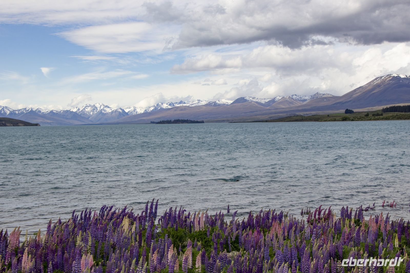 Am Lake Tekapo angekommen, halten wir an der berühmten Kirche des guten Hirten. Diese kleine, charmante Steinkirche liegt auf einer Anhöhe direkt am Ufer des Sees und ist eines der beliebtesten Fotomotive Neuseelands. Ihre Fenster bieten einen perfekten Blick auf den türkisfarbenen See und die dahinterliegenden Berge. Doch fast noch beeindruckender als die Kirche selbst ist das weite Feld aus bunt blühenden Lupinen, das sich bis zum Wasser erstreckt und der Landschaft eine lebendige Farbpalette verleiht. Als die Sonne schließlich wieder durchbricht, schimmert das Wasser des Sees in einem sanften Türkis – ein Anblick, den wir so schnell nicht vergessen werden.