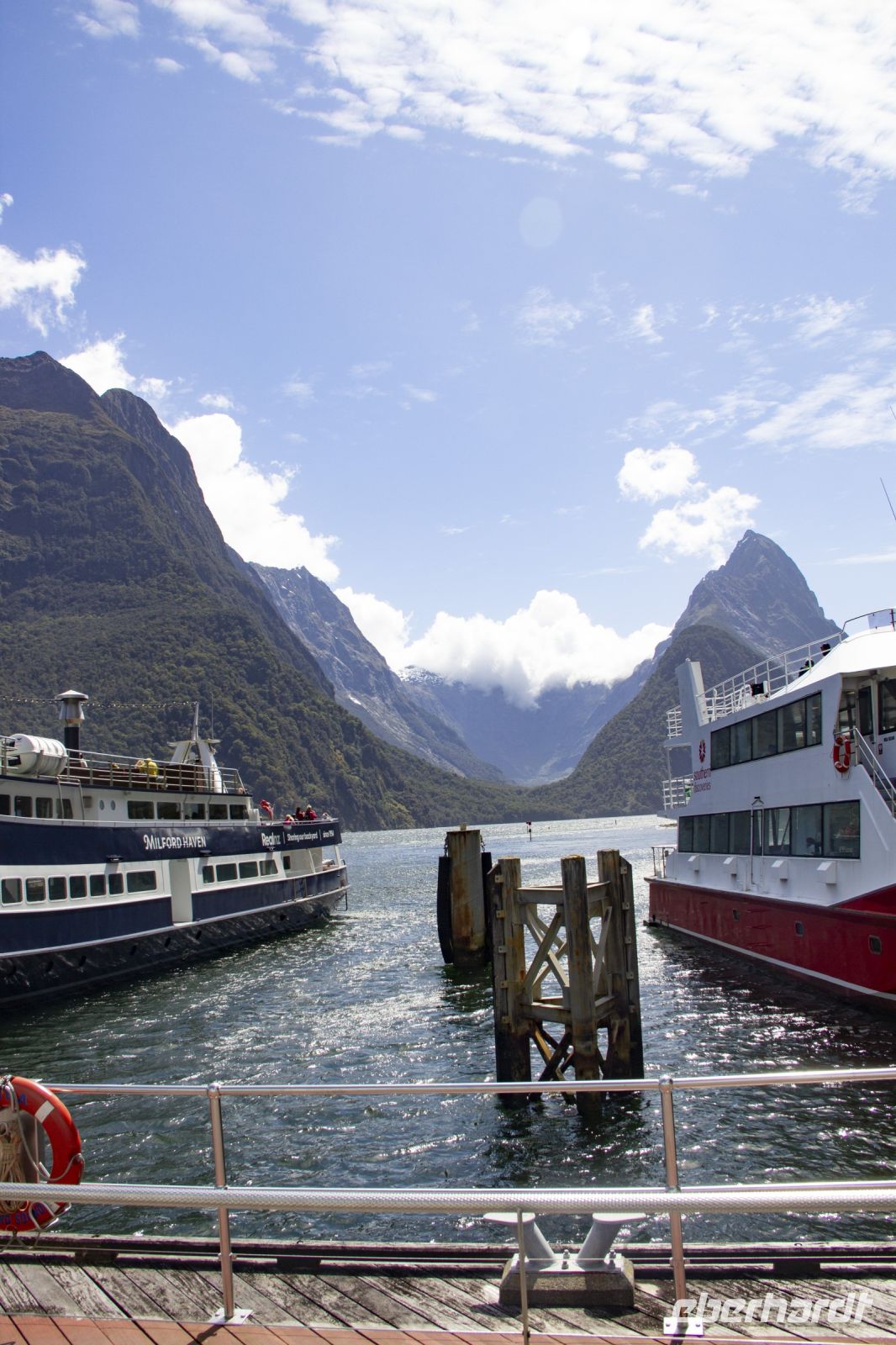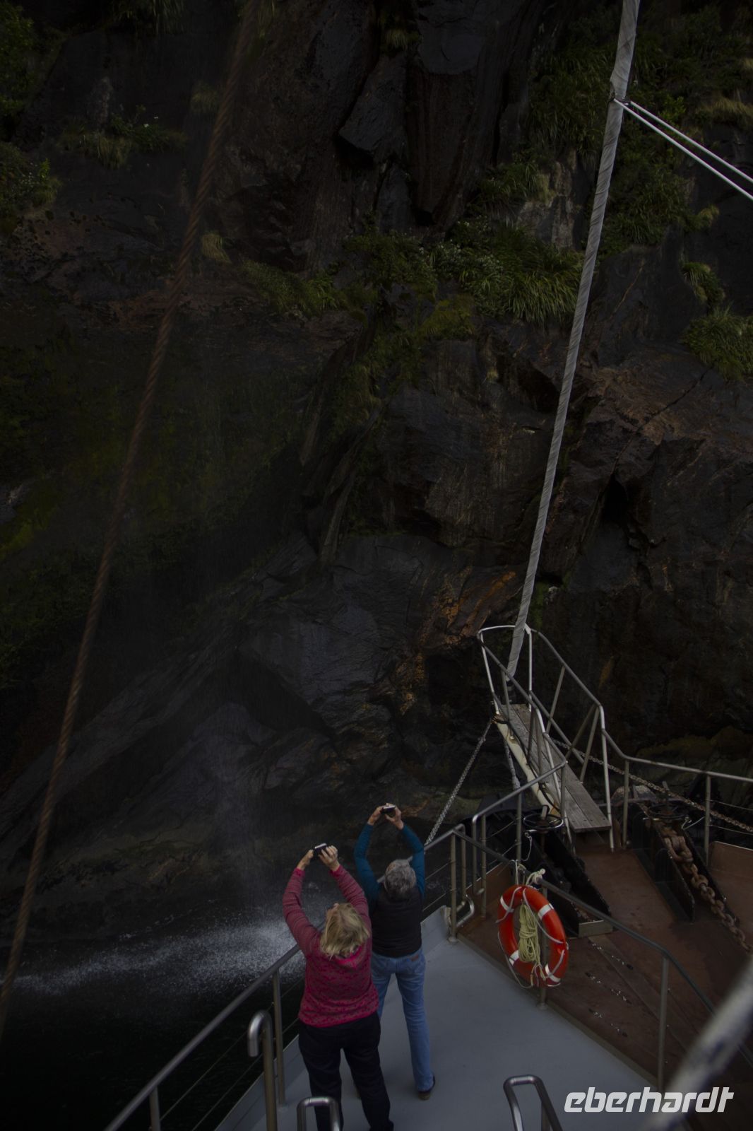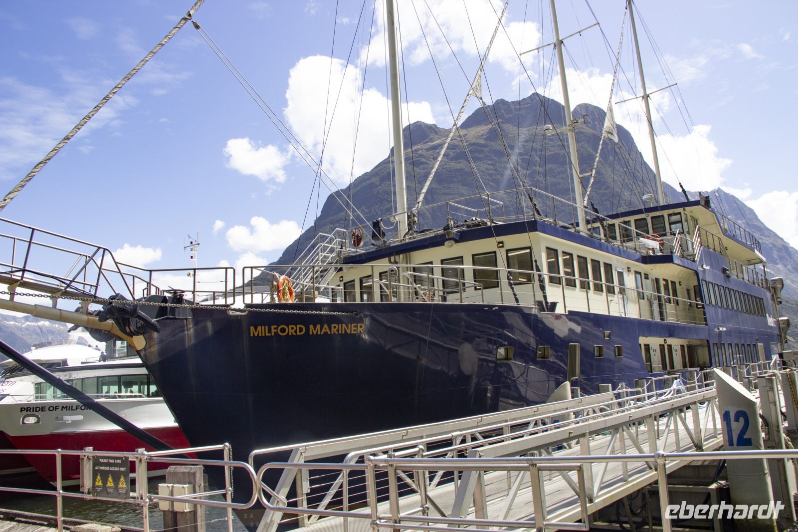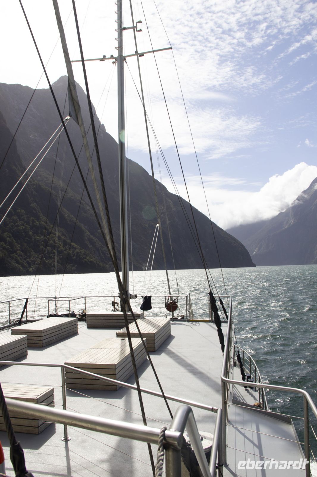 Auf der anderen Seite angekommen, ist es nicht mehr weit bis zur Anlegestelle für unsere heutige Schifffahrt. Am Fährterminal lassen wir den Bus stehen, erhalten unsere Bordkarten und betreten die Milford Mariner, ein wunderschönes Segelschiff mit einer 10-köpfigen Besatzung. Zunächst erfolgt eine Sicherheitseinweisung, und kurz darauf heißt es: Leinen los! Wir beziehen unsere Kabinen, halten uns jedoch kaum dort auf, denn der obere Bereich des Schiffes lockt mit einer atemberaubenden Aussicht auf den Milford Sound.