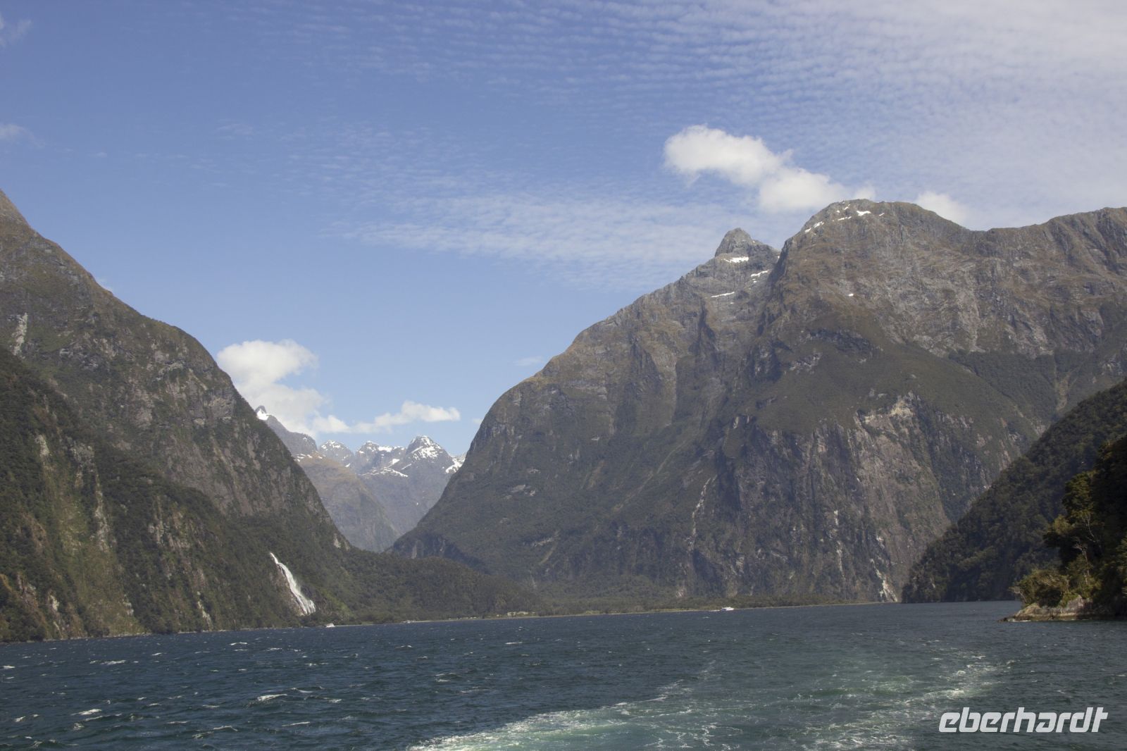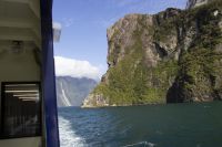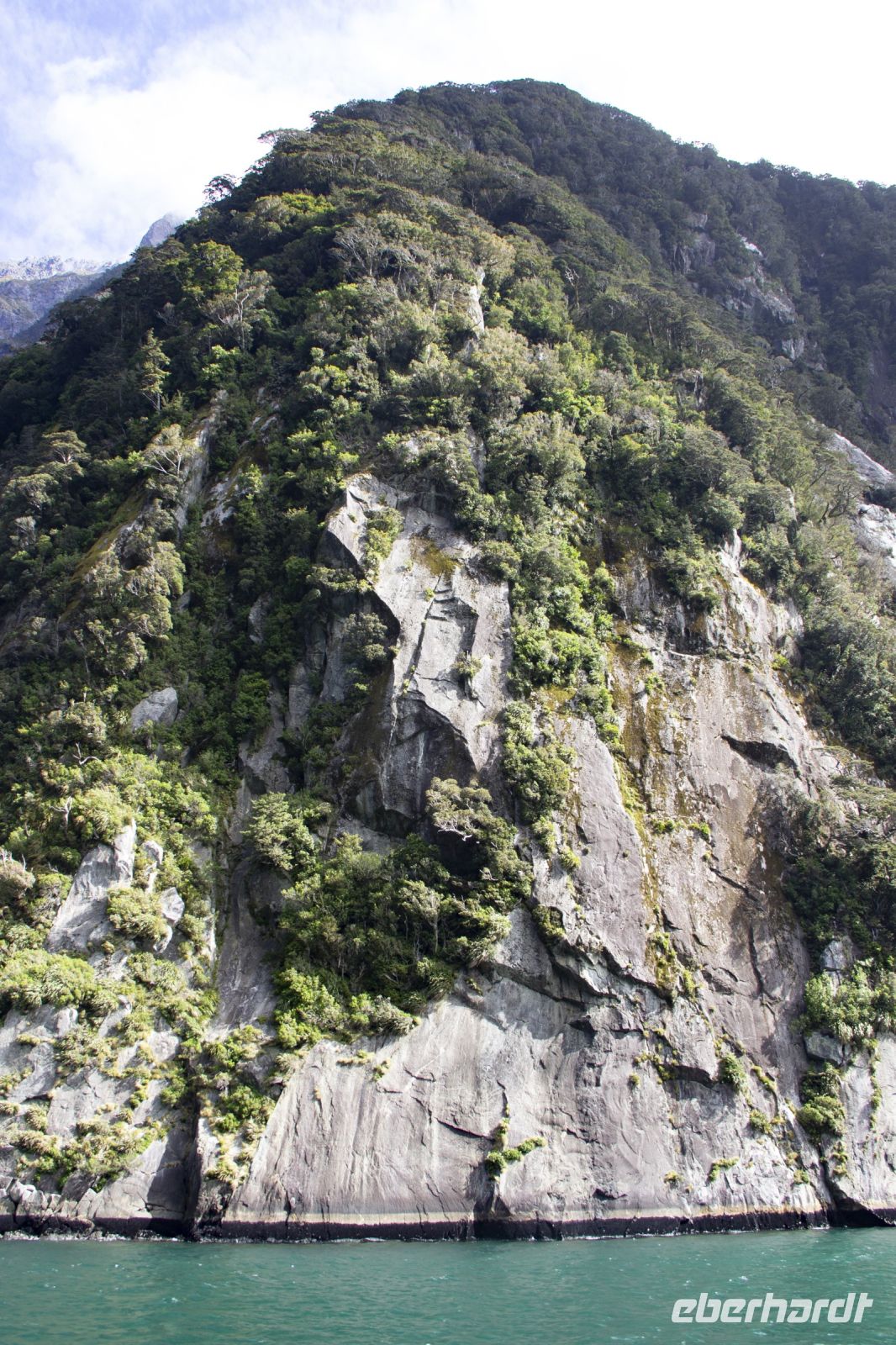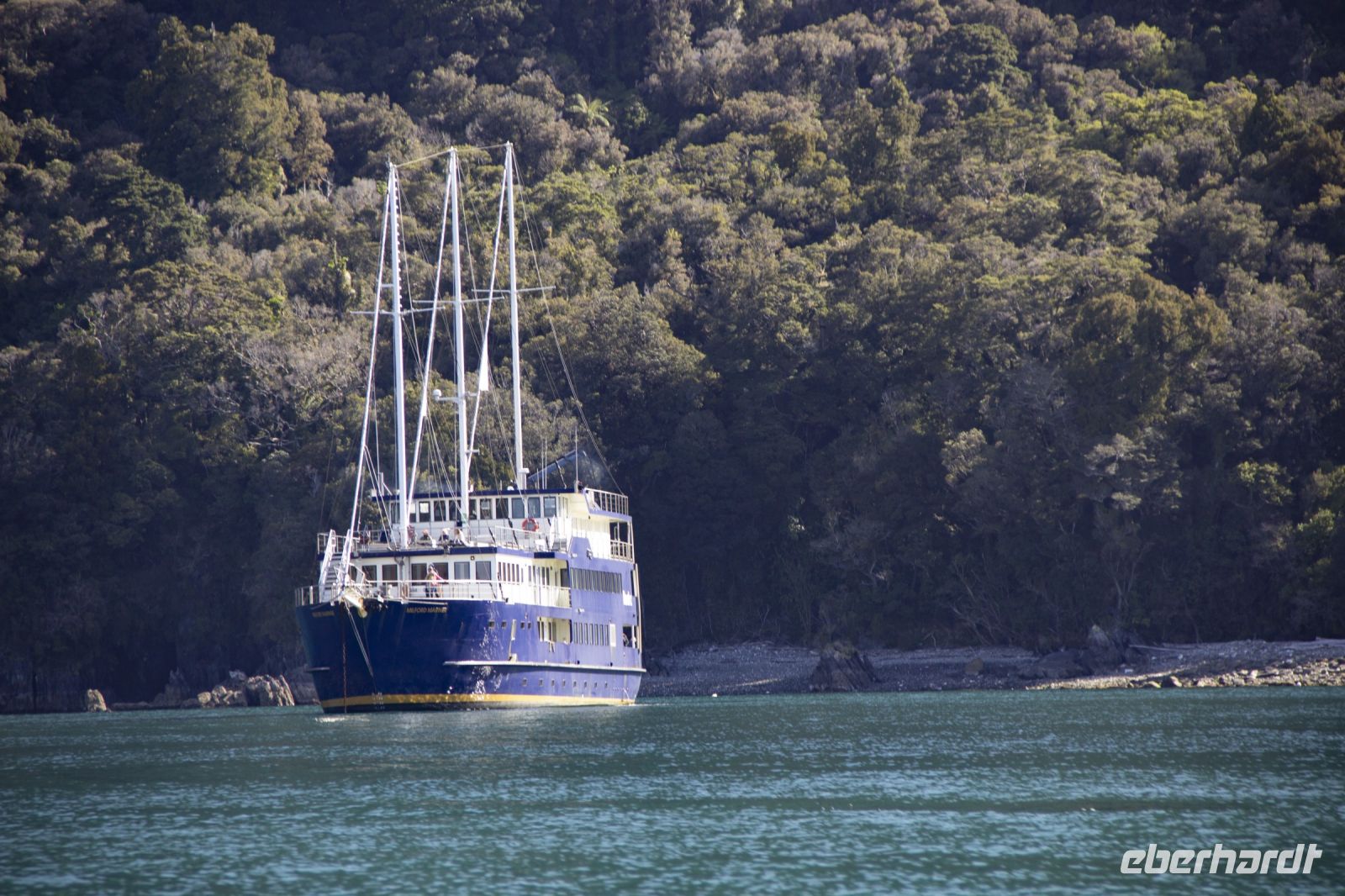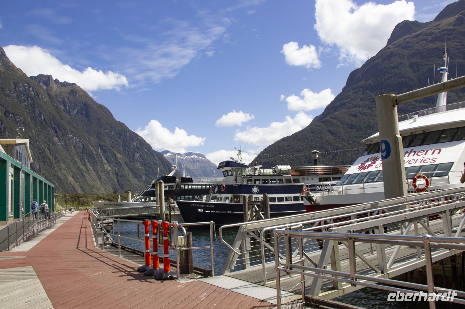 Auf der anderen Seite angekommen, ist es nicht mehr weit bis zur Anlegestelle für unsere heutige Schifffahrt. Am Fährterminal lassen wir den Bus stehen, erhalten unsere Bordkarten und betreten die Milford Mariner, ein wunderschönes Segelschiff mit einer 10-köpfigen Besatzung. Zunächst erfolgt eine Sicherheitseinweisung, und kurz darauf heißt es: Leinen los! Wir beziehen unsere Kabinen, halten uns jedoch kaum dort auf, denn der obere Bereich des Schiffes lockt mit einer atemberaubenden Aussicht auf den Milford Sound.