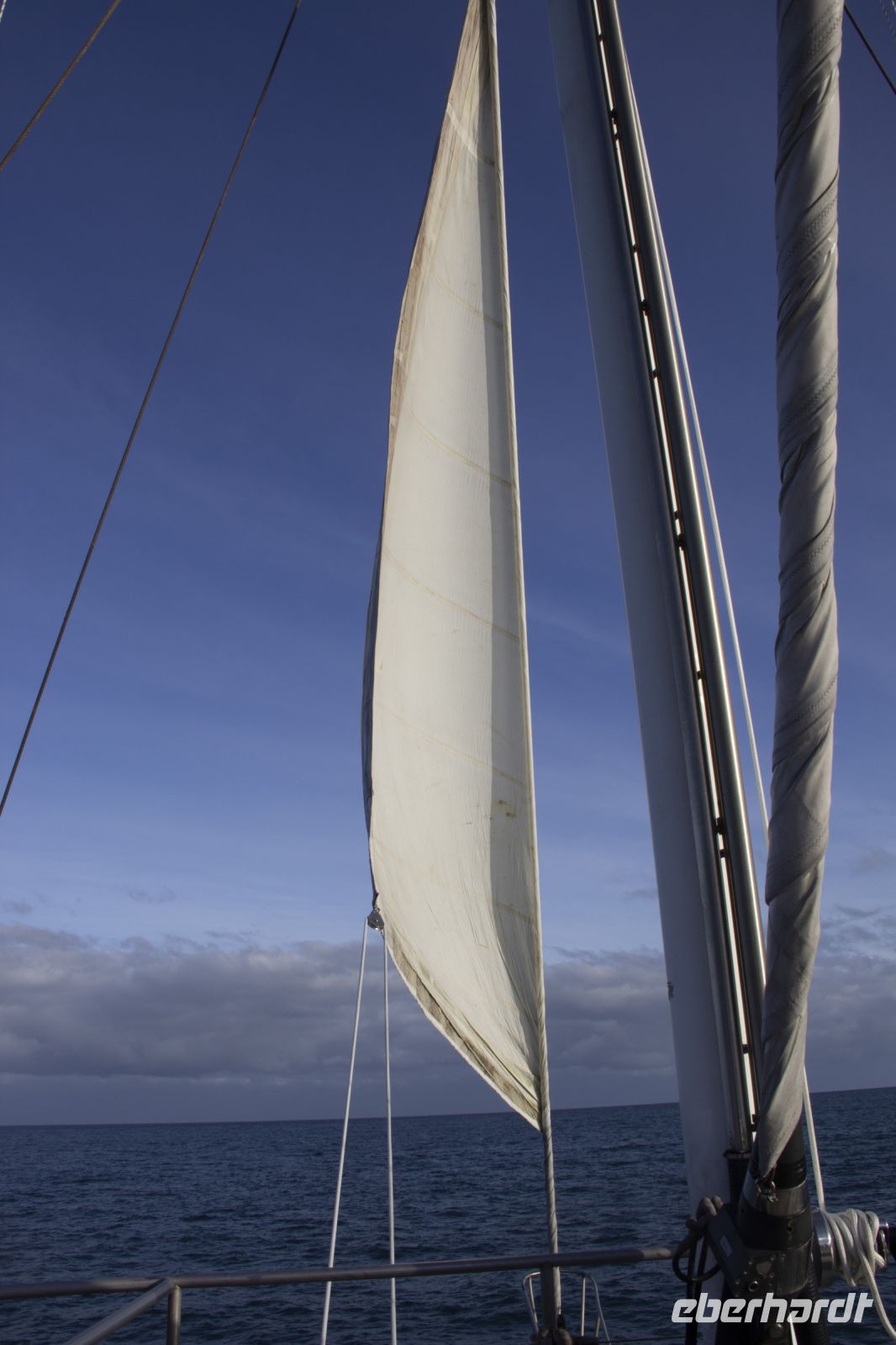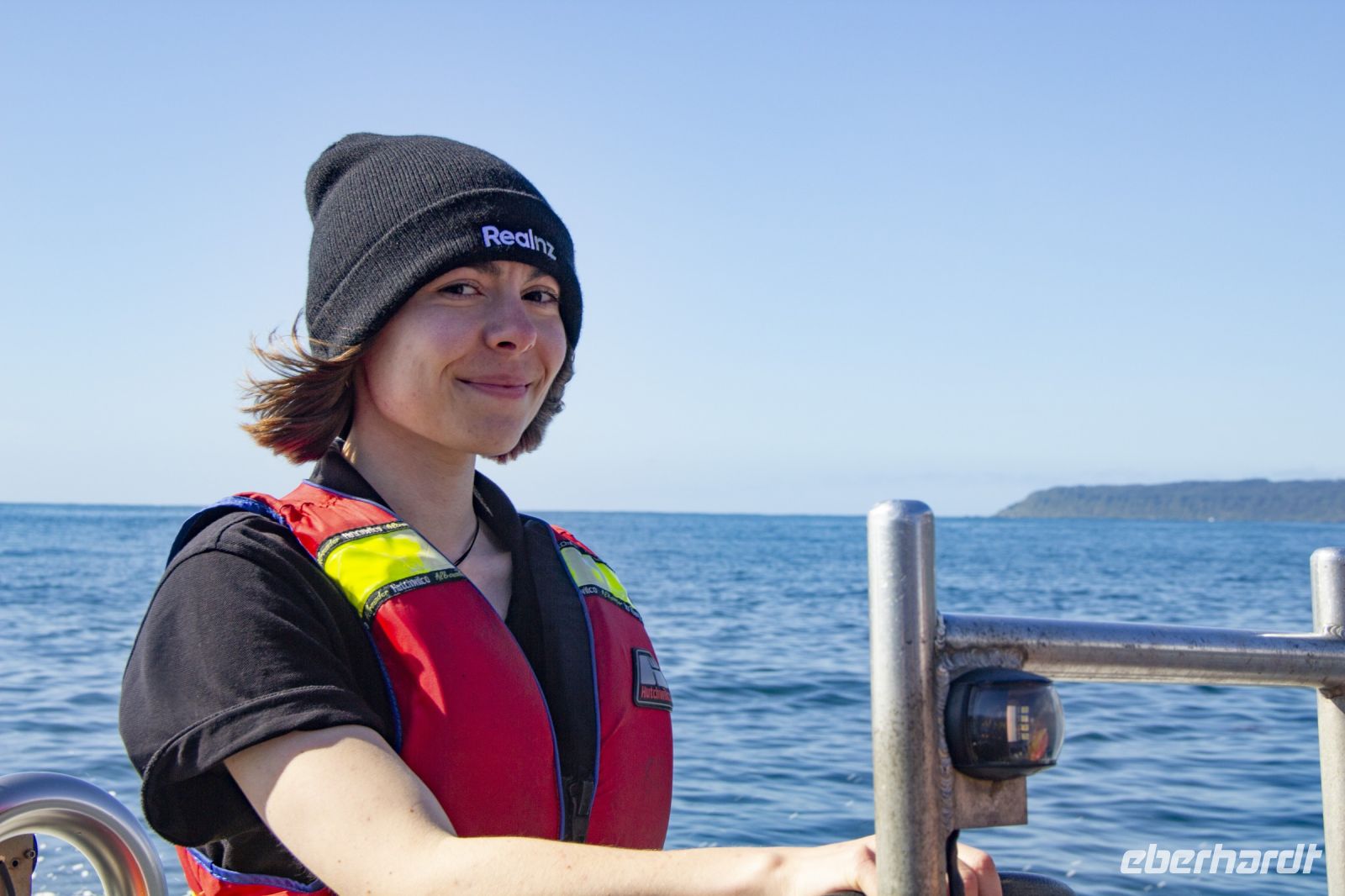 Anschließend wagen wir noch einmal den Weg hinaus auf die offene Tasmanische See. Zu unserer Überraschung setzt der Kapitän zur Feier des Tages das Segel der Milford Mariner – ein seltener und spektakulärer Anblick, selbst für einige Crewmitglieder, die dies noch nicht erlebt haben. Mit dem klaren Himmel haben wir erneut unglaubliches Wetterglück, das uns die Weite des Meeres in vollen Zügen genießen lässt.