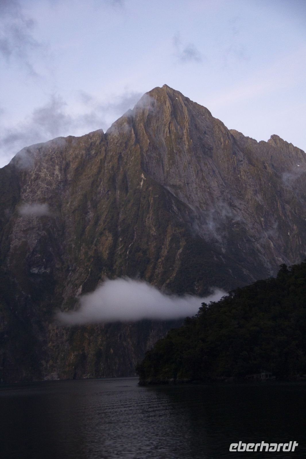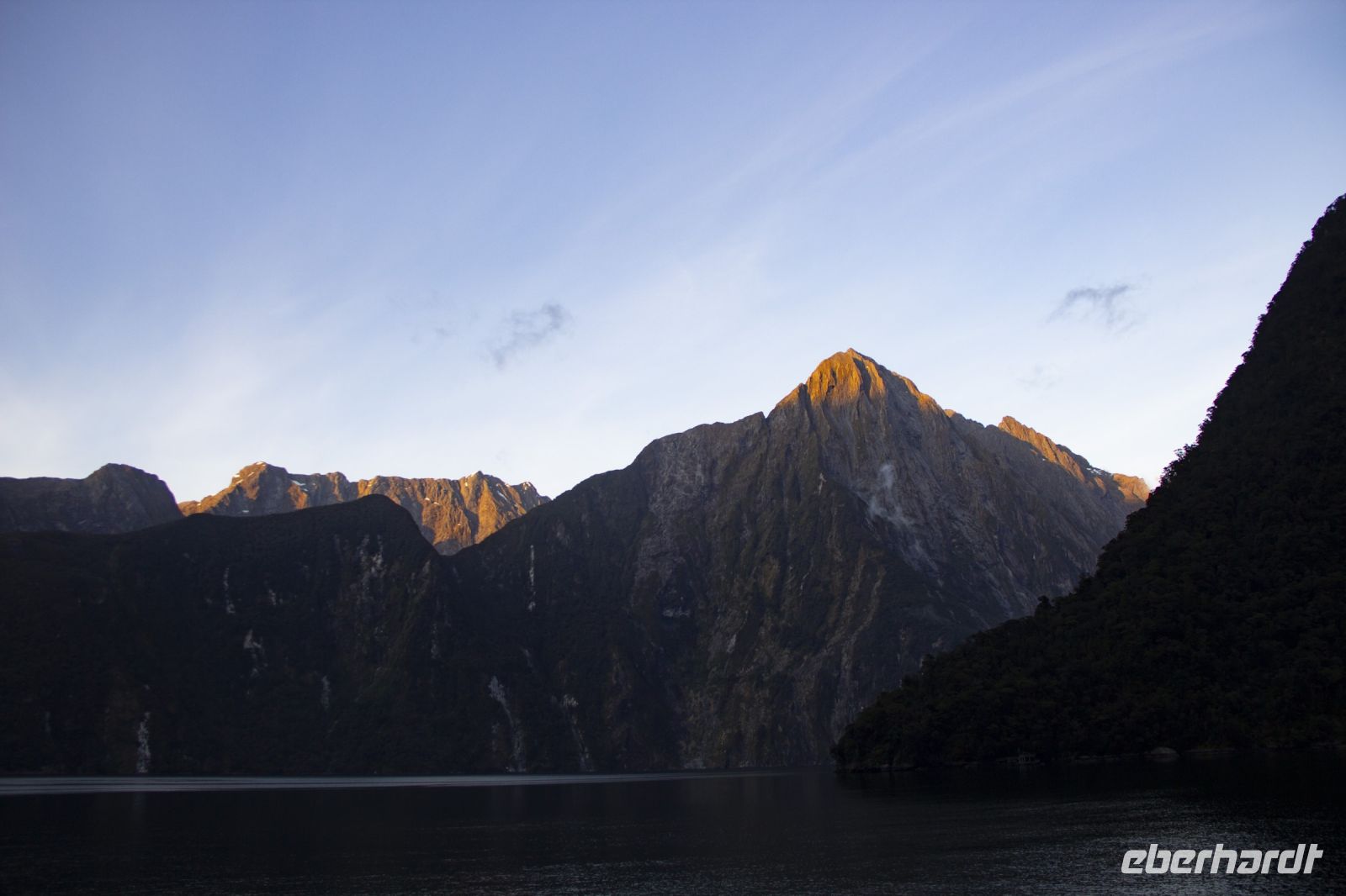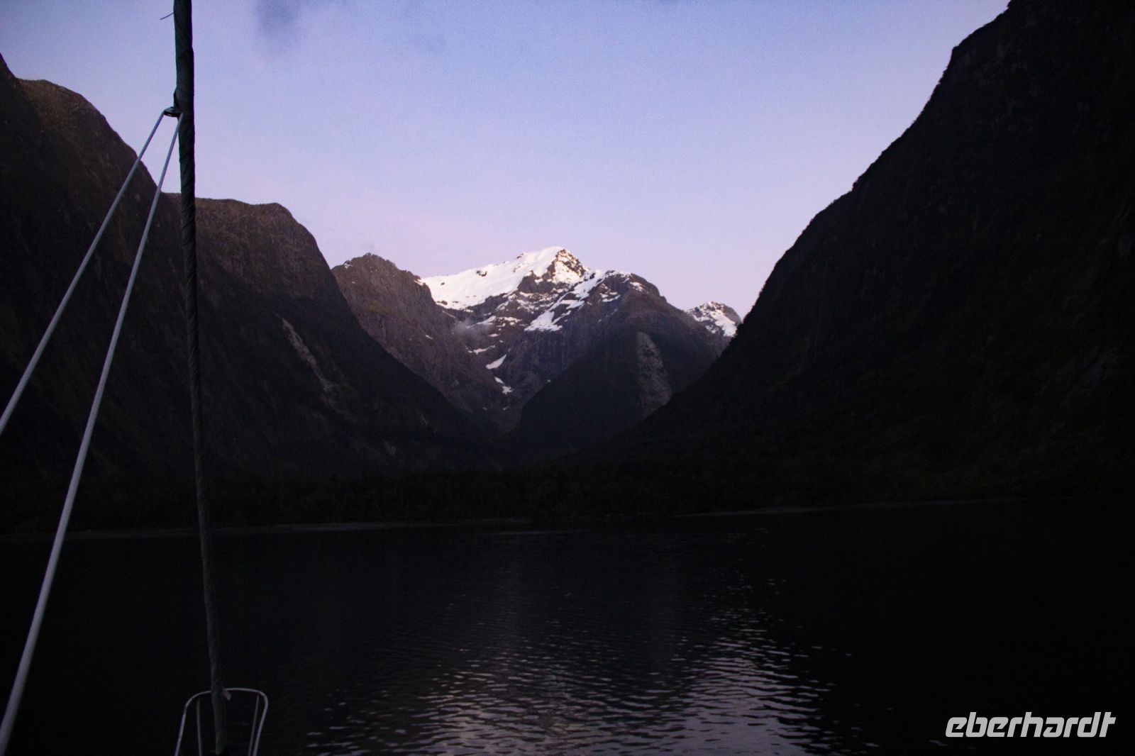 Am Abend versammeln wir uns auf Deck, um den Sonnenuntergang zu bewundern. Die gesamte Crew begleitet uns, denn auch sie genießt dieses selten gute Wetter im Milford Sound. Der Himmel färbt sich in leuchtenden Orange- und Rosatönen, bevor die Dunkelheit langsam hereinbricht. Schließlich gehen wir in einer geschützten kleinen Bucht vor Anker.