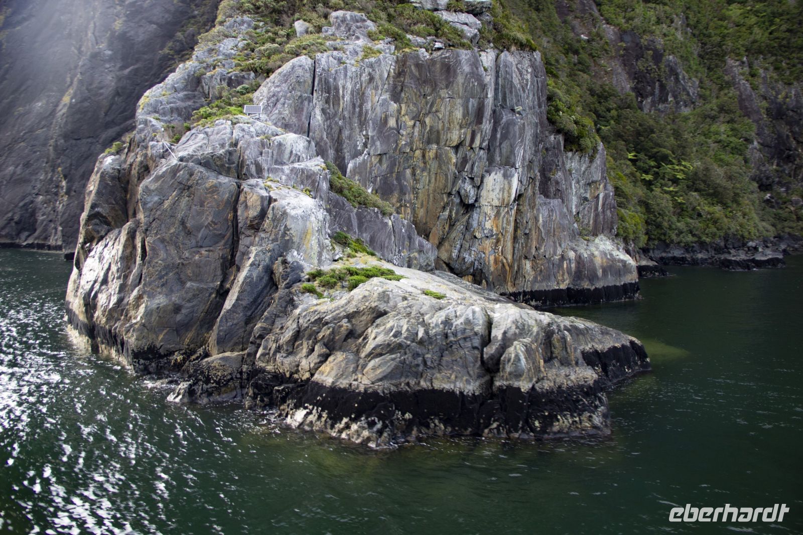 Unser erfahrener Naturguide führt uns mit geschultem Blick durch den Milford Sound und entdeckt bald einen der Südlichern Schopfpinguine (Fiordland Crested Penguins). Ein einzelner Pinguin hüpft geschickt die Steine hinunter, um ins Wasser zu gelangen. Kurz darauf sehen wir noch einige weitere Pinguine, die elegant durchs Wasser schwimmen. Verschiedene Vögel fliegen tief über die Wasseroberfläche und sorgen für weitere spannende Beobachtungen.