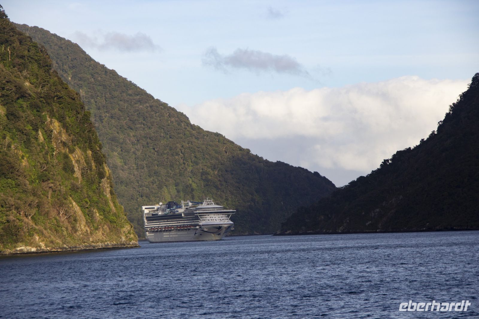 Der Milford Sound, ein von Bergen und Wasserfällen gesäumter Fjord, ist ein Naturwunder, das bei gutem Wetter seine volle Schönheit entfaltet. Wir gleiten durch die stille, glitzernde Wasseroberfläche und genießen den majestätischen Anblick der steilen Klippen und grünen Berghänge. Kurz bevor wir die Tasmanische See erreichen, werfen wir den Anker, und die Crew bereitet die Tenderboote vor. Mit diesen kleinen Booten erkunden wir die Umgebung des Fjords aus nächster Nähe. Obwohl wir versuchen, einige Tiere wie Delfine, Pinguine oder Robben zu erspähen, bleibt uns das Tierglück heute verwehrt – die Landschaft allein ist jedoch faszinierend genug.