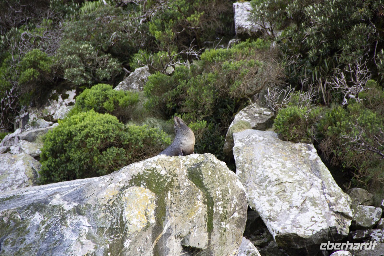 Auf einem der Felsen entdecken wir einen Neuseeländischen Seebären (Fur Seal), der entspannt in der Sonne liegt und die Nase in die Luft streckt. Als wir näher heranfahren, sehen wir, dass sich noch zwei weitere Seebären in der Nähe aufhalten.