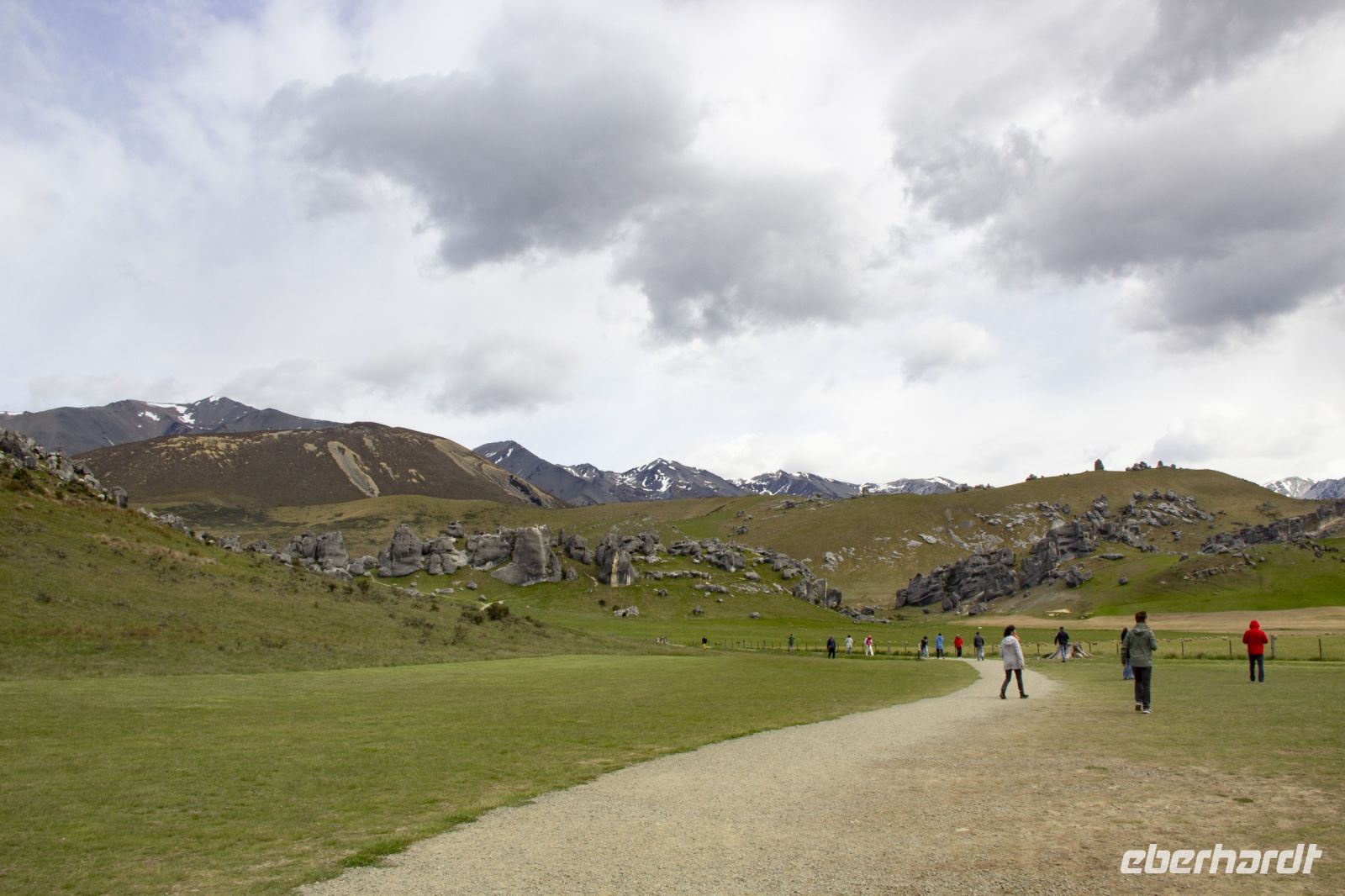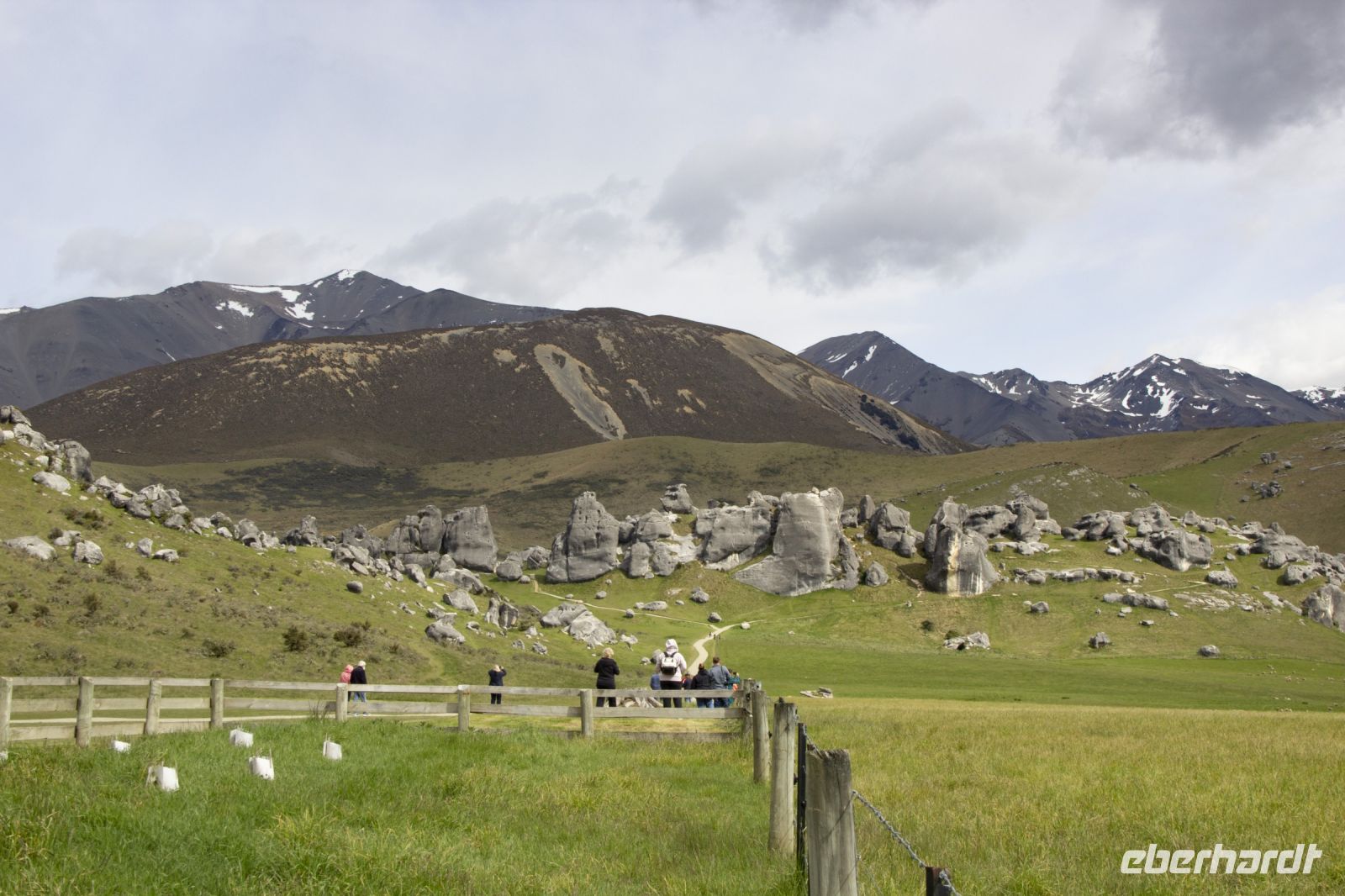 Die Mittagspause verbringen wir im Stadtzentrum von Christchurch, bevor wir unsere Reise Richtung Süden fortsetzen. Auf dem Weg zum Lake Tekapo holt uns schließlich der Regen ein – bis jetzt hatten wir sehr viel Glück mit dem Wetter. Doch im Bus genießen wir die vorbeiziehende Landschaft, die immer hügeliger wird und uns an die schottischen Highlands erinnert.