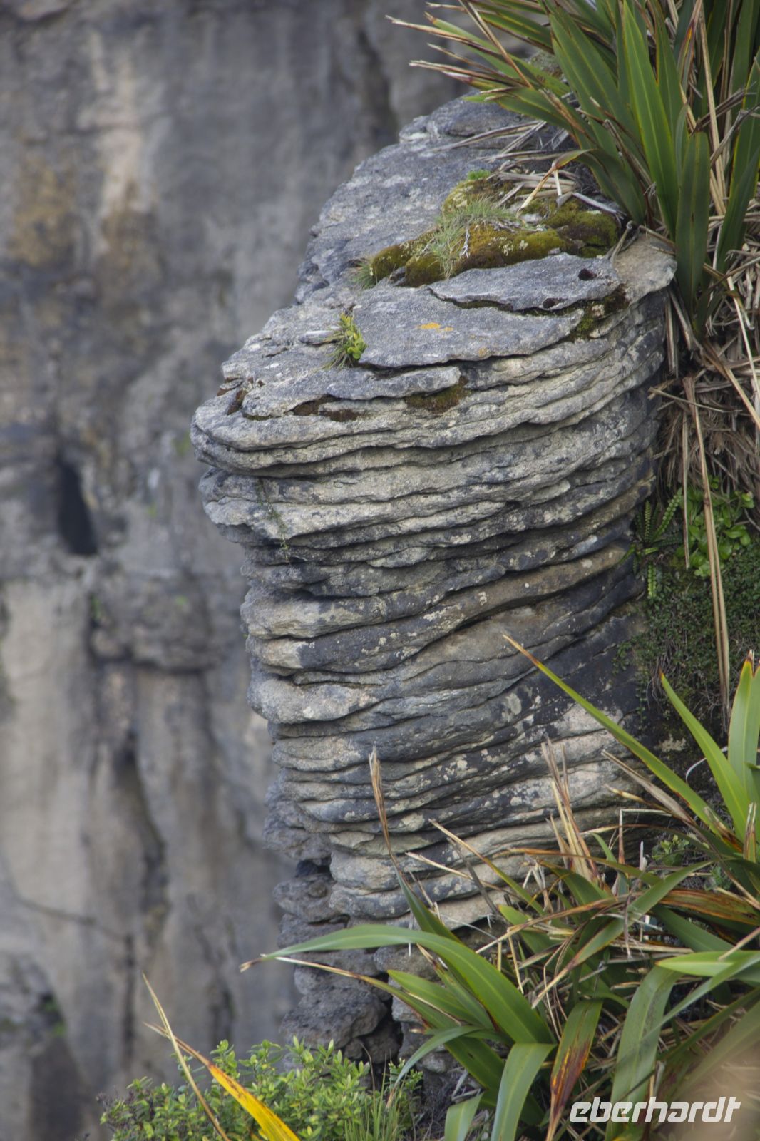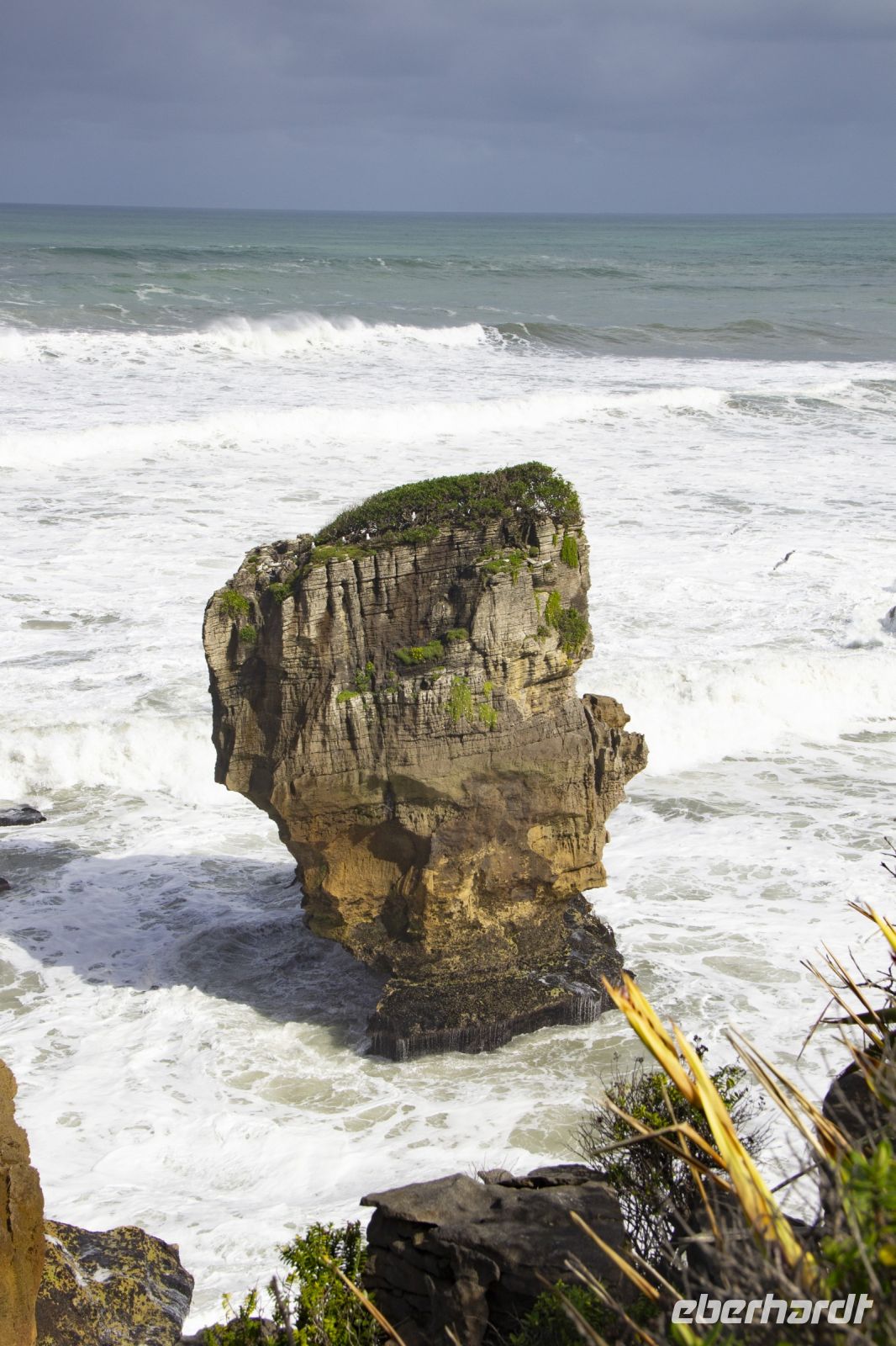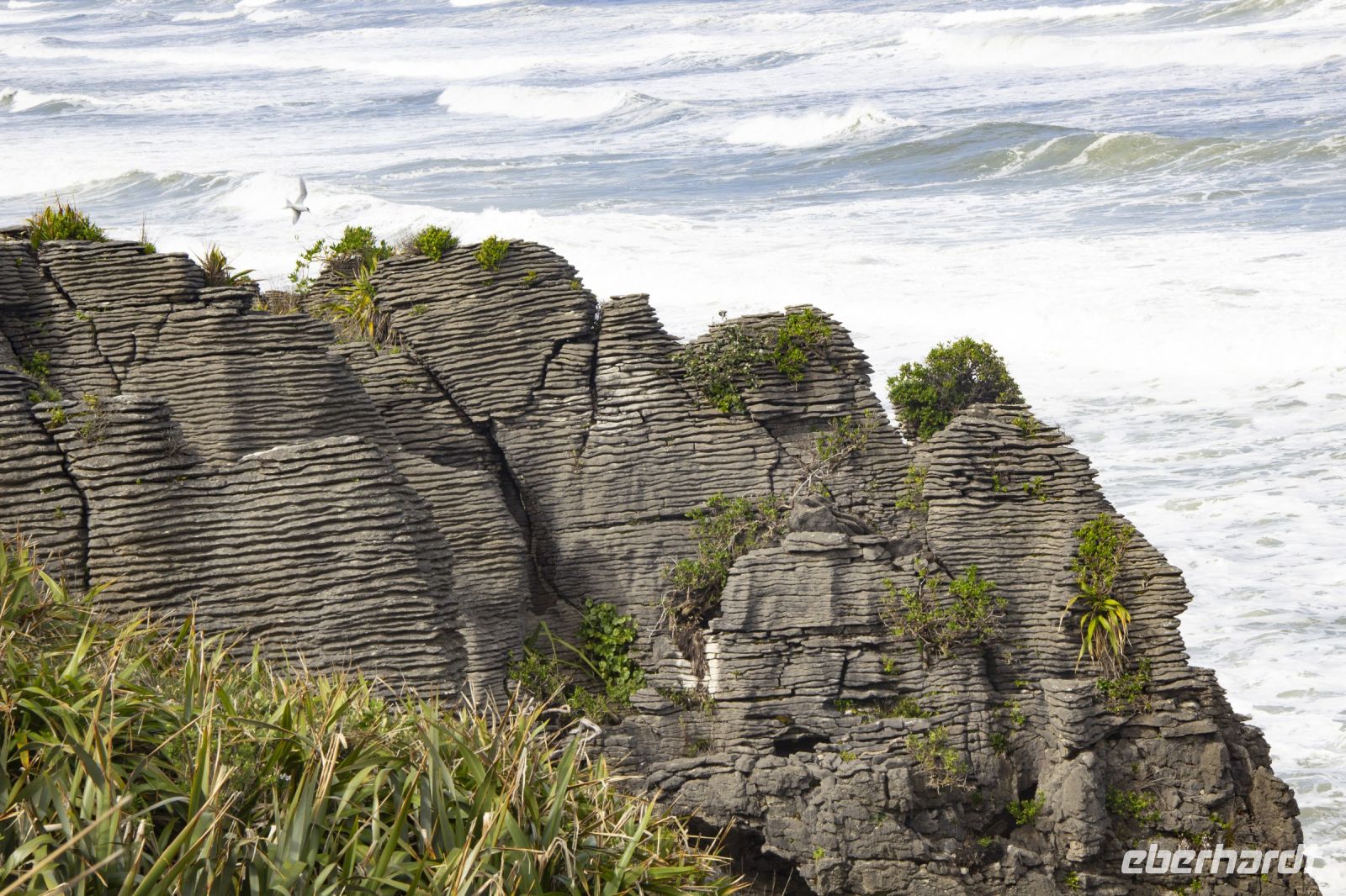 Heute verlassen wir unser Hotel am Rande von Greymouth und machen uns auf den Weg zu den berühmten Pancake Rocks, einer der bekanntesten Natursehenswürdigkeiten der Westküste Neuseelands. Bei bestem Wetter genießen wir den gut angelegten Rundweg, der uns mitten durch diese beeindruckende Felsformation führt. Aus der Nähe ist deutlich zu erkennen, warum die Pancake Rocks ihren Namen tragen: Die Felsen sehen tatsächlich aus wie übereinander gestapelte amerikanische Pfannkuchen – ein geologisches Phänomen, das durch Millionen von Jahren der Erosion entstanden ist.