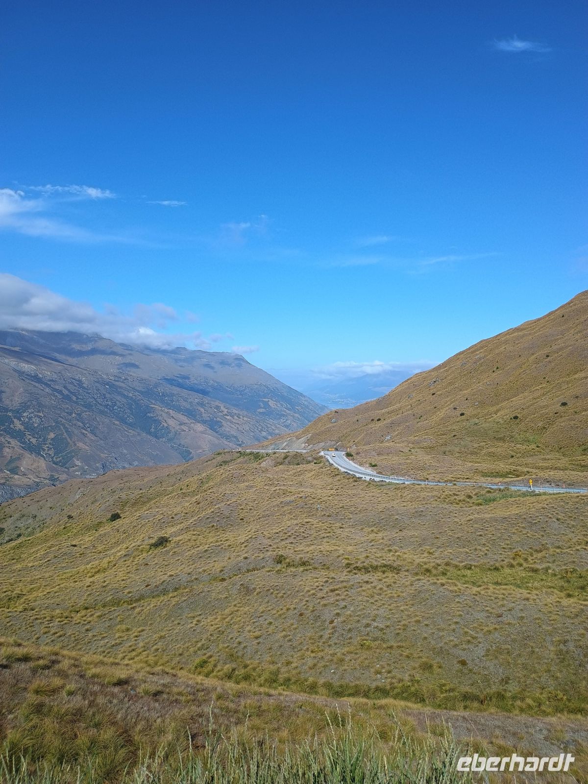 Um nach Wanaka zu gelangen, gibt es zwei Wege: entweder man fährt im Tal weiter entlang oder man fährt wie wir über die Berge und kann bei schönem Wetter die Aussicht genießen aus 1121 m Höhe. Die Straße, die wir nehmen, ist die höchstgelegene asphaltierte Straße Neuseelands - die Crown Range Road. Die Fahrt über den Berg ist nicht unbedingt schneller, vor allem nicht mit unserem vollgeladen Bus aber dafür werden wir mit unbezahlbaren Blicken auf das Tal links und rechts von uns entschädigt.