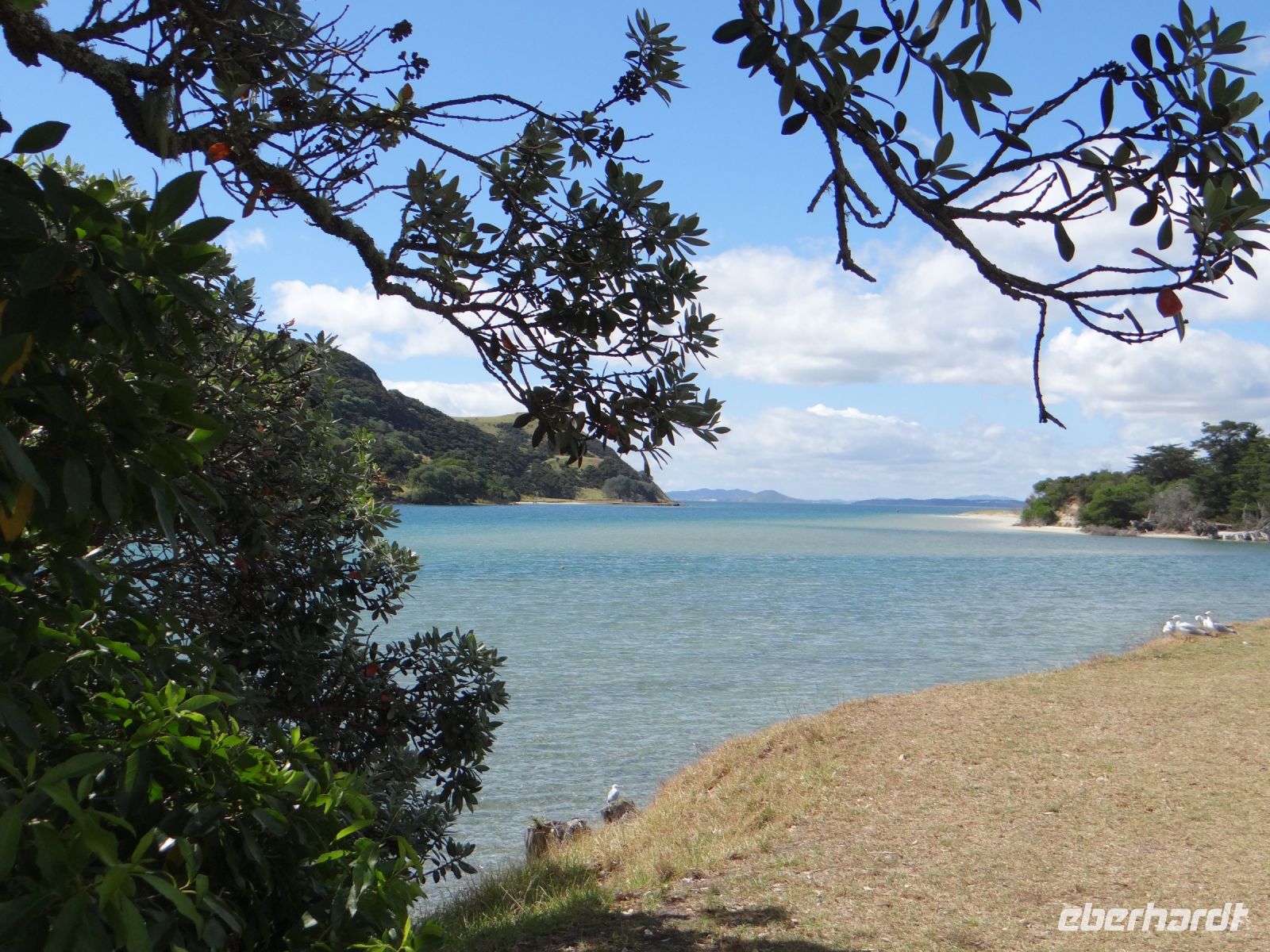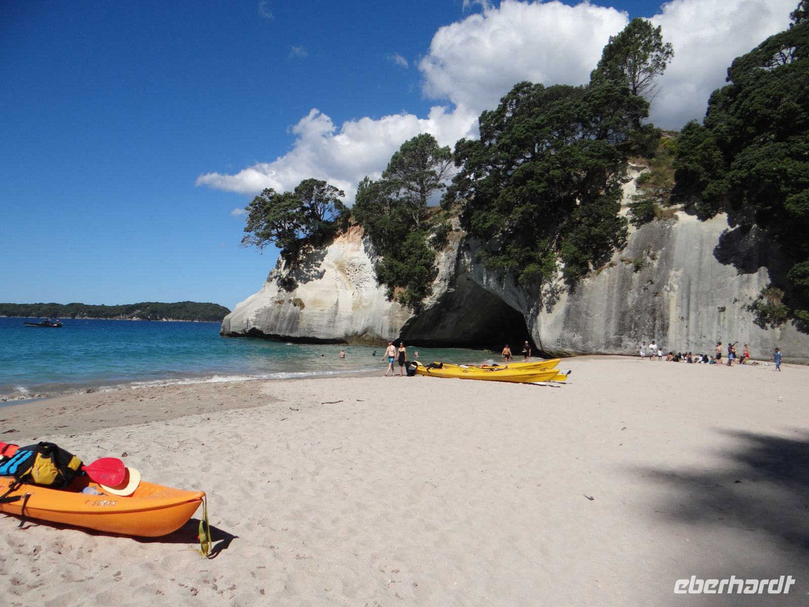 Cathedral of Cove und der Strandabschnitt sind sehr schön. Der weiche Sandstein wird vom Meer stetig bearbeitet, so dass daraus das bizarre Loch im Felsen entsteht. So viele Nationalitäten sitzen hier zusammen, schauen aufs Wasser und baden. Es ist wunderschön, blaues Wasser, blauer Himmel und rundherum Inseln und grüne Ufer.