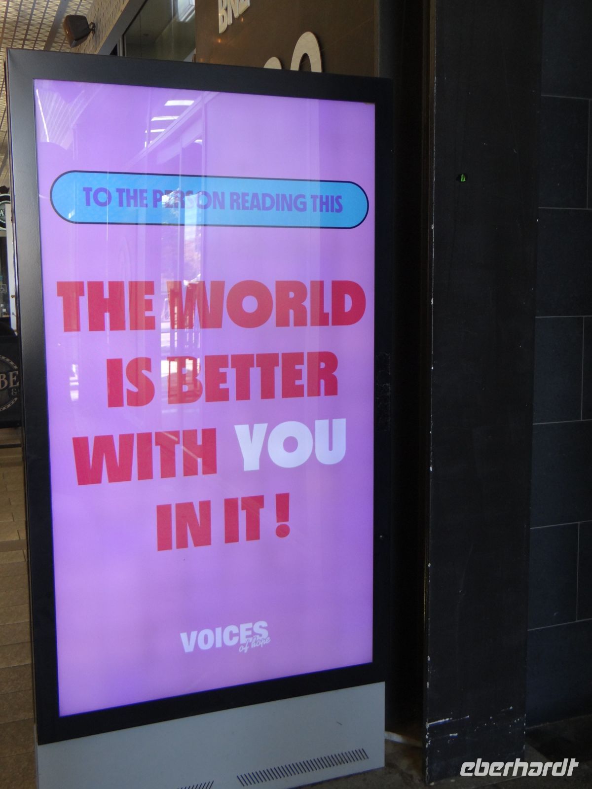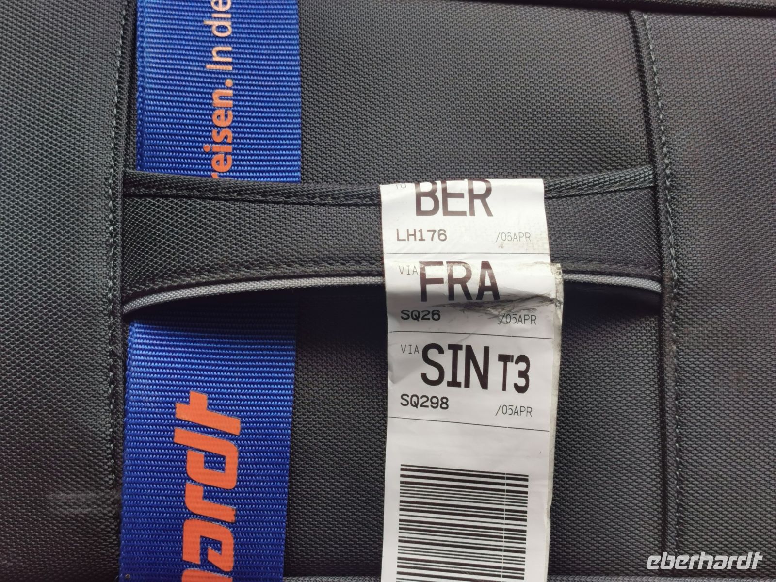 Wo ist das Ende der Welt? Um diese Frage zu beantworten, besteige ich zunächst ein Berliner Verkehrsmittel und fahre zum BER, treffe zwei Fluggäste und gemeinsam fliegen wir nach Frankfurt. In Frankfurt müssen wir in den Bereich B, in die Abteilung Asien. Hier starten die Flüge nach Singapur, Peking, Tokio und viele weitere asiatische Destination. Man fühlt sich hier ein bisschen dem Ende der Welt näher. Die Werbung zeigt Straßenbilder aus Bangkok, die Chinesische Mauer, Schattenboxen, das Gate of India in Delhi, Kabukitheater. Hier sind wir noch nicht richtig. Wir müssen weiter und so besteigt die Gruppe den Flieger nach Singapur.