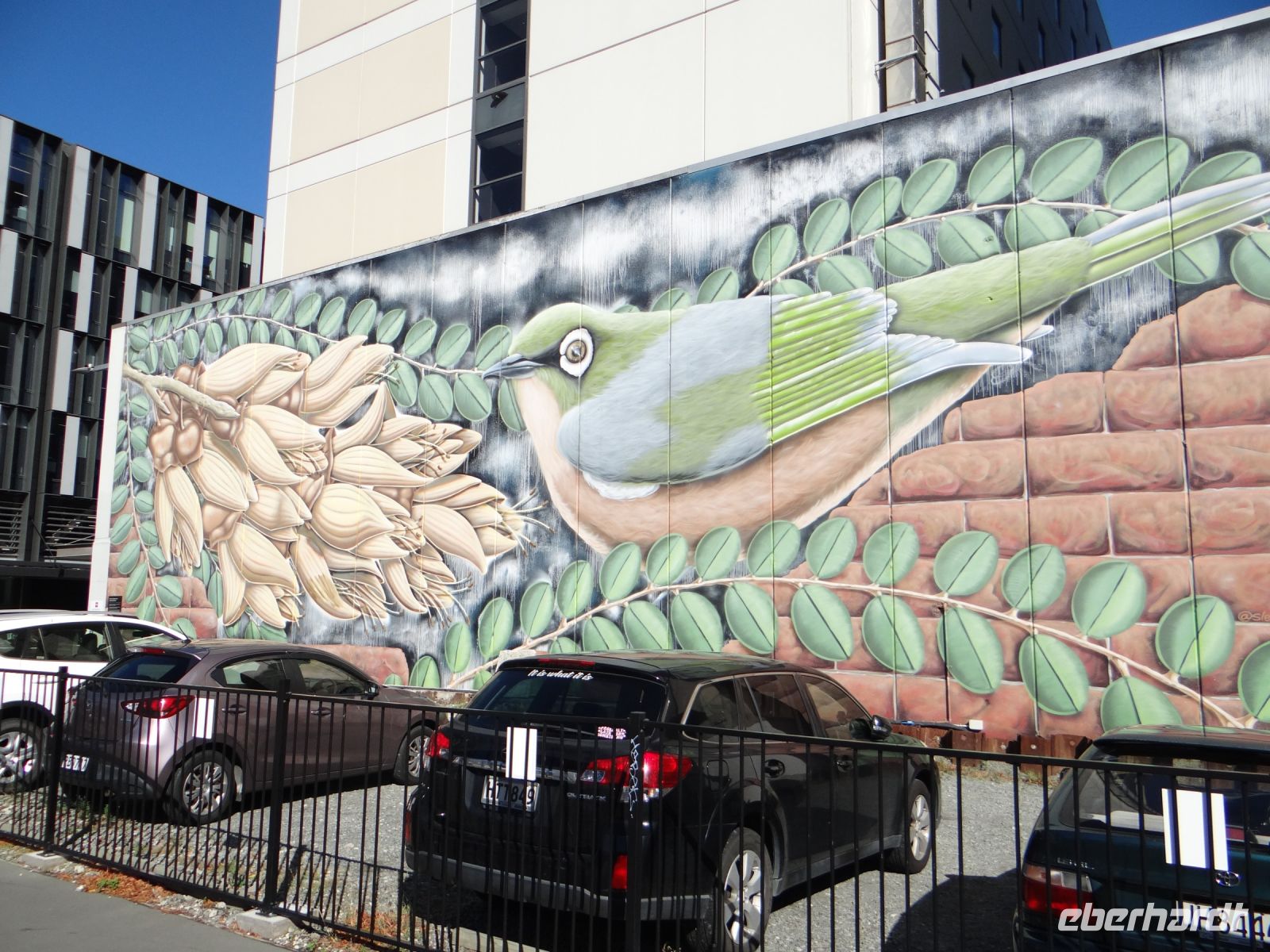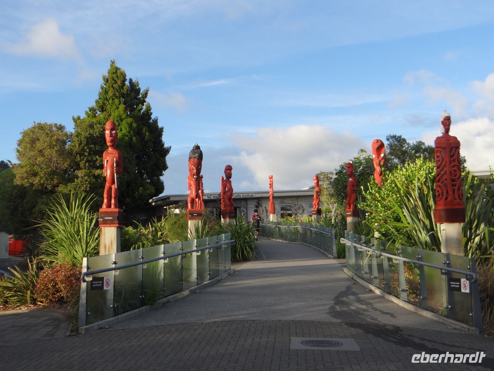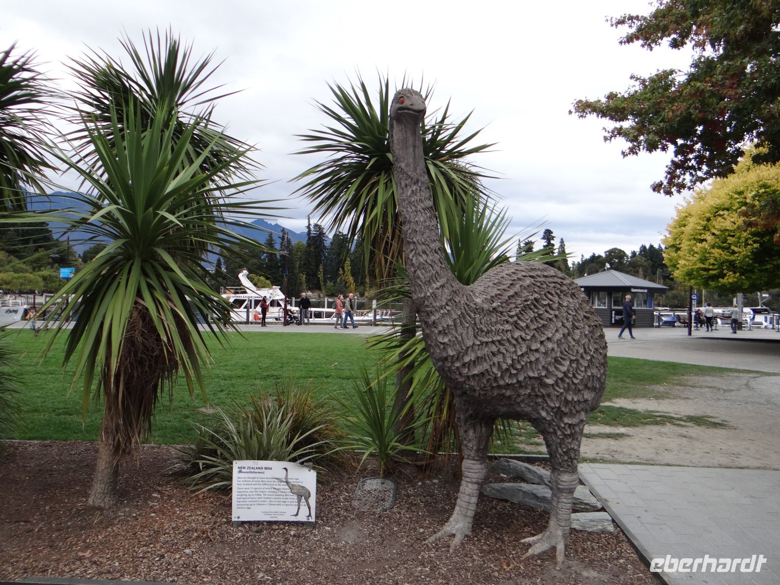 Wir kommen an einer Moa-Skulptur vorbei. Dieser straußenähnliche Vogel mit einer Höhe von drei Metern war schon aufgegessen, als die ersten weißen Siedler ins Land kamen. Sein Fressfeind, der Haarst-Adler mit einer Flügelspannweite von drei Metern, ähnlich dem Albatros, verlor seine Lebensgrundlage und starb auch aus. 30 Vogelarten sind bereits verloren, weitere sind bedroht bis stark bedroht. Daher sind die auf kleineren Inseln eingerichteten Vogelschutzgebiete so wertvoll, da die Tiere hier unter sich sind.