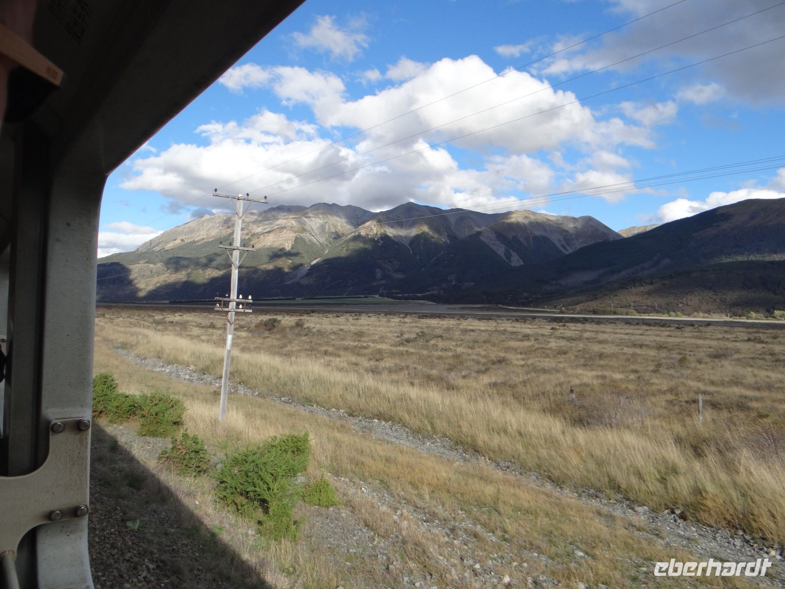 Die Landschaft ist vielgestaltig und die Windungen des Zuges lassen uns von rechts nach links laufen, ständig sind wir in Bewegung, um alles in uns aufzunehmen und aufs Bild zu bekommen. Irgendwann wird es ganz grün, die hohen Windschutzhecken tauchen auf, wir sind in der Canterbury Plain, die wir genau vor einer Woche durchfahren haben.