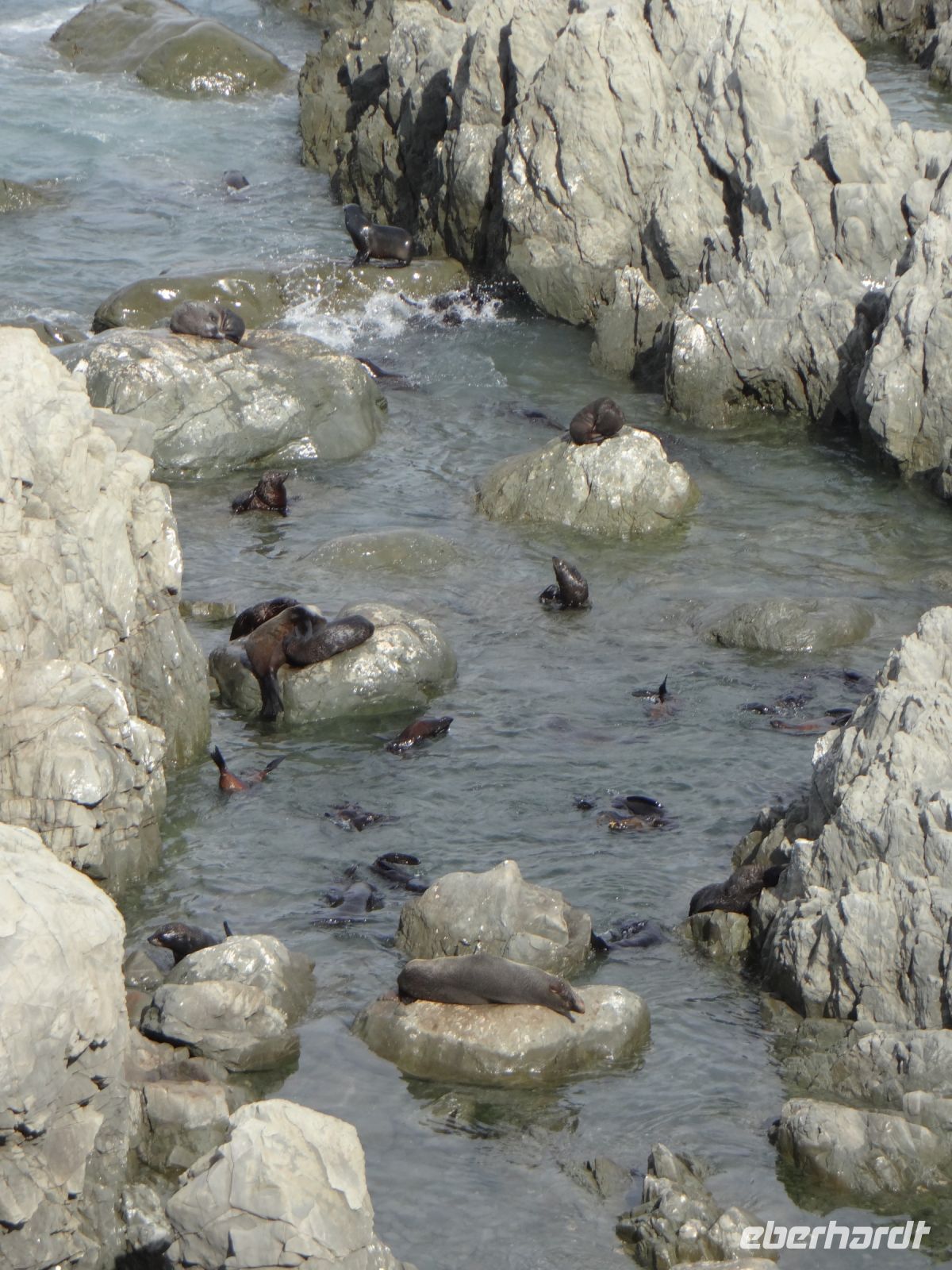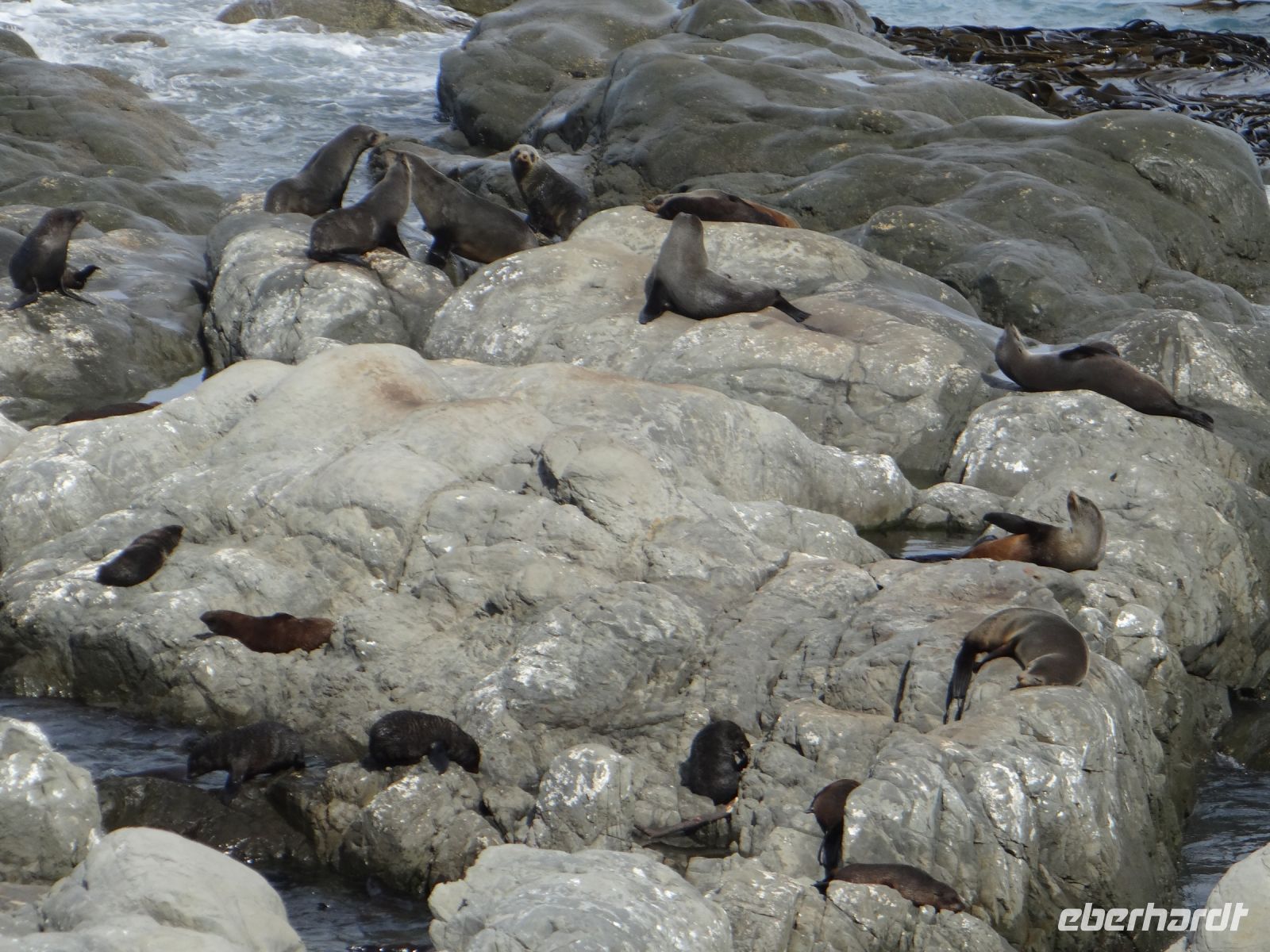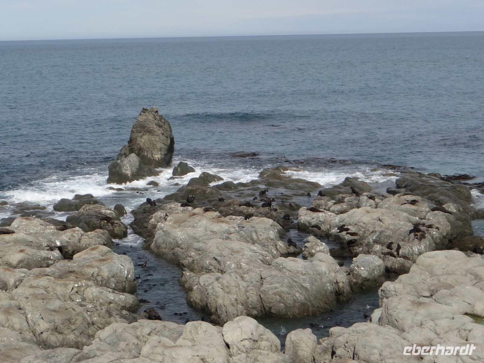 Auf dem Weg zu unserer letzten Tagesetappe schauen wir uns die Moeraki Boulders an. Diese sind ungewöhnlich große kugelförmige Zusammenschlüsse von Mineralien. Diese liegen einzeln oder in Gruppen an der Küste. Die Erosion von Wind und Wellen legt regelmäßig weitere Kugeln frei. Alle Beschreibungen über die Entstehung sind schwierig zu verstehen und so belassen wir es dabei, uns einfach von den Kapriolen der Natur faszinieren zu lassen.