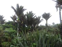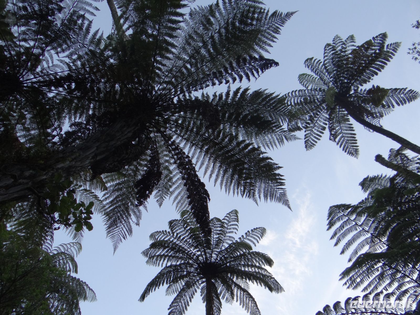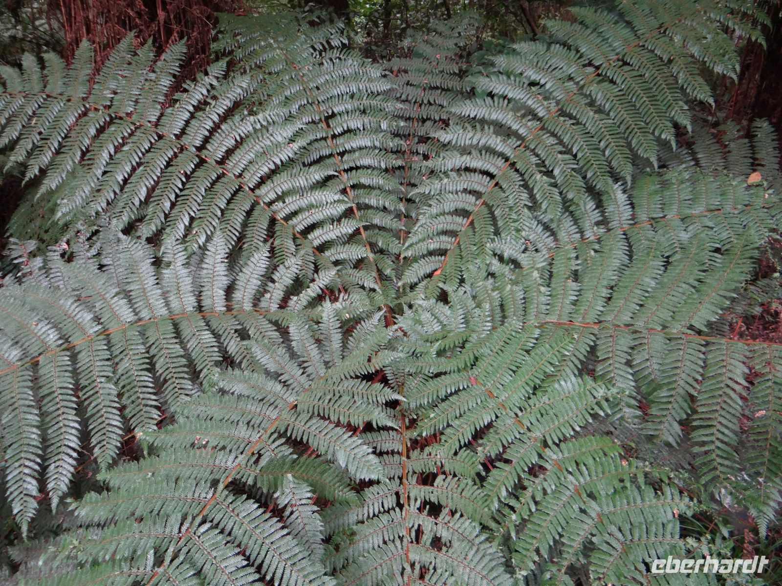 Wir fahren durch einen solchen verwunschenen Wald - den Waipoua Wald. ¾ aller Kauribäume sind noch hier hu finden, mit einer Höhe von bis zu 60 m und einem Durchmesser von über fünf Metern. Hier steht ein mächtiger Kauribaum, genannt Tane Mahuta. Der Name stammt aus der Sprache der Maori und ist nach dem gleichnamigen Gott des Waldes Tane benannt. Noch heute ist der Baum den Maori heilig (auf deren Grund er steht). Das Alter des Baums wird auf bis zu 2000 Jahren geschätzt. D.h. er könnte zu Christi Geburt gepflanzt worden sein. Unser Zeremoniell, ihn besuchen zu können, sieht vor, dass wir unsere Schuhe einer Unterbodenwäsche unterziehen: erst grob abbürsten, dann wird die Sohle desinfiziert. So sauber waren die Schuhe noch nie. Über 20.000 Farnarten gib es auf der Insel und die unglaubliche Vielfalt zeigt sich schon auf dem kurzen Weg zum Baum. Walt zeigt uns einen Silberfarn, neben dem Kiwi das zweite Wahrzeichen des Landes. Die Unterseite des großen Blattes glänzt silbrig. Die Natur zum Wahrzeichen eines Landes, das so grob mit ihr umgeht.