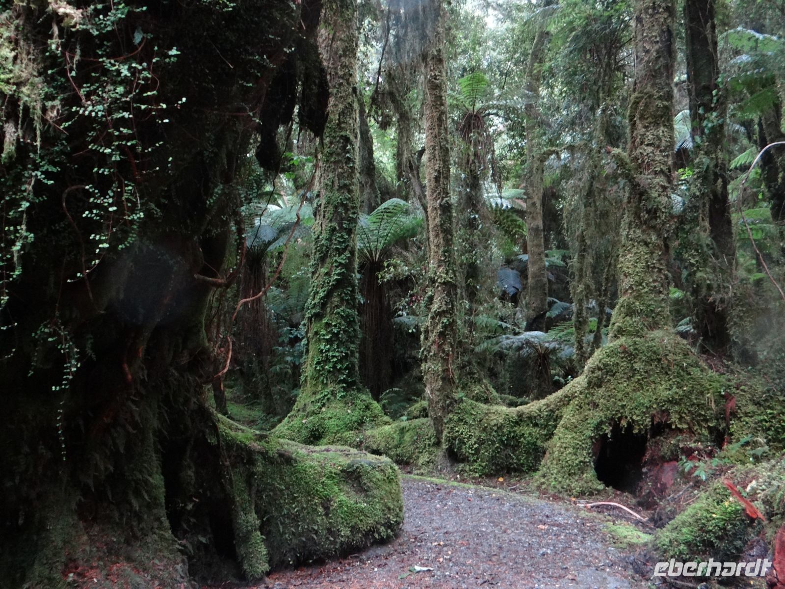 Aufgrund der Wetterlage wird heute nicht mehr geflogen, wir warten auf morgen. Nahe des Hotels ist ein Wanderweg durch den Regenwald. Was wir dort sehen, lässt uns staunen. Jeder Stamm ist in üppiges Grün gepackt, Flechten, Farne, Gräser. Das Moos lässt sich tief runterdrücken und polstert weich aus. So viele verschiedene Grüntöne, so viele verschiedene Blattformen und Strukturen. Querfeldeinlaufen, auf den Gedanken kommt man nicht. Man wüsste nicht, wohin den Schritt setzen; der Boden ist dicht überwuchert. Der Wald saugt uns regelrecht ein. Regen und Stille. Jede Biegung, jede Kurve, jeder Lichteinfall macht neugierig, weiterzulaufen. Dicke Stämme, weit ausladend, wo fängt er an, wo hört er auf und geht in Farnlaub und anderes Grün über? Wenn jetzt hier ein freundlich lächelnder kleiner Dinosaurier hervorträte, es würde nicht verwundern.