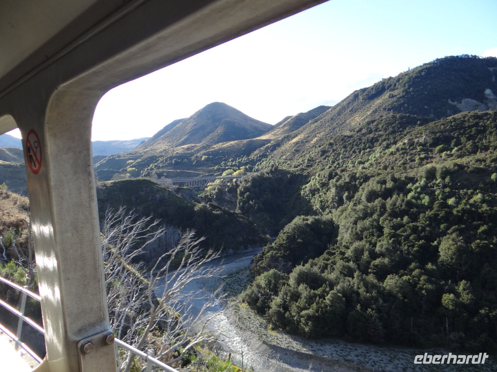 Wir fahren durch den Otira-Tunnel, der mit 8,5 km der damals längste Tunnel in der südlichen Hemisphäre war und der 1923 eröffnet werden konnte. In drei Schichten wurde der Tunnel gegraben, Tag für Tag, 15 Jahre lang, bis er fertiggestellt war. Unseren Aussichtswagen müssen wir für diese Tunnelfahrt verlassen, da die Diesellok uns den Atem nehmen würde. Das merken wir bei kurzen Tunneln, die wir auf dem Wagen passieren dürfen. Kurz hinter dem Tunnel liegt Arthur’s Pass, einer der drei Pässe der Südalpen. Hier haben wir einen kurzen Halt. Auf Infotafeln ist anhand Fotos nachzuvollziehen, dass der Pass früher auf Schotterpisten auf Pferdewagen überquert worden ist. Das Leben hier war eine ganz schöne Schinderei,