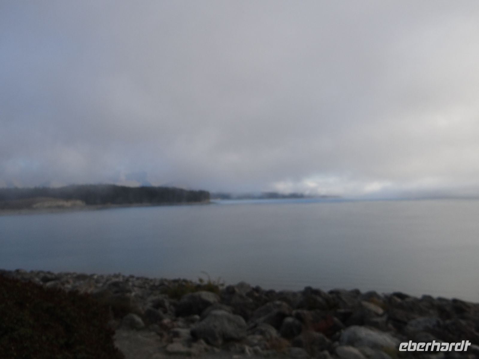Mit dem Bus geht es nun zum Lake Pukaki, der Boden ist stellenweise von Bodennebel überzogen, die Laubbäume zieren gelbe Spitzen, die Landschaft wirkt herbstlich. Von der südlichen Seespitze sollten wir jetzt in gerader Richtung nach Norden einen wunderbaren Blick auf Aoraki/Mount Cook haben. Aoraki heißt übersetzt „der die Wolken durchstößt“, und heute hängen die Wolken zu tief, dass wir nicht mal den Fuß des mächtigen Berges sehen. Schade und ab zur nächsten Sehenswürdigkeit. Walt hält ein tolles Angebot bereit – die Stadt Oamaru, dort scheint dann auch die Sonne.