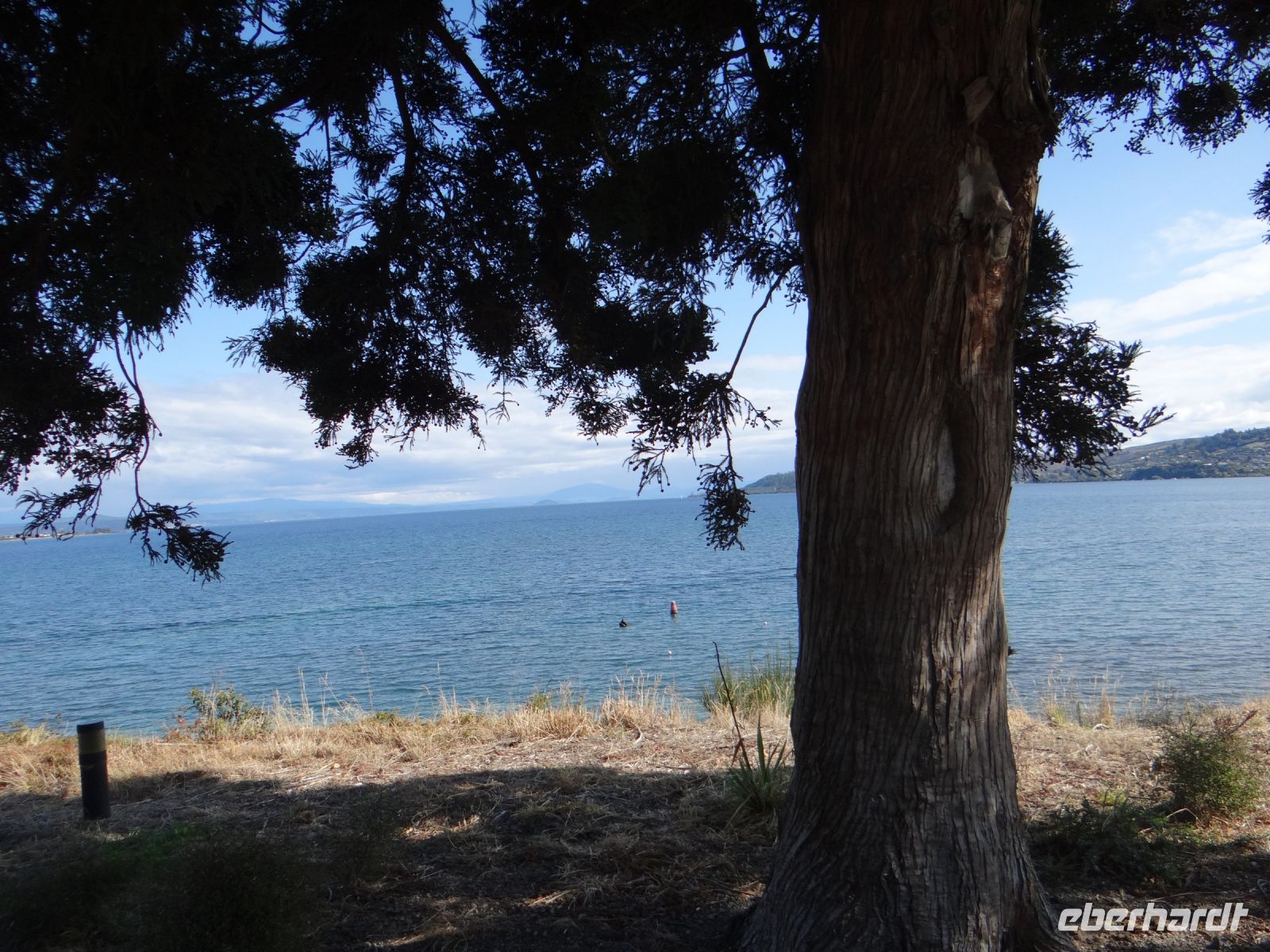 Heute ist Freizeit bis Mittag und dann Badetag. Mit Badezeug und Schaufeln besteigen wir bei schönstem Wetter den Bus – es ist ein bisschen wie ein Familienausflug – und fahren nach Taupia. Eine Personenfähre verbindet hier und drüben – Paunia – doch die Autos müssen die Bucht umfahren. Der Blick über die Bucht auf den kleinen Vulkan – er ist gerade 600 Jahre alt – ist hübsch. Er erinnert an Lummerland, wo Jim Knopf und Lukas, der Lokomotivführer, jeden Tag ihre Runden um die Insel gedreht haben. Pause zum Einkaufen oder für ein kurzes Mittagessen, dann geht es weiter zu Cathedral Grove.