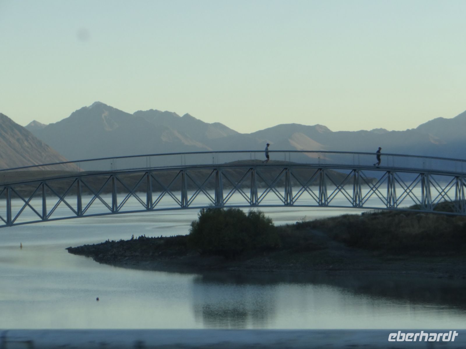 Wir überqueren die Kanäle, die die fünf Seen verbinden und mit Manneskraft und den damals zur Verfügung stehenden Maschinen ausgehoben worden sind. Nahe ihres Arbeitsortes wohnten auch die Arbeiter, z.B. in Twizel, wo wir vorbeifahren. Das Gletscherwasser dreht nicht nur die Turbinen der Kraftwerke, sondern ist auch Lebenswelt der Lachse, die hier gezüchtet werden.