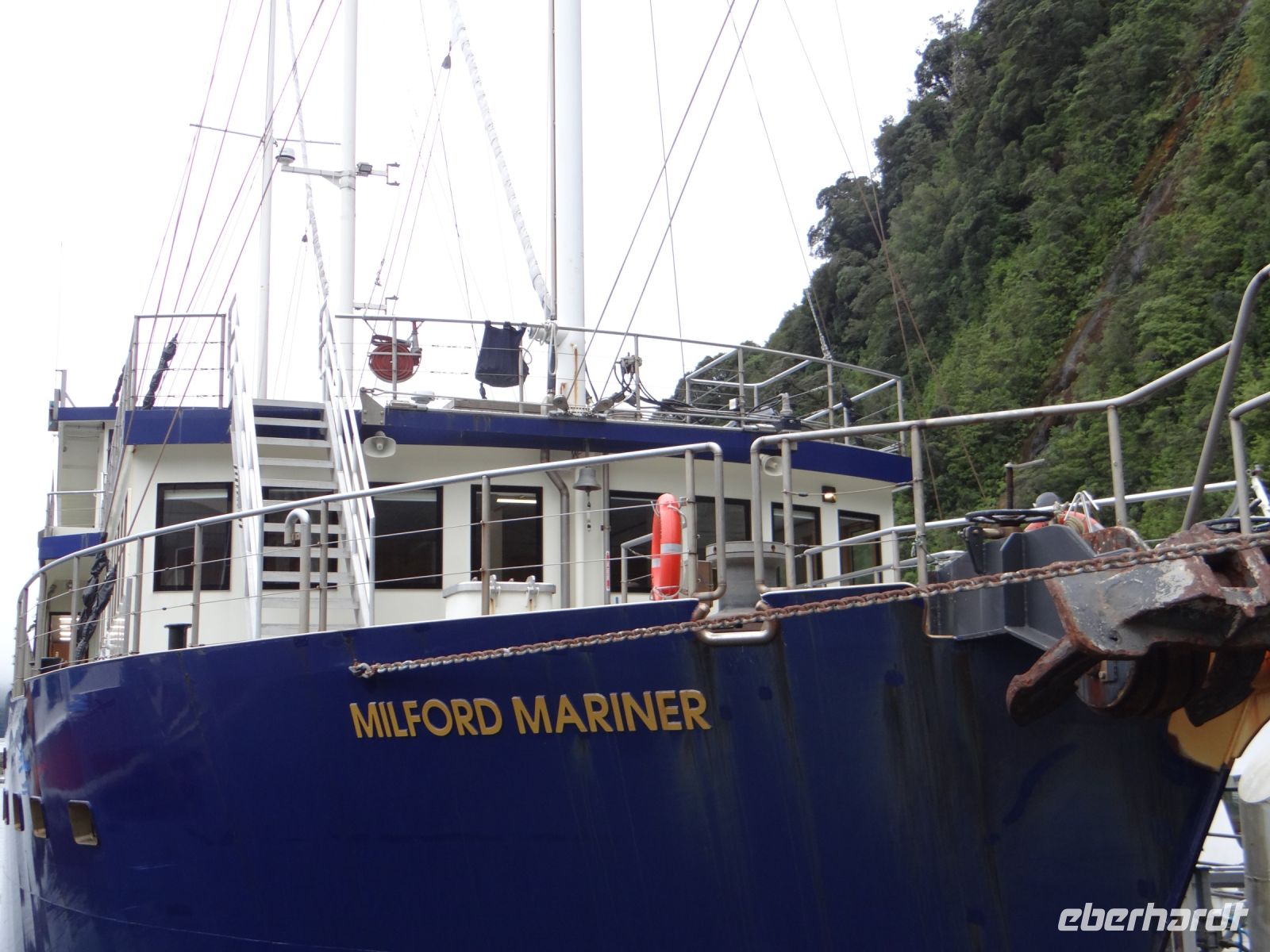 Was für ein Privileg, auf dem Sound übernachten zu können. Die meisten Touristen fahren für einen Tagesausflug von Queenstown dorthin, das sind 600 km. Und wir heuern auf der Milford Mariner an, mit Gepäck, das in eine Hand passt, denn die Kajüten sind klein, doch sehr zweckmäßig. Der Kapitän begrüßt uns, stellt seine Besatzung vor, unter der die Frauen die Oberhand haben. Nach einem 5-O’Clock-Tea setzen sich die einen ins Motorboot, die anderen ins Kanu, um Tuchfühlung mit dem Ort aufzunehmen. Ganz Mutige gehen auch noch eine Runde schwimmen.
