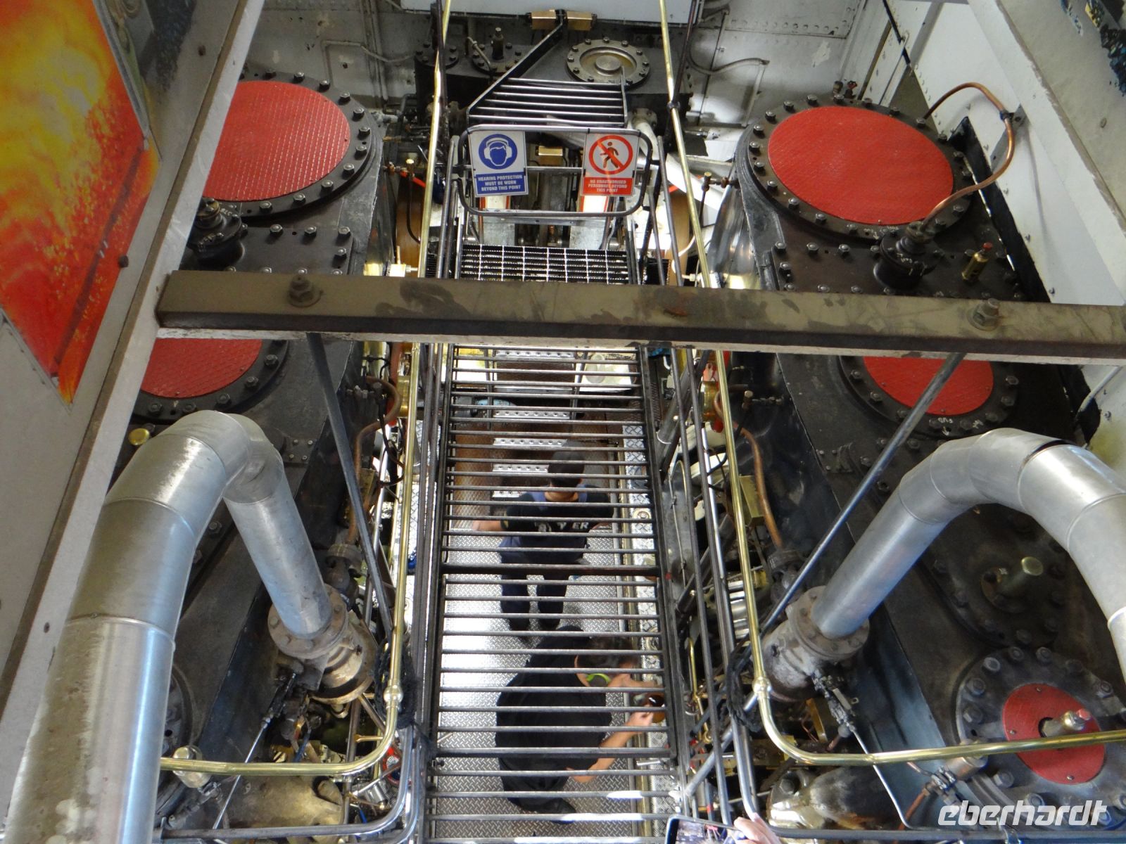 Die TSS Earnslaw ist das letzte Dampfschiff, TSS steht für Twin Screw Steamer. Somit müssen zwei Schrauben kontinuierlich unter Dampf gesetzt werden und was dazugehört, davon kann sich der Reisende ein Bild machen. Denn von oben ist der Maschinenraum zu betreten, von hier aus sieht man, wie die vier Öfen befeuert, die Maschinen beölt werden und stampfen. Ein herrliches Erlebnis, das uns über den See setzen lässt. An der Walter Peak Farm angekommen, werden wir zu einem ausgezeichneten Barbecue gebeten. Es ist so gut organisiert, dass sich die vielen Gästen nicht im Weg stehen und jeder ausreichend Zeit hat, von allem zu probieren.