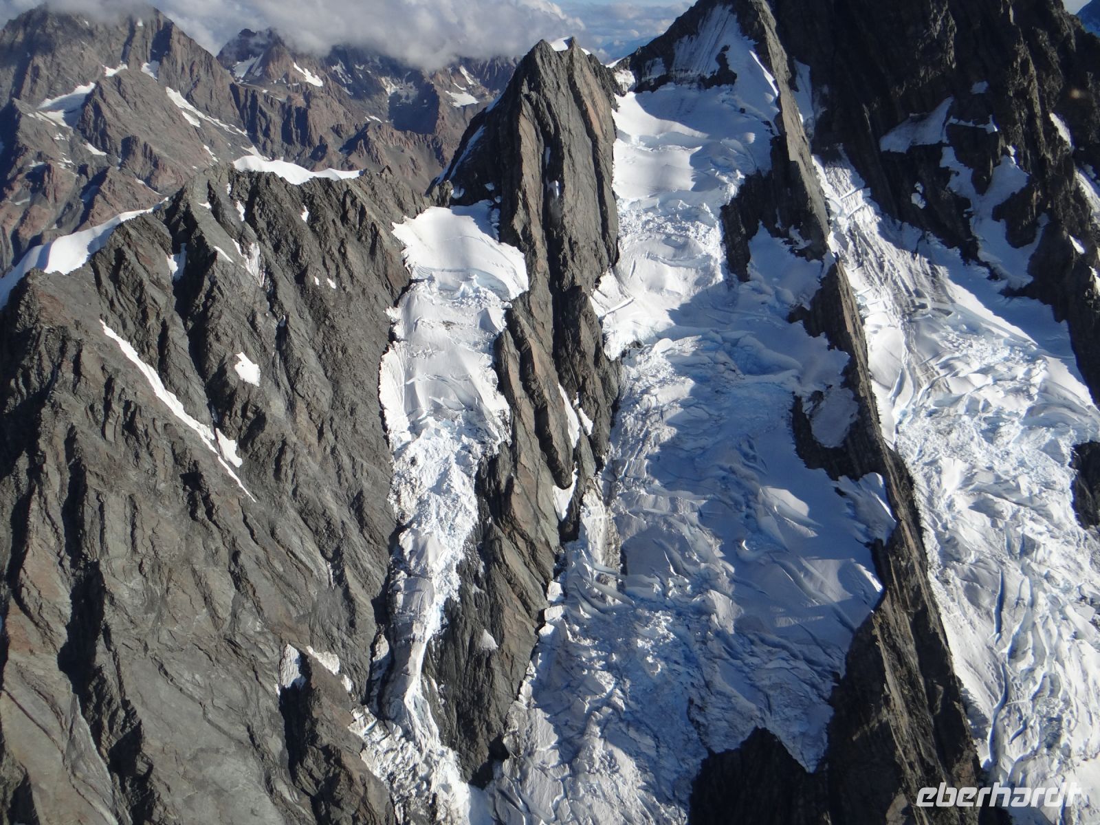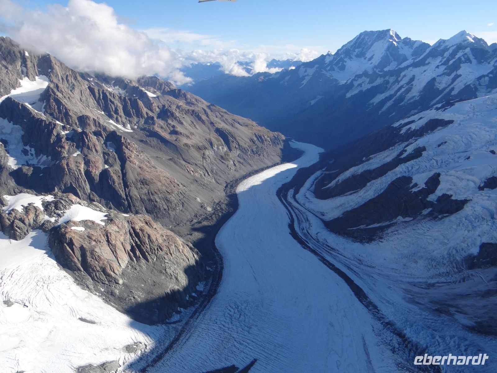 Das Angebot steht, mit einem Propellerflugzeug in die Bergwelt vorzudringen und was wir sehen, ist atemberaubend. Gletscher, Moränen, Gletscherzunge, Faltengebirge, alles mal in der Schule durchgenommen und jetzt versucht das Hirn, in Windeseile das verschüttete Wissen wieder hervorzukramen. Was ist das für eine wunderbare Welt hier oben. Bis zu 600 m dick ist der Tasmen Gletscher. Die weiße dicke Schneehaube lässt das gestauchte Gestein frei, das sich vor Jahrmillionen faltete, zusammensackte, von neuem faltete und sich nach und nach so hoch auftürmte, wie es sich vor dem Fenster des Flugzeugs nun darbietet. Geographieunterricht live. Es ist, wie wenn wir einen Blick in die Schöpfungsgeschichte werfen.