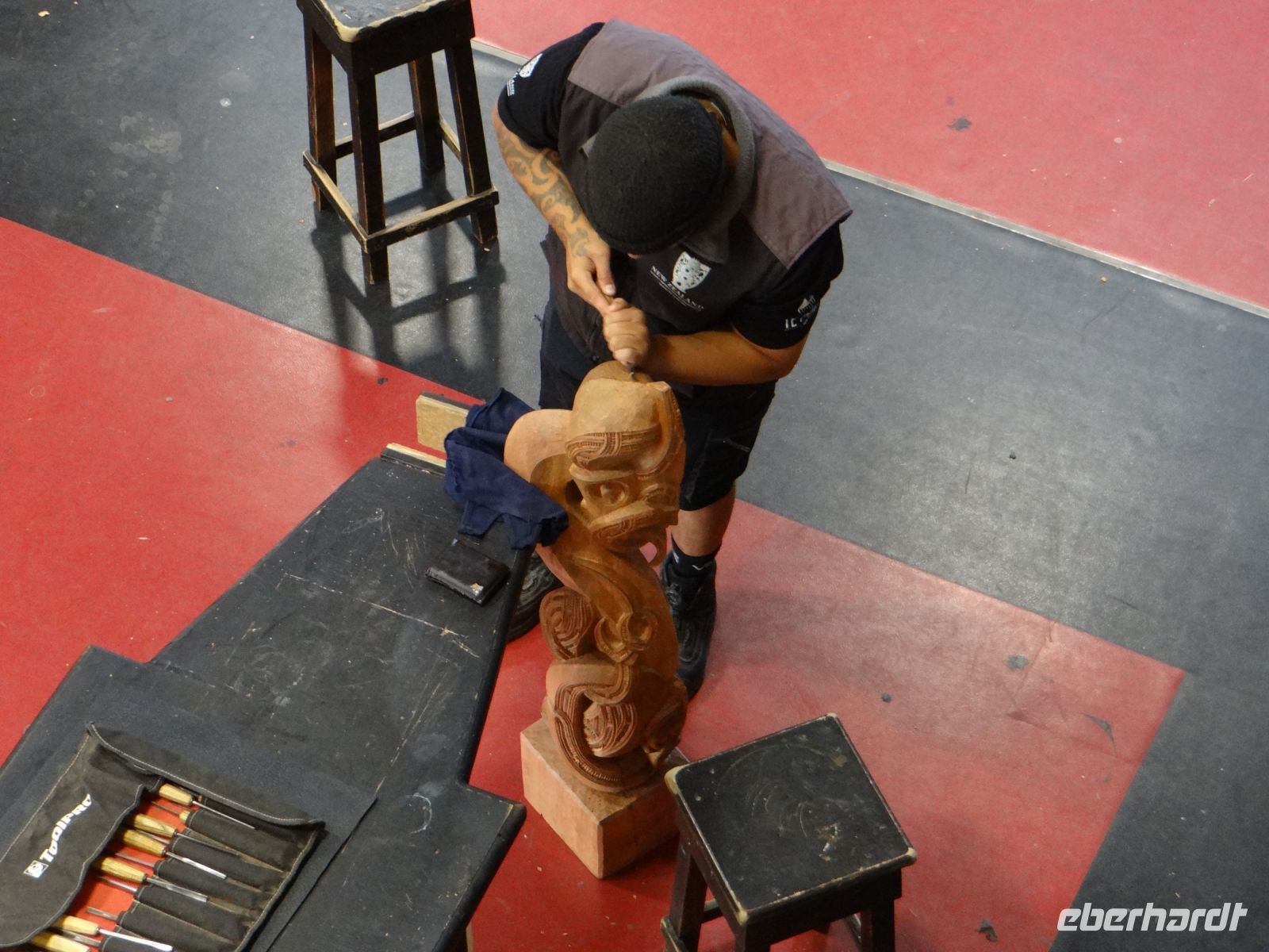 Te Puia ist ein geothermisches Wunderland, über das uns ein Maori führt. Er gehört zu einem Stamm mit 56.000 Mitgliedern. Sein Gesicht ist überzogen mit einer Tätowierung, dem Ta moko. Jedes sieht anders aus, handelt es sich doch um eine individuelle Handarbeit, die etwas über den Träger erzählt, seinen Lebenslauf, die Herkunft abbildet.