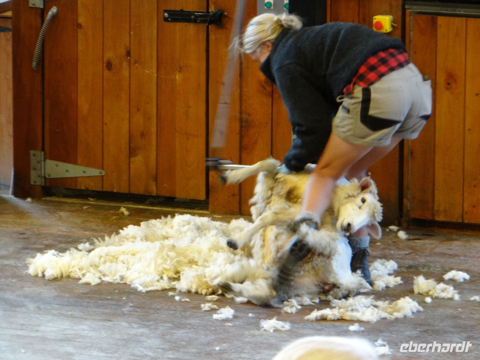 Danach gehen wir zur Schaf-Show, die in einem dafür errichteten Amphitheater stattfindet. Eine junge Frau legt sich das Schaf zu Füssen, das ein wenig belämmert guckt. Keine Kleinigkeit, ein solch großes Tier von allen Seiten zu scheren. Ein Scherer kann 200 – 300 Tieren am Tag das Fell abnehmen – erst den Bauch und die Seiten, das ist die verschmutzte Wolle, dann der Rücken, am besten in einem Vlies. Für ein Kilo Merinowolle erhält man 35 NZD, ungefähr 18 Euro.