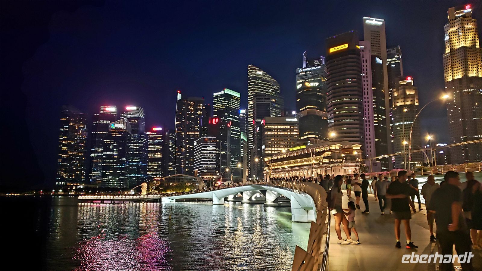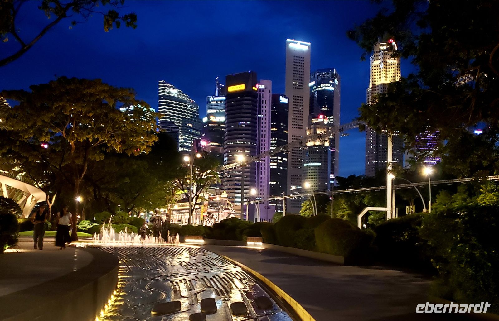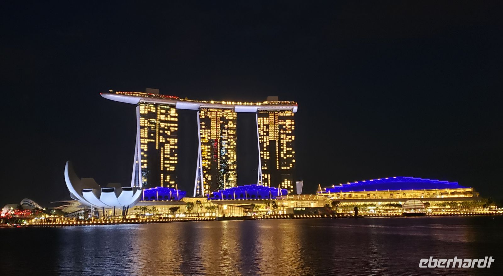 Am Ausgang wartet unser gutgelaunter Guide Alvin und gibt uns im Reisebus zum Hotel schon viele Informationen. Im Hotel vereinbaren wir, uns in einer guten Stunde zu treffen, um die erste Lichtershow vor dem Marina Bay Sands Hotel anzuschauen. Wir gehen ca. 20 Minuten zum Waterfront Theater, wo es Kleinigkeiten zu essen gibt, bevor die Show um 20 Uhr startet. Die bunten Lichter und angestrahlten Wasserspiele sind eher klein und begeistern uns nicht so wirklich, aber der Blick auf das nächtliche Marina Bay Sands Hotel und die Skyline von Singapur sind faszinierend.