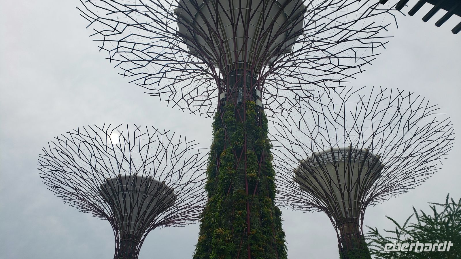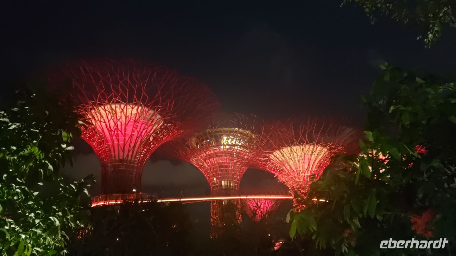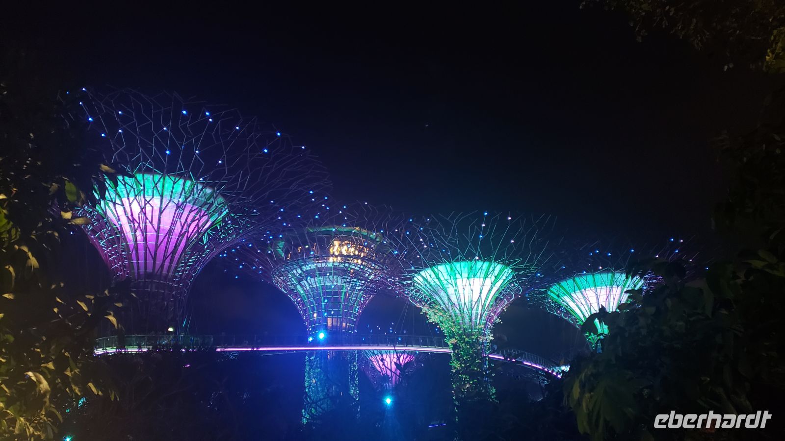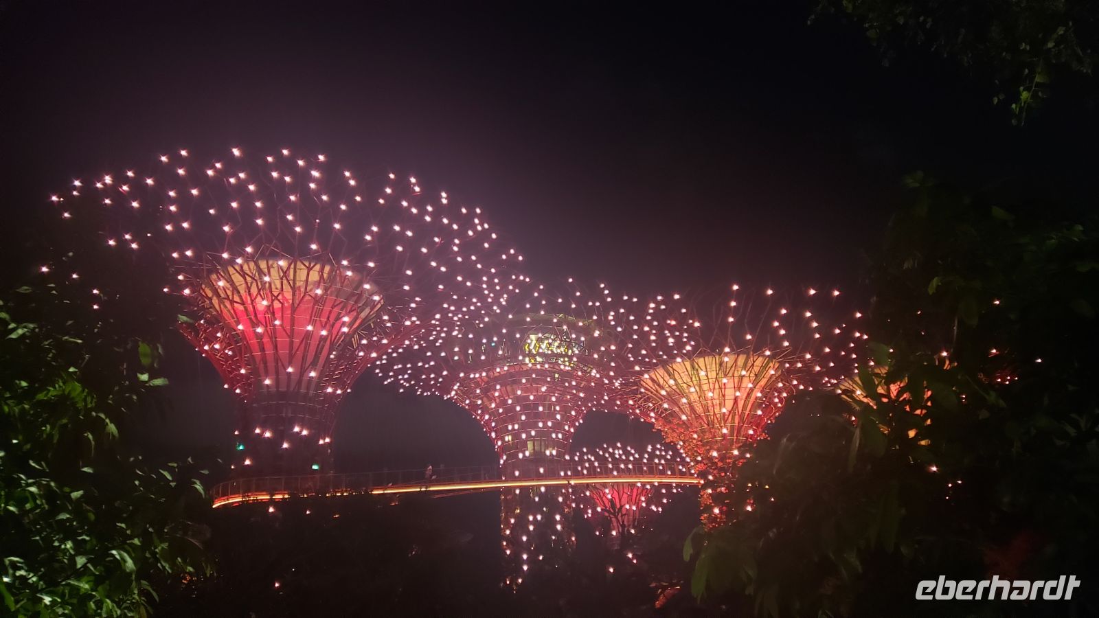 Dann müssen wir uns sputen, um die letzte Lichtershow im Gardens by the Bay zu erleben. Der Fußmarsch über die Brücke um die Bucht herum bis hinter das Marina Bay Hotel dauert eine gute halbe Stunde, auch weil wir um eine Riesenbaustelle herumgehen müssen. Als wir ankommen, hören wir schon klassische Musik und sehen die Riesenbäume aus Stahl in den schönsten, wechselnden Farben beleuchtet. Mit dem Lied Nessun Dorma endet die Show nach 15 Minuten im Glitzerregen. Das war wirklich sehr beeindruckend, wir bedauern, dass wir uns nicht nur für diese Lichtershow entschieden haben und dafür rechtzeitig hingegangen sind. Trotzdem ist es ein schöner Abend, obwohl wir alle ziemlich müde sind von dem Flug und es sehr schwül ist in Singapur. Ein Großteil der Gäste will auch wieder zu Fuß zum Hotel zurückgehen, ein Gast und ich nehmen ein Taxi, was nicht sehr teuer ist. Das war schon der zweite Tag unserer Reise!