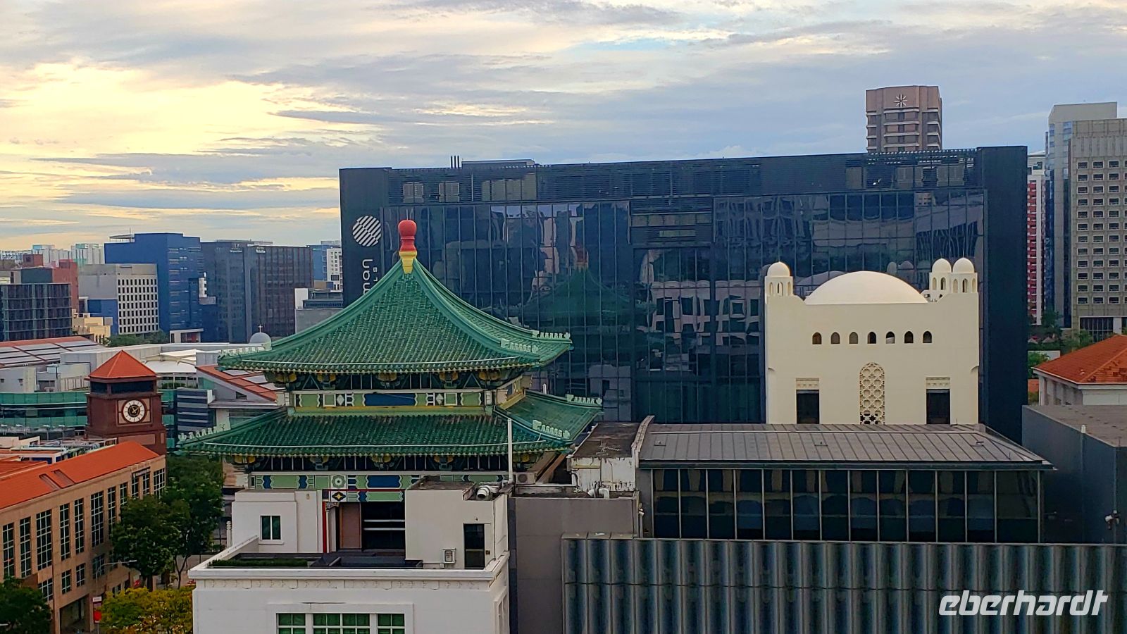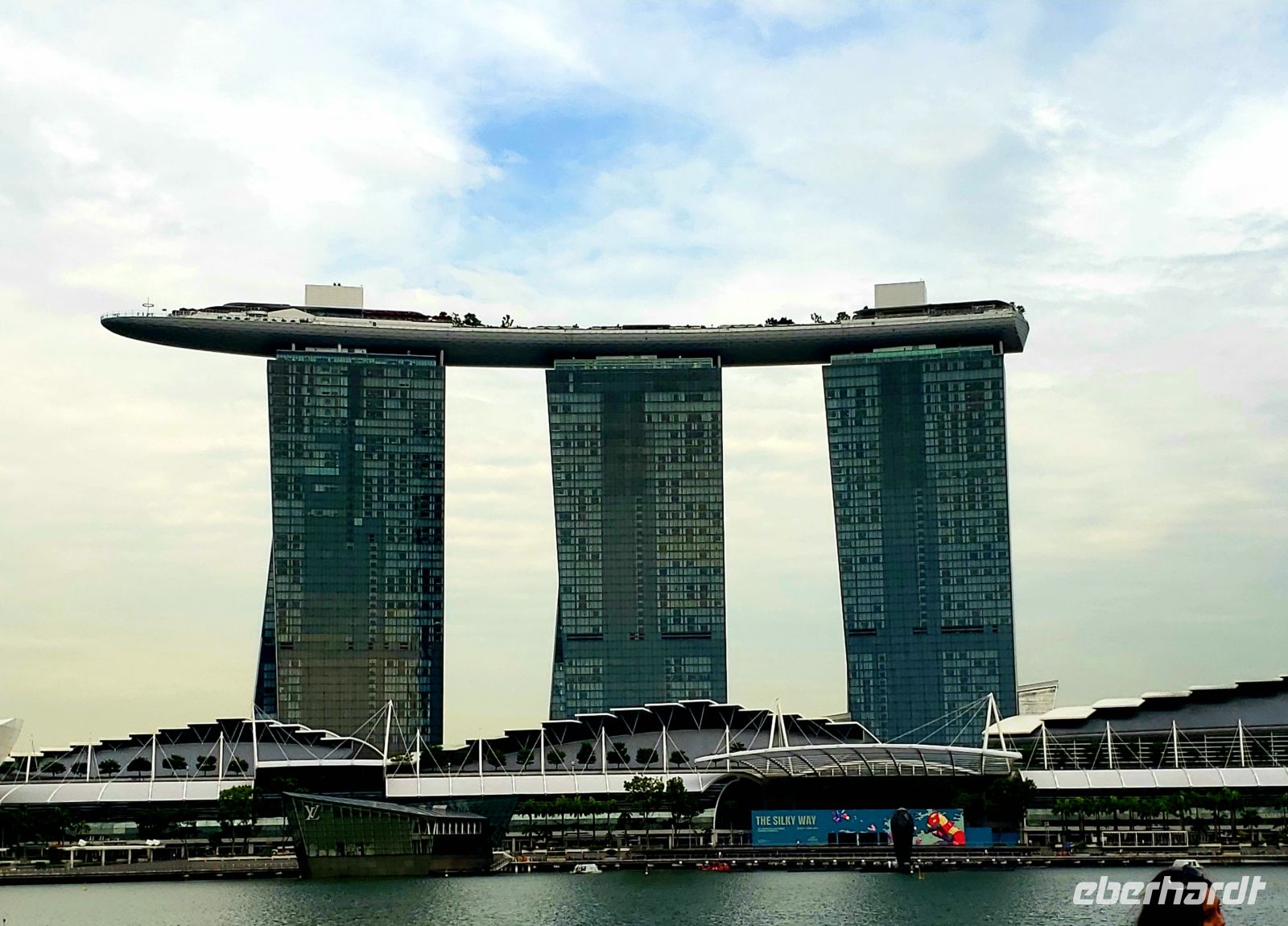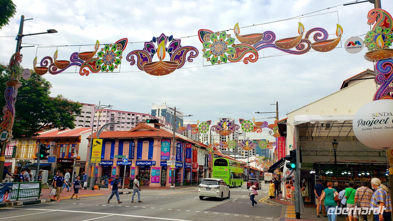 Zu um 12 Uhr sind wir mit Taxen wieder im Hotel, um auszuchecken. Einige Gäste haben sich ausgeruht oder sind in der Umgebung bummeln gegangen. Pünktlich um 13 Uhr kommt Alvin mit dem Bus, wir laden unser Gepäck ein und starten eine große Stadtrundfahrt. Zunächst geht es zum Wahrzeichen Singapurs, dem Marina Bay Sands Hotel, welches am Tage natürlich ganz anders aussieht. Dort fahren wir zur berühmten Aussichtsplattform hinauf, die sich in Form einer langen Schale über die drei Türme des Hotels erstreckt und 300 Meter lang ist. Wir gehen einmal herum und genießen die phänomenale Aussicht von allen Seiten. Anschließend stoppen wir in dem Stadtviertel „Little India" und machen mit Alvin einen kleinen Rundgang.