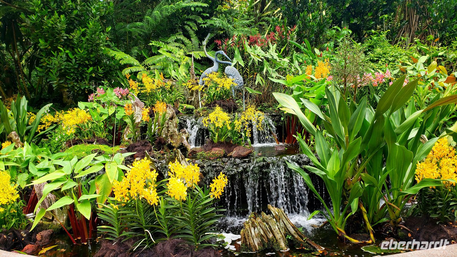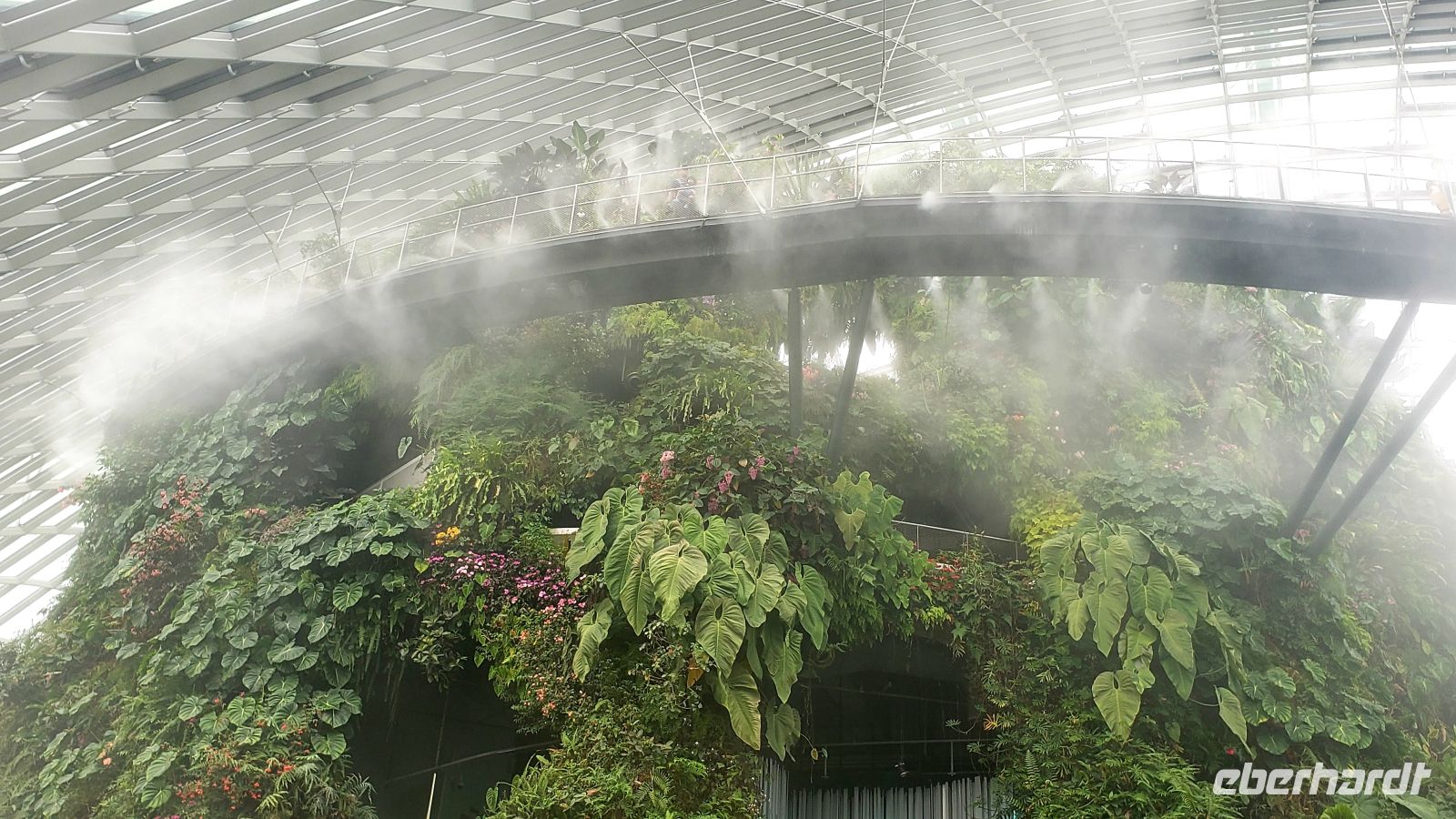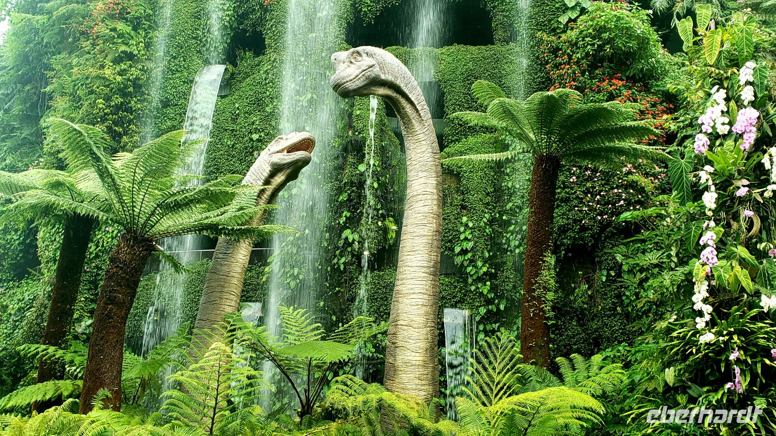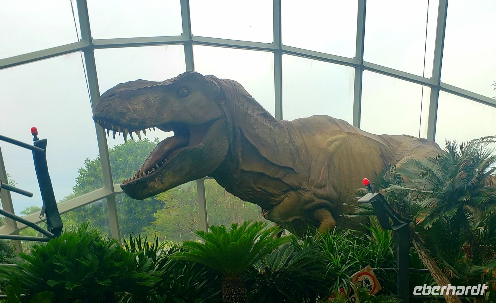 Der heutige Vormittag steht zur freien Verfügung. Nach einem leckeren Frühstück treffen sich die meisten Gäste mit mir in der Lobby und mit drei Taxen fahren wir zum Flower Dome und Cloud Forest. Den Eintritt zahlt jeder selbst und dann tauchen wir ein in die Welt von Jurassic Park und einen tropischen Nebelwald. Selbst wer von den Gästen nicht unbedingt ein Fan von Dinosaurier Filmen ist, zeigt sich begeistert. Die ganze Halle ist großartig gestaltet und überall wabert Nebel durch das Dschungeldickicht, aus dem gelegentlich ein Dinosaurier schaut, das Maul aufreißt und uns böse beäugt. Wir sind alle hin und weg und verbringen über eine Stunde in der Glaskuppel. Dann geht es in die andere Kuppel, dort sind Kakteen, Orchideen und viele andere Pflanzen untergebracht.