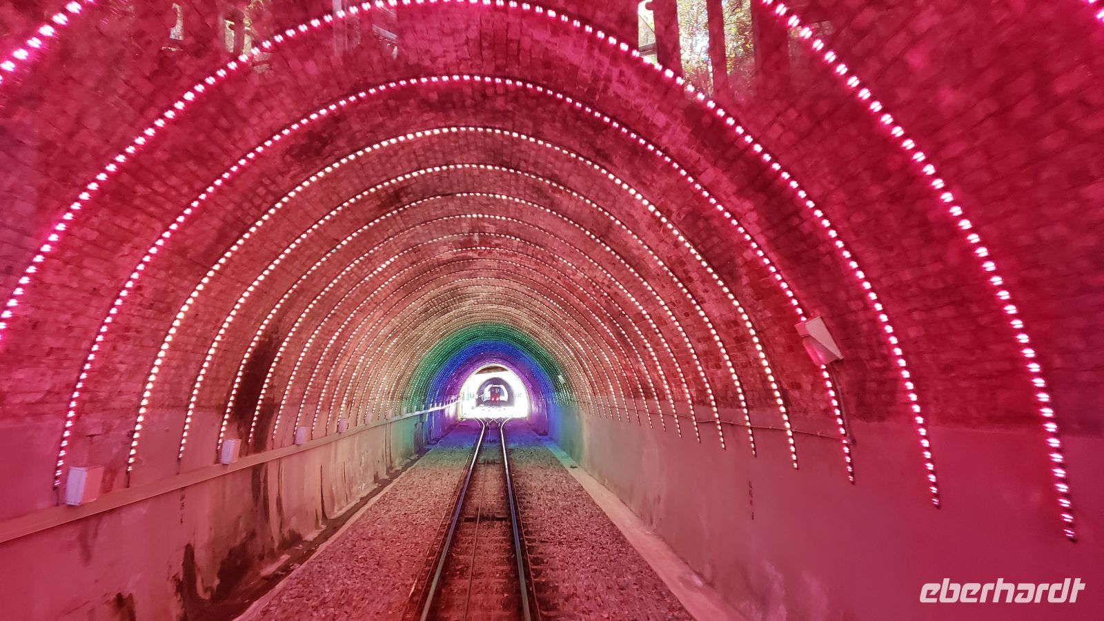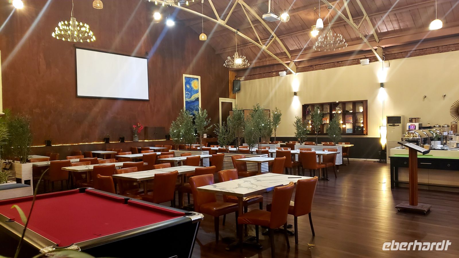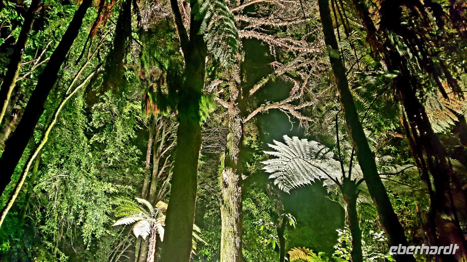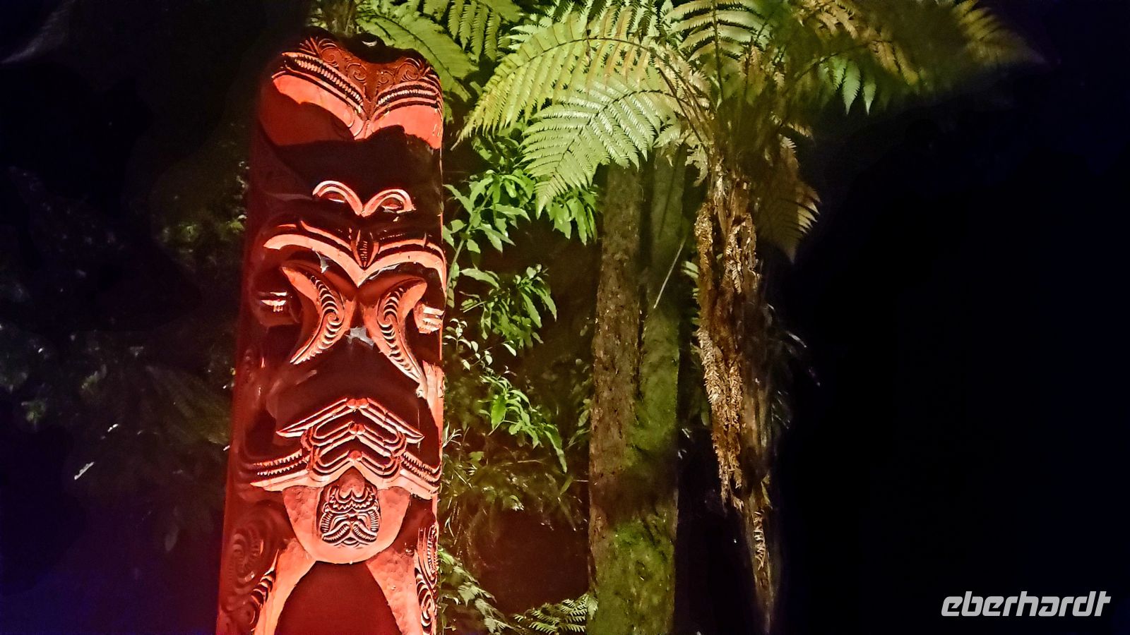 Dann geht es wieder in den großen Speisesaal, wo an drei Ecken das gleiche leckere Hangi-Buffet aufgebaut steht. In der vierten Ecke gibt es die Desserts. Das Buffet ist ausgezeichnet und lässt keine Wünsche offen. Getränke holen wir uns vom Tresen und "pappe satt" geht es weiter, wieder am Fluss entlang, um Glühwürmchen zu bewundern. Bäume und geschnitzte Pfosten sind in buntes Licht getaucht und die Szenerie ist sehr schön. Gegen 21.30 Uhr geht es mit dem Transfer Bus wieder zum Hotel zurück, wo wir mit den vielen Eindrücken Schlafengehen.