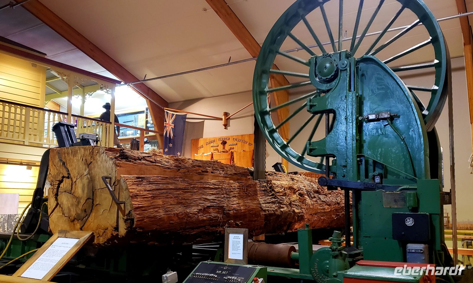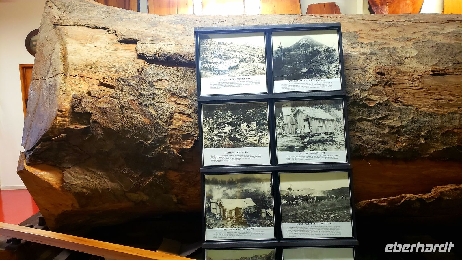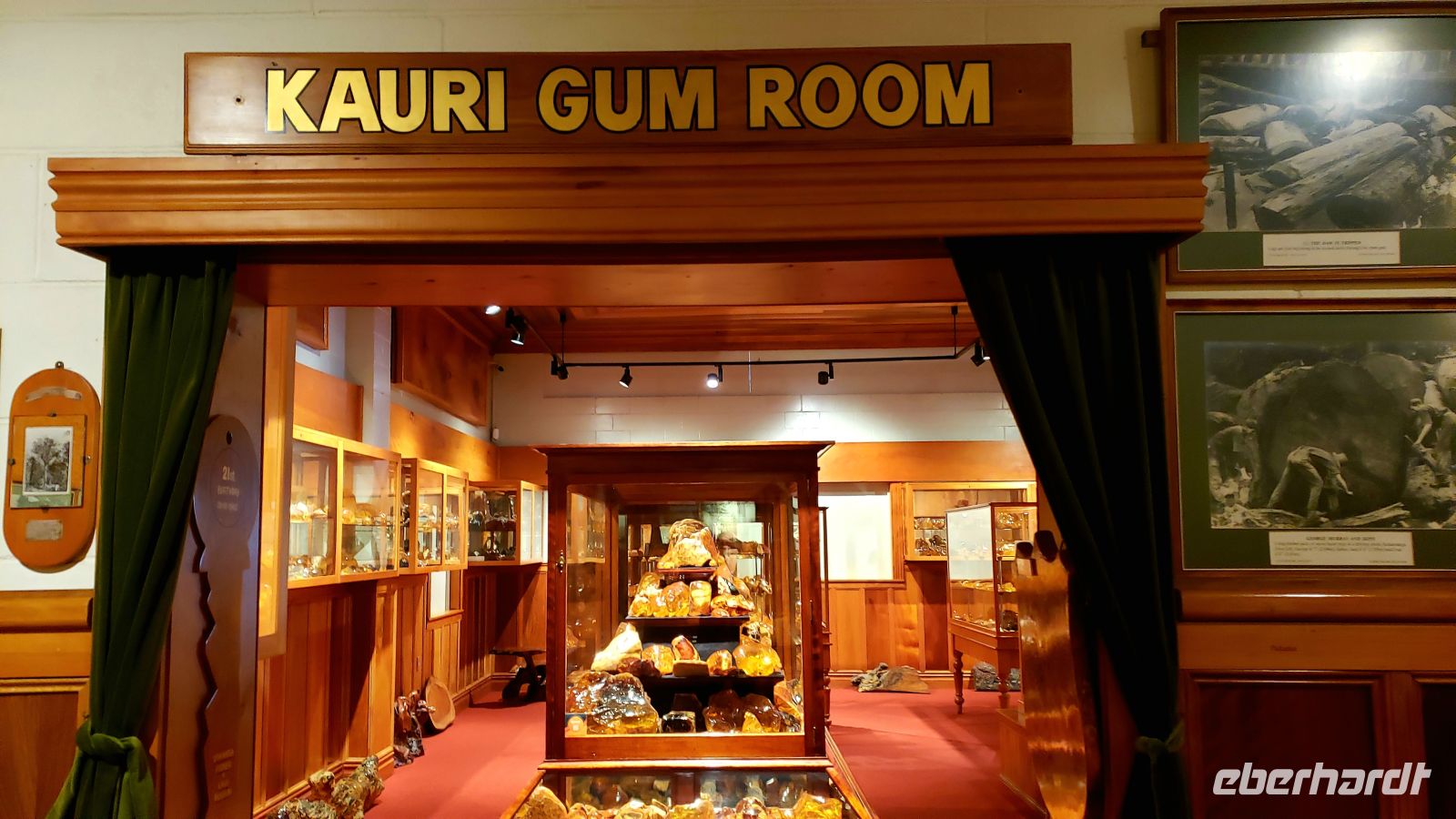 Nachdem wir ein super Frühstücksbuffet im Hotel genossen haben, verlassen wir Auckland pünktlich 8.30 Uhr Richtung Norden. Unser erster Stopp ist das Kauri Museum in Matakohe. Alle Gäste sind überrascht von der Vielfalt des Museums und der liebevollen Gestaltung. Die Leiterin gibt uns eine Einführung in die Ausstellung, welche über die frühere Holzindustrie der Kauribäume informiert und auch wie die Menschen früher lebten. Peter übersetzt für die Gäste und als er ein Klavier aus Kauriholz entdeckt, bekommen wir noch ein kleines Konzert dargeboten. Außerdem gibt es eine schöne Sammlung von Baumharzstücken, die wie Bernstein aussehen. Gegenüber des Museums holen wir uns kleine Snacks und Kaffee aus dem Café. Inzwischen ist auch die Sonne hervorgekommen und die meisten Gäste sitzen draußen.