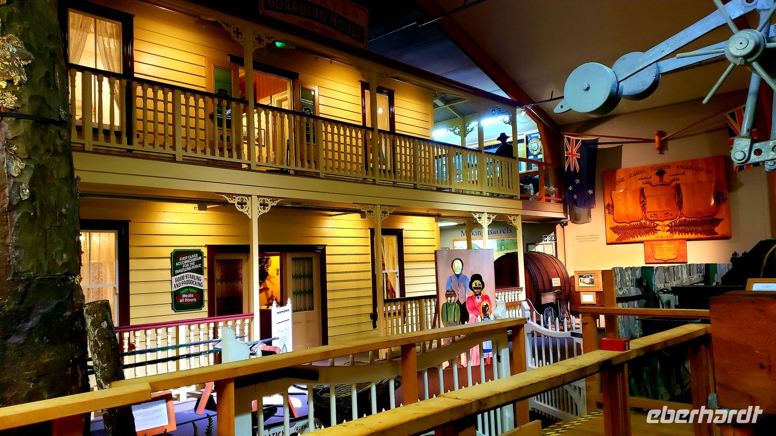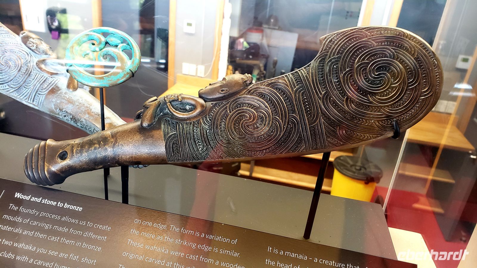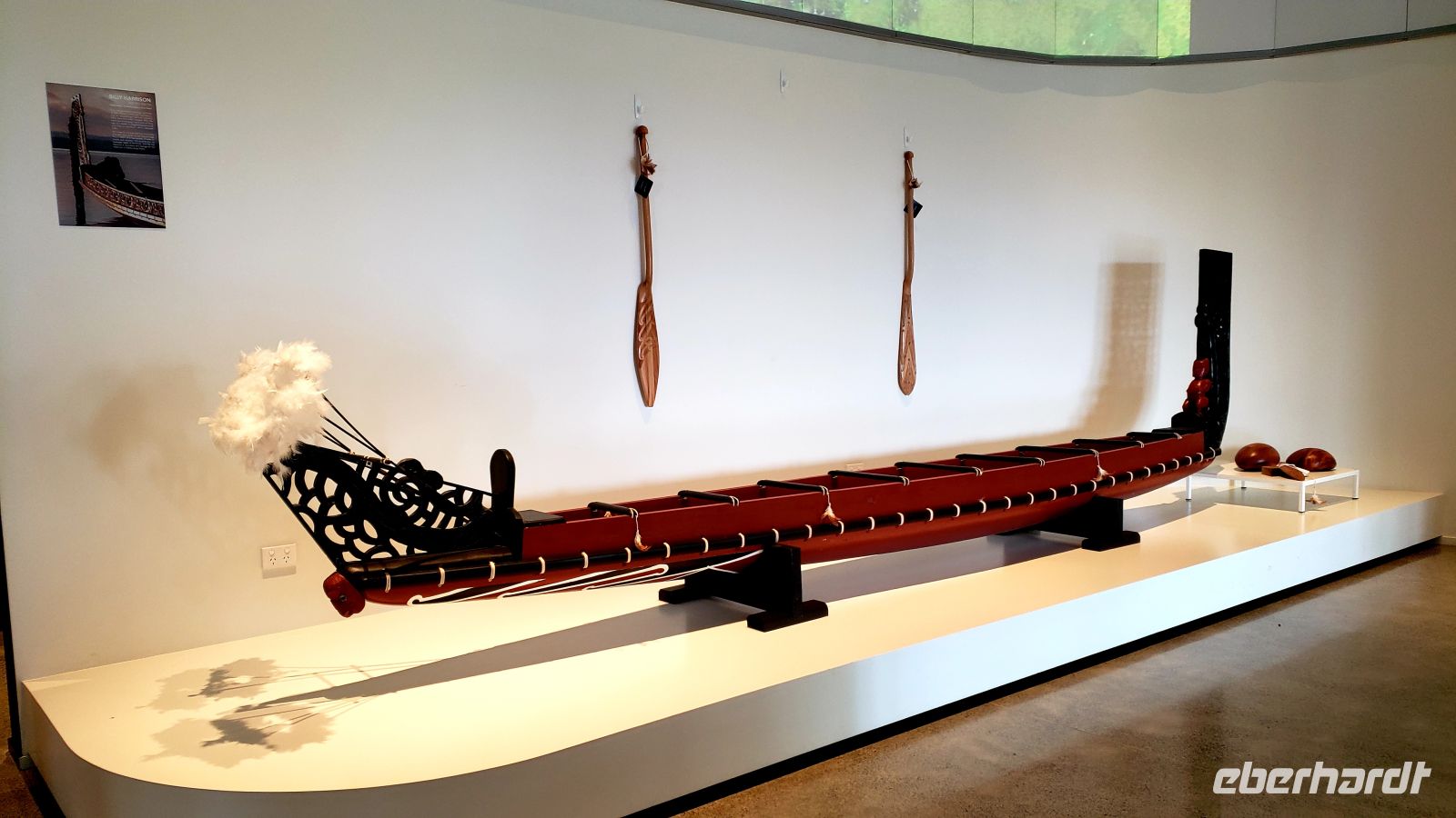 Nachdem wir ein super Frühstücksbuffet im Hotel genossen haben, verlassen wir Auckland pünktlich 8.30 Uhr Richtung Norden. Unser erster Stopp ist das Kauri Museum in Matakohe. Alle Gäste sind überrascht von der Vielfalt des Museums und der liebevollen Gestaltung. Die Leiterin gibt uns eine Einführung in die Ausstellung, welche über die frühere Holzindustrie der Kauribäume informiert und auch wie die Menschen früher lebten. Peter übersetzt für die Gäste und als er ein Klavier aus Kauriholz entdeckt, bekommen wir noch ein kleines Konzert dargeboten. Außerdem gibt es eine schöne Sammlung von Baumharzstücken, die wie Bernstein aussehen. Gegenüber des Museums holen wir uns kleine Snacks und Kaffee aus dem Café. Inzwischen ist auch die Sonne hervorgekommen und die meisten Gäste sitzen draußen.