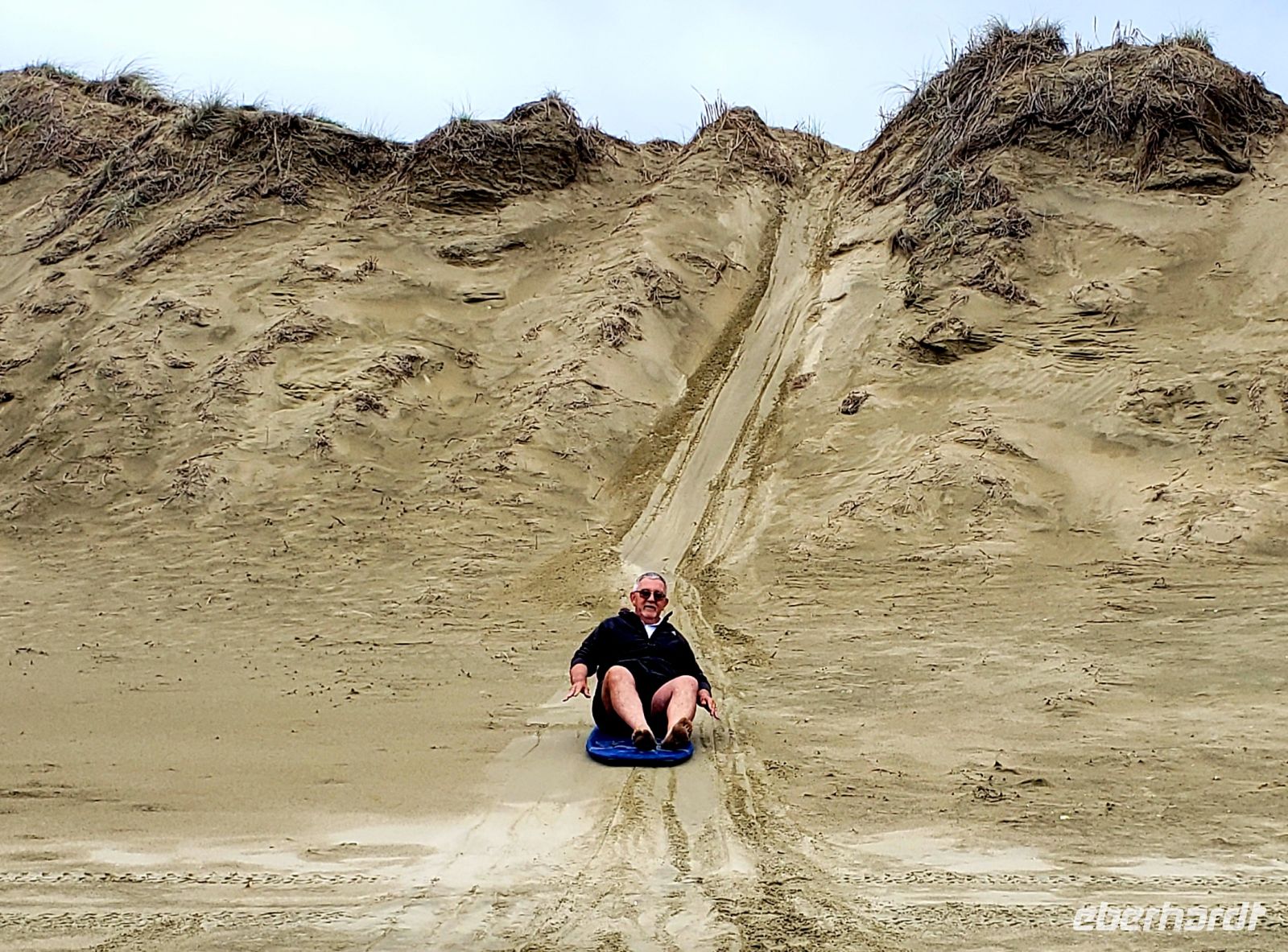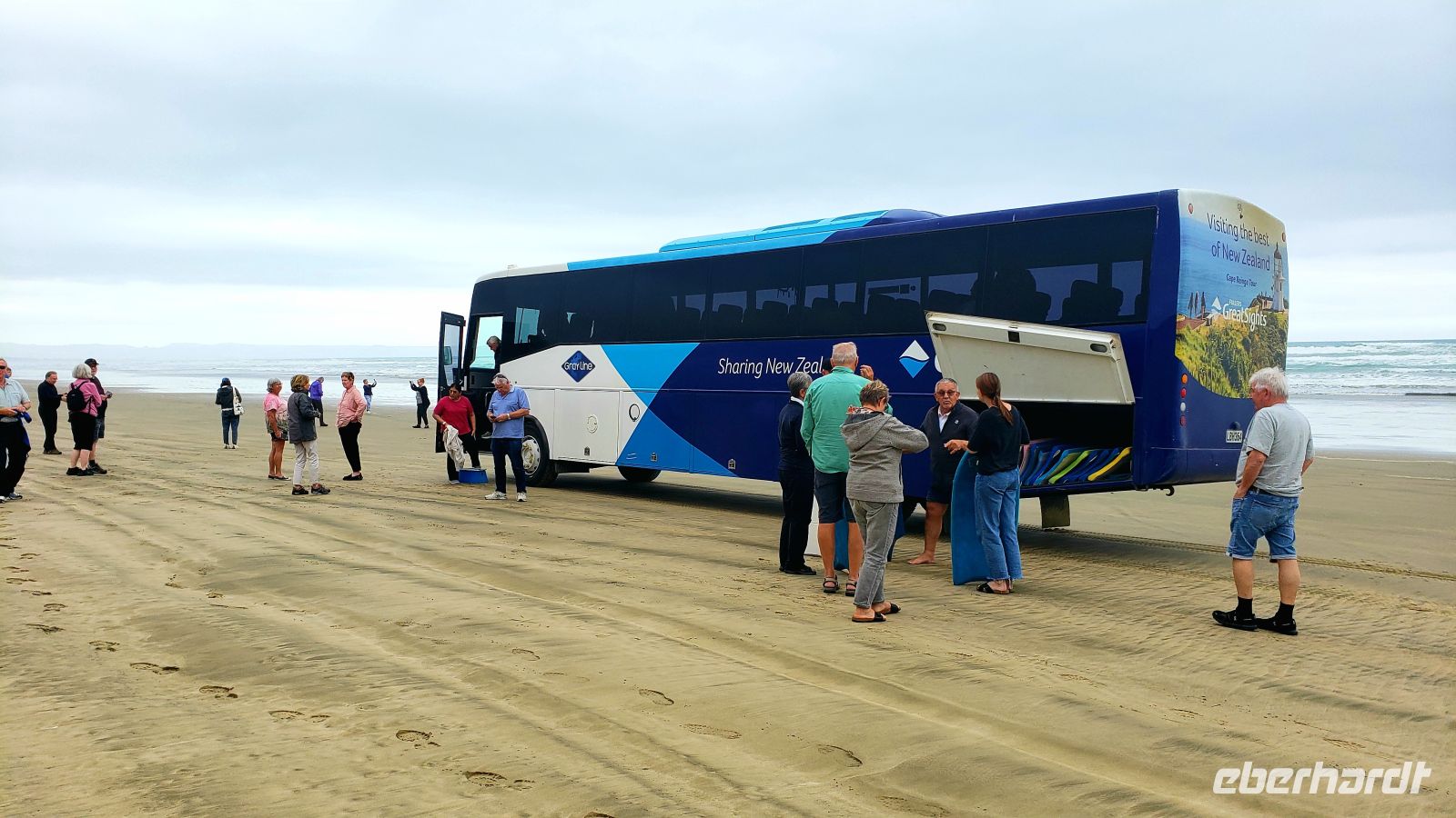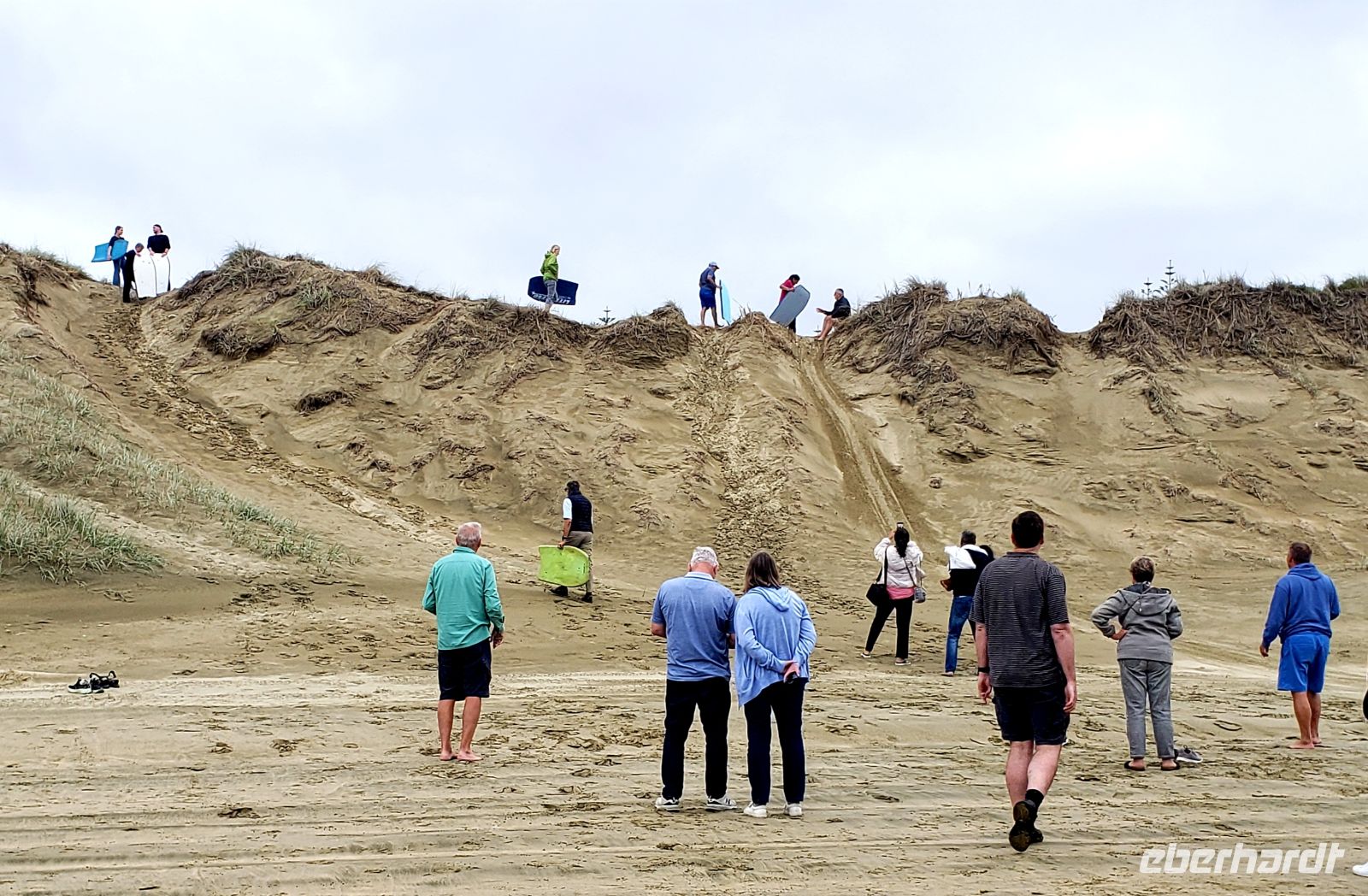 Nach einer Stunde geht es weiter zu einem Strand in der Nähe, wo wir an Picknicktischen leckere Chicken Wraps bekommen von unserem Guide und Fahrer Barry. Barry ist eine Seele von Mensch, die ganze Fahrt über erzählt er Geschichten, Anekdoten und Historisches über die Region, leider auf Englisch und ich kann während der Fahrt nicht übersetzen, da noch fremde Gäste in dem Bus mitfahren. Nach der Mittagspause geht es weiter zum 90 Mile Beach. Mit dem Bus fahren wir diverse Kilometer direkt auf dem Strand entlang, dann steigen wir aus und wer will, kann mit Boards die Sanddünen herunterrutschen. Das gibt viel Gejuchzte und Freude. Nach einem erneuten Stopp in dem Café mit dem Kauribaum geht es direkt zurück zum Hotel, wo wir gegen 18 Uhr ankommen. Wir haben insgesamt gut acht Stunden im Bus gesessen, aber hätten wir den Ort missen wollen? Die meisten Gäste sind froh, sich für diesen Ausflug entschieden zu haben.