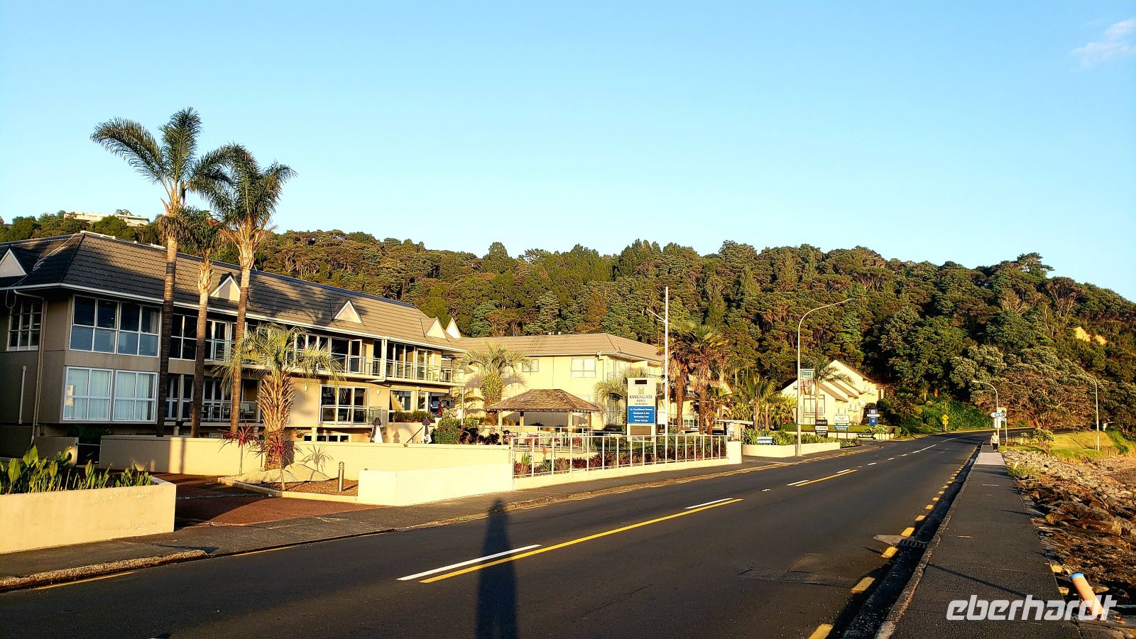 Dann geht es weiter nach Pauanui, wo wir gegen 18 Uhr einchecken. Vorher haben wir noch am Supermarkt einen Stopp eingelegt. Es ist eine wunderschöne Ferienhausanlage, wir werden alle in Apartments untergebracht mit eigener Küche und das Frühstück steht schon vorbereitet im Kühlschrank. Einige Gäste kommen noch mit mir in ein Restaurant um die Ecke, wo wir draußen mit Heizstrahlern sehr gemütlich sitzen. Die anderen Gäste wollen lieber in ihrer "Wohnung" ein Abendbrot genießen. Wieder geht ein schöner Tag zu Ende!