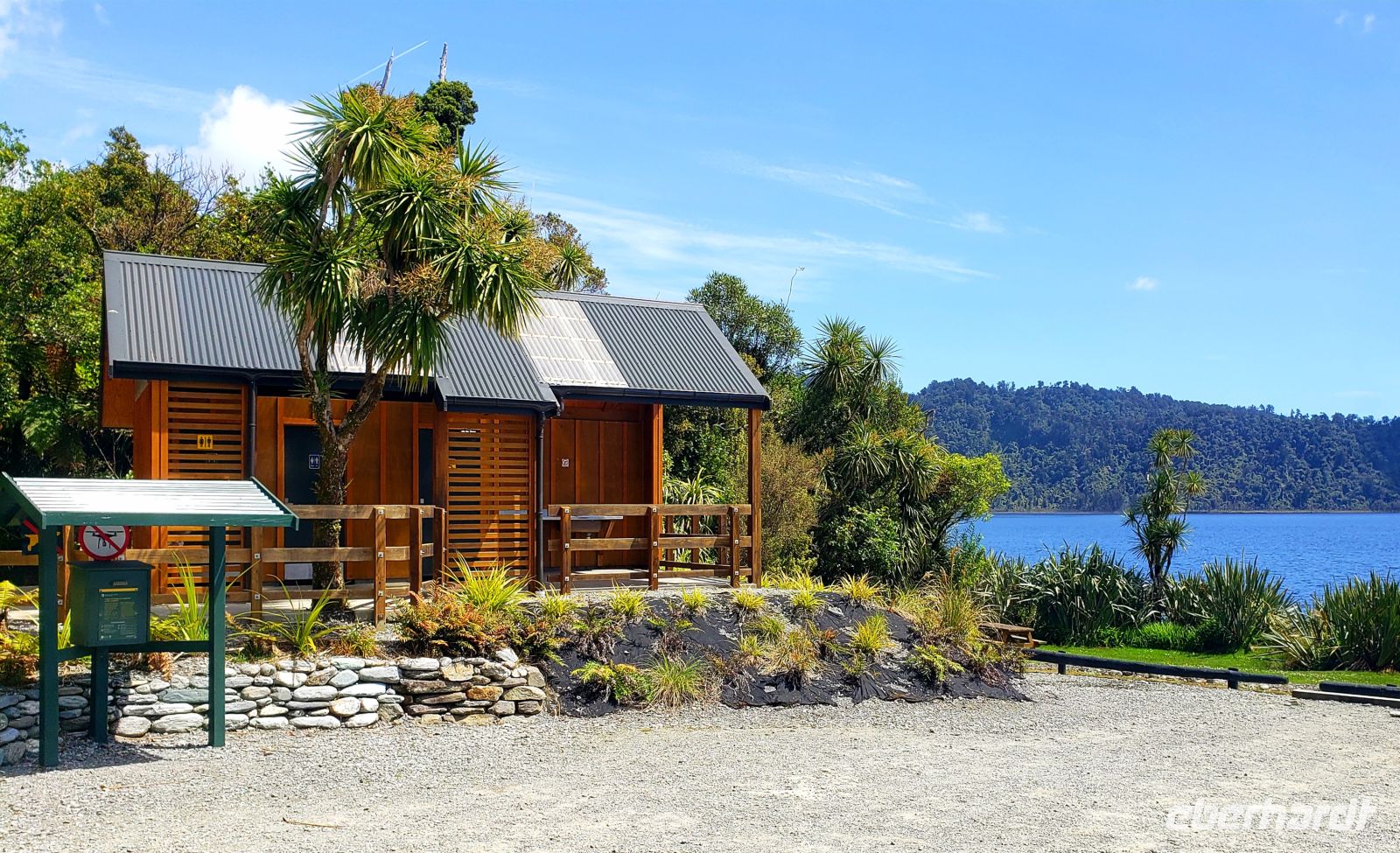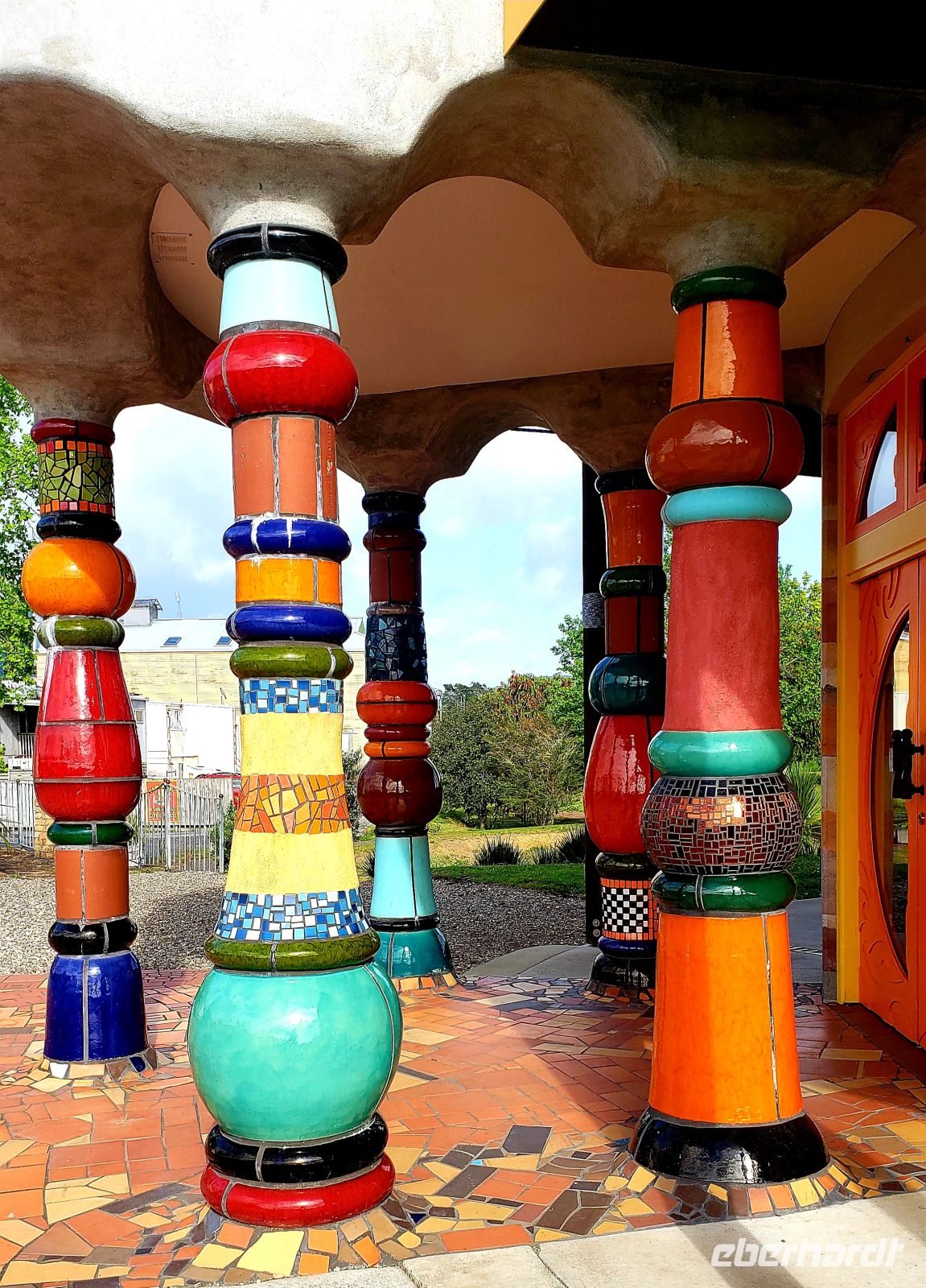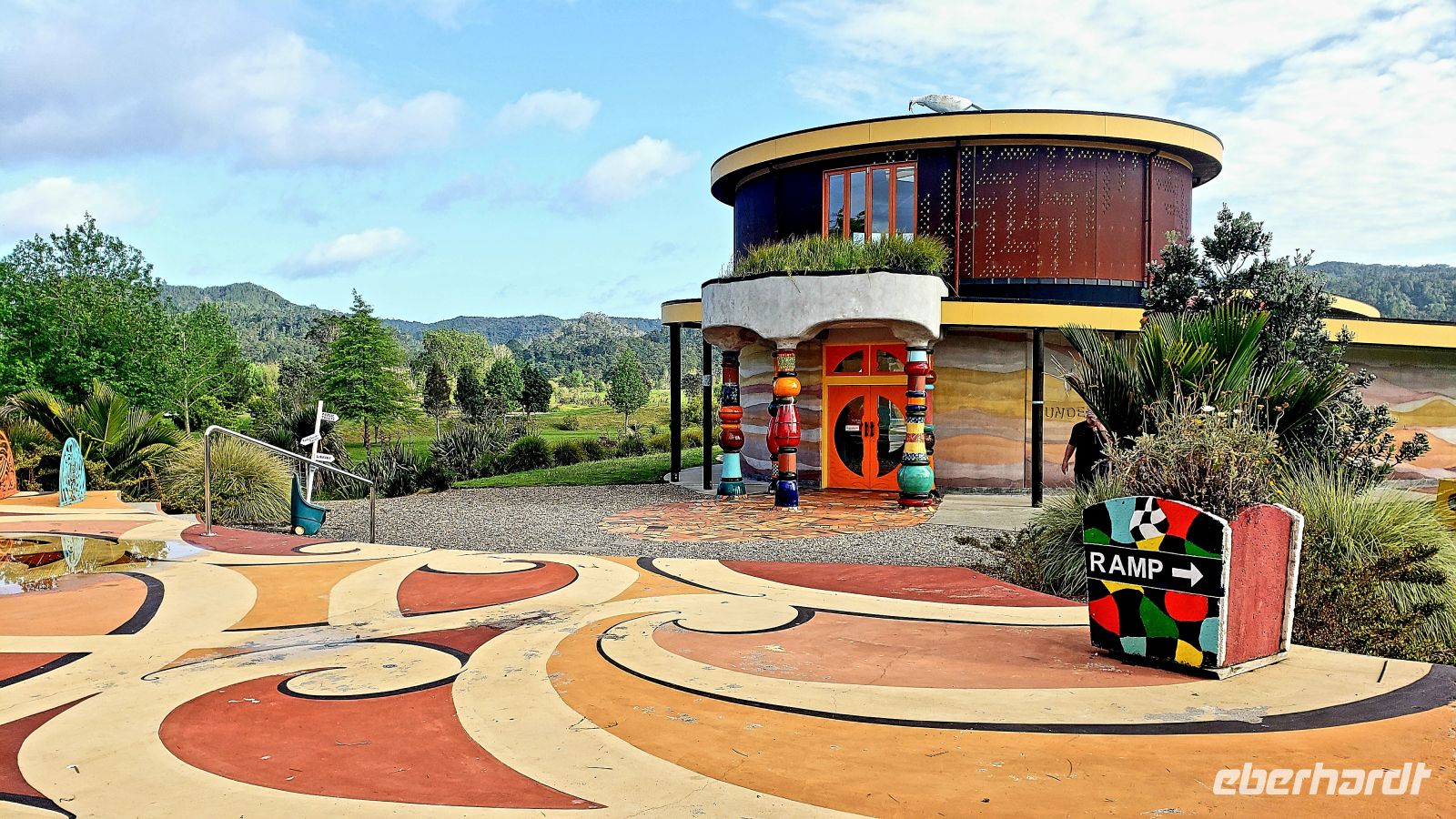 Die Sonne strahlt, das Frühstück ist wieder lecker und alle haben gute Laune. Heute steht viel Busfahren auf dem Programm, um nach Pauanui zu kommen, aber mit Peters Informationen und vielen Fotostopps wird der Tag sehr entspannt und kurzweilig. Zunächst halten wir an den "Hundertwasser Toiletten", welche sich in Kawakawa in der Nähe von Paihia befinden. Friedensreich Hundertwasser hat hier lange gelebt und ist auf seinem privaten Grundstück begraben. Die Toiletten sind wohl die meistbesuchten Sanitäranlagen Neuseelands! Für den kleinen Ort eine echte Touristenattraktion.
