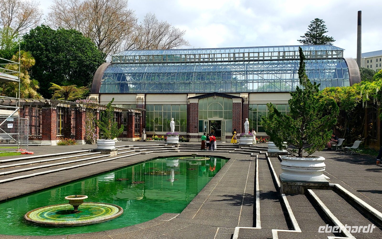 Dann geht es weiter mit Fotostopps entlang der Küste bis Auckland. Hier holen wir die Stadtrundfahrt vom Ankunftstag nach, wo es ja geregnet hat. Mittagspause machen wir am Auckland Museum, wir gehen nicht ins Museum, aber genießen die Aussicht, stöbern im Museumsshop und schauen uns die zwei Pflanzengewächshäuser an. In einem Café sitzen wir sehr schön draußen und genießen eine kleine Mahlzeit.